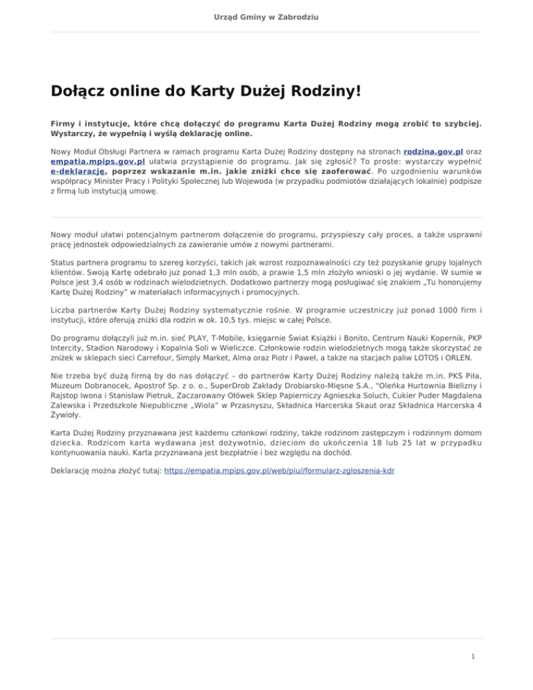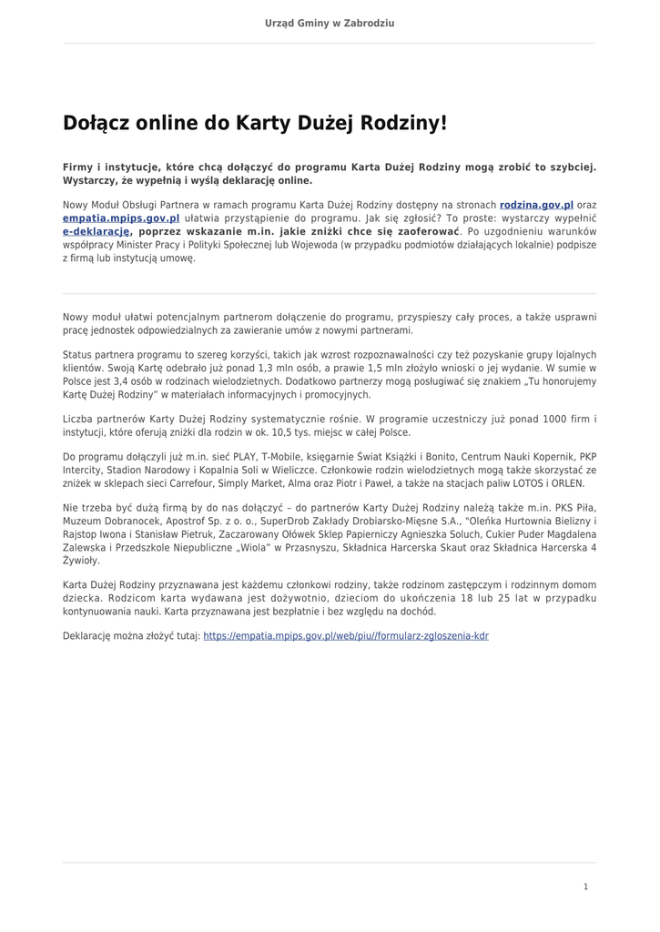 Urząd Gminy w Zabrodziu Dołącz online do Karty Dużej Rodziny! Firmy i instytucje, które chcą dołączyć do programu Karta Dużej Rodziny mogą zrobić to szybciej. Wystarczy, że wypełnią i wyślą deklarację online. Nowy Moduł Obsługi Partnera w ramach programu Karta Dużej Rodziny dostępny na stronach rodzina.gov.pl oraz empatia.mpips.gov.pl ułatwia przystąpienie do programu. Jak się zgłosić? To proste: wystarczy wypełnić e-deklarację, poprzez wskazanie m.in. jakie zniżki chce się zaoferować. Po uzgodnieniu warunków współpracy Minister Pracy i Polityki Społecznej lub Wojewoda (w przypadku podmiotów działających lokalnie) podpisze z firmą lub instytucją umowę. Nowy moduł ułatwi potencjalnym partnerom dołączenie do programu, przyspieszy cały proces, a także usprawni pracę jednostek odpowiedzialnych za zawieranie umów z nowymi partnerami. Status partnera programu to szereg korzyści, takich jak wzrost rozpoznawalności czy też pozyskanie grupy lojalnych klientów. Swoją Kartę odebrało już ponad 1,3 mln osób, a prawie 1,5 mln złożyło wnioski o jej wydanie. W sumie w Polsce jest 3,4 osób w rodzinach wielodzietnych. Dodatkowo partnerzy mogą posługiwać się znakiem „Tu honorujemy Kartę Dużej Rodziny” w materiałach informacyjnych i promocyjnych. Liczba partnerów Karty Dużej Rodziny systematycznie rośnie. W programie uczestniczy już ponad 1000 firm i instytucji, które oferują zniżki dla rodzin w ok. 10,5 tys. miejsc w całej Polsce. Do programu dołączyli już m.in. sieć PLAY, T-Mobile, księgarnie Świat Książki i Bonito, Centrum Nauki Kopernik, PKP Intercity, Stadion Narodowy i Kopalnia Soli w Wieliczce. Członkowie rodzin wielodzietnych mogą także skorzystać ze zniżek w sklepach sieci Carrefour, Simply Market, Alma oraz Piotr i Paweł, a także na stacjach paliw LOTOS i ORLEN. Nie trzeba być dużą firmą by do nas dołączyć – do partnerów Karty Dużej Rodziny należą także m.in. PKS Piła, Muzeum Dobranocek, Apostrof Sp. z o. o., SuperDrob Zakłady Drobiarsko-Mięsne S.A., "Oleńka Hurtownia Bielizny i Rajstop Iwona i Stanisław Pietruk, Zaczarowany Ołówek Sklep Papierniczy Agnieszka Soluch, Cukier Puder Magdalena Zalewska i Przedszkole Niepubliczne „Wiola” w Przasnyszu, Składnica Harcerska Skaut oraz Składnica Harcerska 4 Żywioły. Karta Dużej Rodziny przyznawana jest każdemu członkowi rodziny, także rodzinom zastępczym i rodzinnym domom dziecka. Rodzicom karta wydawana jest dożywotnio, dzieciom do ukończenia 18 lub 25 lat w przypadku kontynuowania nauki. Karta przyznawana jest bezpłatnie i bez względu na dochód. Deklarację można złożyć tutaj: https://empatia.mpips.gov.pl/web/piu//formularz-zgloszenia-kdr 1