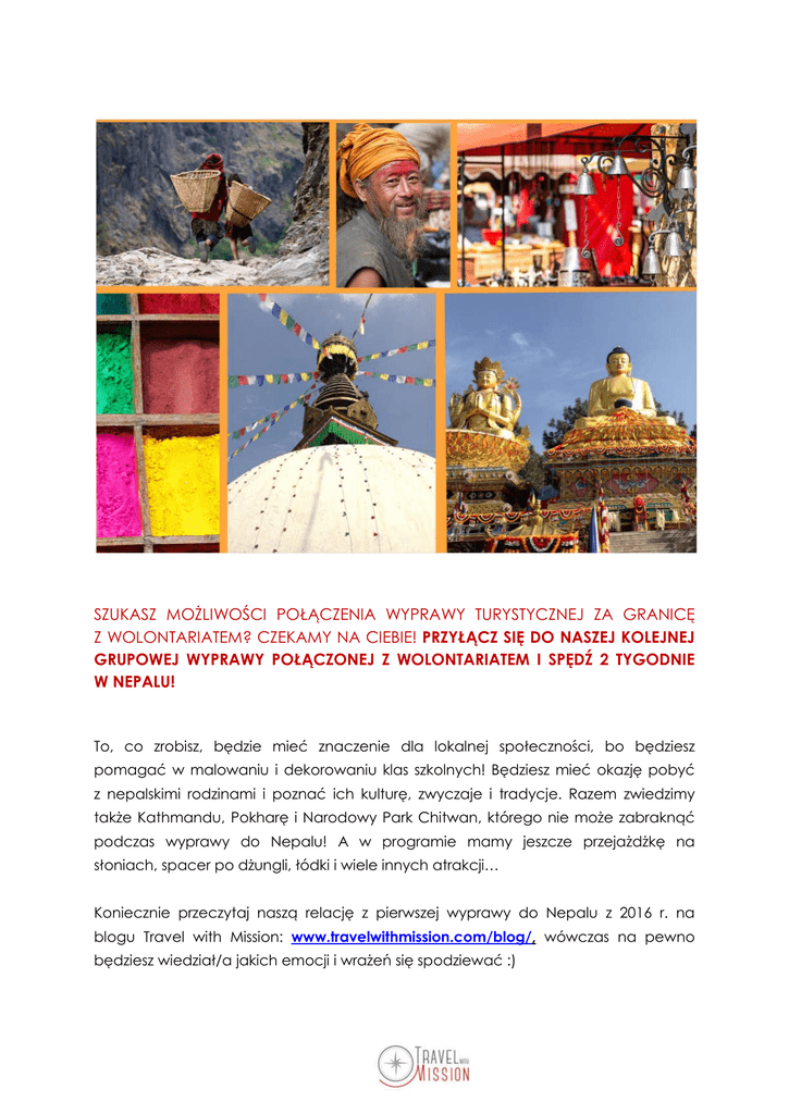 SZUKASZ MOŻLIWOŚCI POŁĄCZENIA WYPRAWY TURYSTYCZNEJ ZA GRANICĘ Z WOLONTARIATEM? CZEKAMY NA CIEBIE! PRZYŁĄCZ SIĘ DO NASZEJ KOLEJNEJ GRUPOWEJ WYPRAWY POŁĄCZONEJ Z WOLONTARIATEM I SPĘDŹ 2 TYGODNIE W NEPALU! To, co zrobisz, będzie mieć znaczenie dla lokalnej społeczności, bo będziesz pomagać w malowaniu i dekorowaniu klas szkolnych! Będziesz mieć okazję pobyć z nepalskimi rodzinami i poznać ich kulturę, zwyczaje i tradycje. Razem zwiedzimy także Kathmandu, Pokharę i Narodowy Park Chitwan, którego nie może zabraknąć podczas wyprawy do Nepalu! A w programie mamy jeszcze przejażdżkę na słoniach, spacer po dżungli, łódki i wiele innych atrakcji… Koniecznie przeczytaj naszą relację z pierwszej wyprawy do Nepalu z 2016 r. na blogu Travel with Mission: www.travelwithmission.com/blog/, wówczas na pewno będziesz wiedział/a jakich emocji i wrażeń się spodziewać :) A oto kilka wypowiedzi naszych wolontariuszek, które zapytane o to, czy zamierzają powtórzyć doświadczenie, odpowiedziały tak: „Tak, tak i jeszcze raz tak! I będę gorąco namawiać do takiego czynnego wypoczynku także innych. A jak się dowiem, że planowany jest wyjazd z tą samą ekipą - to nawet nie będę pytała, dokąd jedziemy ;)” - Monika „Grupa 6 dziewczyn, które wyjątkowo przypadły sobie do gustu. Łączyło nas poczucie humoru, wspierałyśmy się w przypadku niewielkich niedyspozycji zdrowotnych, codziennie, po trochu odkrywałyśmy się. Z pewnością nie stracimy ze sobą kontaktu.” - Małgosia „Nie znałyśmy się przed wyjazdem, poznałyśmy się dopiero na hali odlotów na Okęciu. Mam nadzieję, że nie tylko będziemy utrzymywały kontakt, ale niejedną szkołę jeszcze odmalujemy :)” - Marta Proponowany termin wyprawy to 30.09 – 13.10.2017 r. PROGRAM WYPRAWY DO NEPALU: Dzień 1 - Wylot z Warszawy Dzień 2 – Przylot do Katmandu. Zakwaterowanie i kolacja w jednej z licznych restauracji na Thamelu – turystycznej dzielnicy Katmandu. Dzień 3 - zwiedzanie Katmandu z przewodnikiem: Durbar Squer – najstarsza część miasta z pałacem królewskim i licznymi świątyniami w tym słynną świątynią żywej bogini Kumari; Bodnath – centrum życia buddyjskiego i dzielnica tybetańskich uchodźców; Swayambhunath – zwana również świątynią małp, jedno z najważniejszych miejsc kultu w Nepalu, ważne zarówno dla buddystów jak i hinduistów; Świątynia Paśupatinath – miejsce szczególnie czczone przez hinduistów w pobliżu którego znajduje się miejsce kremacji zwłok. Lunch w tybetańskiej części miasta Bodnath w jednej z licznych restauracji usytuowanych na dachu z pięknym widokiem na stupę. Kolacja i nocleg na Thamelu. Dzień 4 - Opuszczamy Katmandu i udajemy się na poł.-zachód w kierunku miasta Pokhara. Popołudniowe zwiedzanie i kolacja w jednej z licznych restauracji w Pokharze. Dzień 5 - Dziś wybierzemy się kilkugodzinny trekking w okolicach Pokhary – będziemy mijać okoliczne wioski i świątynie ale z pewnością największe wrażenie zrobi ośnieżony masyw Annapurny, odbijający się w tafli jeziora Phewa… Po południu spotkamy się z przedstawicielami lokalnej organizacji pozarządowej, z którą przez następne dni będziemy pracować w formie wolontariatu. Wieczorem wspólna kolacja z całym zespołem w kawiarni nad brzegiem jeziora. Dzień 6 – O świcie spacer na wzgórze Sarangkot i oglądanie wschodu słońca; po śniadaniu zwiedzanie okolic Pokhara wspólnie przedstawicielem naszej lokalnej organizacji. Po południu warsztaty dotyczące kultury i języka nepalskiego. Wieczorem kolacja u rodzin nepalskich. Dzień 7 – po śniadaniu z rodziną nepalską udamy się do szkoły Mani Jyoti Lower Secondary School Sarangkot, gdzie wspólnie z lokalną organizacją będziemy w ramach wolontariatu malować sale szkolne. Lunch zjemy w szkole. Po południu ciąg dalszy prac w szkole. Dzień 8 – ciąg dalszy prac wolontariackich w szkole; po południu możliwość animacji czasu wolnego dla dzieci ze szkoły. Możliwość rozegrania meczu z dziećmi. Dzień 9 - wolontariat w szkole podstawowej Sijana Primari School Lalagau w Pokhara – pomoc przy naprawie schodów oraz malowanie ścian w klasie maluchów. Po południu udział w kampanii informującej najmłodsze dzieci, jak dbać o higienę jamy ustnej i prawidłowo myć swoje zęby (dzieci dostaną od nas szczoteczki i pasty do zębów). Dzień 10 – wyjeżdżamy z Pokhary i udajemy się do Narodowego Parku Chitwan. Po przyjeździe, zakwaterowaniu i zjedzeniu lunchu udamy się na spacer, aby zwiedzić wioskę. Potem romantyczny zachód słońca nad rzeką. Wieczorem obejrzymy pokazy tańców. Chitwan to wspaniałe miejsce do obserwacji wielu gatunków zwierząt i ptaków, ale główna atrakcją są oczywiście nosorożce. Można je oglądać wędrując przez dżunglę na piechotę, płynąc łodzią lub odbywając „przechadzkę” na grzbiecie słonia. Wrażenia ze spotkania z tymi ogromnymi ssakami są niepowtarzalne! Dzień 11 – po śniadaniu wyruszymy na wyprawę na łódkach, potem spacer w dżungli. Po lunchu odwiedzimy Centrum Hodowli Słoni i pojeździmy na słoniach;) Dzień 12 – po śniadaniu opuszczamy Chitwan i wyruszamy do Kathmandu. Kolację zjemy już w stolicy Nepalu. Dzień 13 – wspólne zakupy w Katmandu, czas wolny, wieczorem wylot z Katmandu Dzień 14 – powrót do Polski *Z uwagi na charakter wyprawy możliwe są nieznaczne odstępstwa od programu, nie wpływające jednakże na jego zasadniczy kształt i jakość. Cena dla 1 osoby: 1400 USD + bilet Warszawa – Katmandu – Warszawa (cena biletu w promocji Qatar Airways w 2016 wyniosła 2500 PLN, cena regularna ok. 3500 PLN) Uwaga, wyjazd będzie realizowany już nawet przy zebraniu się małej 6-osobowej grupy! Jeśli grupa będzie zgodna, to możliwe jest zamiana transferu busem Kathmandu – Pokhara (ok. 8 godz. jazdy busem) na lot na tej trasie – za dodatkową opłatą. W cenie