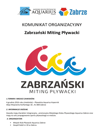 KOMUNIKAT ORGANIZACYJNY Zabrzański Miting Pływacki 1.TERMIN I MIEJSCE ZAWODÓW. 4 grudnia 2016 roku (niedziela) – Pływalnia Aquarius Kopernik Aleja Wojciecha Korfantego 18 , 41-800 Zabrze 2. INFORMACJE OGÓLNE. Zawody mają charakter integracyjny , promocyjny Miejskiego Klubu Pływackiego Aquarius Zabrze oraz mają na celu propagowanie sportu pływackiego w mieście. 3. ORGANIZATOR: • • Miejski Klub Pływacki Aquarius Zabrze Zespół Szkół nr 20 w Zabrzu 4. PARTNERZY: Zabrzański Kompleks Rekreacji Aquarius. Urząd Miasta Zabrze. 5. DANE TECHNICZNE ZAWODÓW: • długość pływalni 25 m, 6 torów. • temperatura wody 27,5 °C. • elektroniczny pomiar czasu. 6. KIEROWNICTWO ZAWODÓW: • Naczelnik zawodów: Bartosz Kwestorowski, tel. 513 661 991 , mail: [email protected] 7. ZASADY FINANSOWANIA: • Koszty organizacyjne pokrywają organizatorzy i sponsorzy zawodów. • Uczestnicy przyjeżdżają na koszt własny. • Opłata startowa wynosi 20 zł od każdego zgłoszonego zawodnika bez względu na ilość zgłoszonych startów indywidualnych oraz sztafetowych. • Opłaty przyjmowane będą przelewem na konto bankowe organizatora. Klubu proszone są o dokonywanie wpłaty całościowej za zgłoszonych uczestników do 2 grudnia 2016. Zgłoszenie bez dokonania opłaty startowej będzie automatycznie usuwane. Dane do przelewu : Miejski Klub Pływacki Zabrze Ul. Gagarina 2 41-818 Zabrze Numer konta : 92-1050-1298-1000-0090-3045-0259 W tytule przelewu proszę wpisywać nazwę zgłaszanego klubu oraz ilość osób. 8. ZASADY UCZESTNICTWA W ZAWODACH: W zawodach mogą brać udział zawodnicy zgłoszeni przez kluby z licencją PZP w następujących rocznikach/kategoriach: 2009 i młodsi , 2008 , 2007 , 2006 , 2005 , 2004 , 2000-2003 . Każdy zawodnik ma prawo do startu w dwóch konkurencjach indywidualnych i jednej sztafecie – za wyjątkiem rocznika 2009 i młodsi którzy startują tylko indywidualnie. Zawody zostaną przeprowadzone seriami na czas, o zwycięstwie decyduje najlepszy czas w danej konkurencji. Podczas zawodów obowiązują przepisy PZP. 9. NAGRODY: Za pierwsze 3 miejsca zawodnicy otrzymują medale/statuetki , dyplomy. 10. PROGRAM ZAWODÓW : Rozgrzewka godz. 9:00 Rozpoczęcie zawodów o godz.10:00. REGULAMIN ROZGRZEWKI: Tor 6 jest torem jednokierunkowym przeznaczonym również na skoki do wody. Skoki do wody w innych miejscach są niedopuszczalne pod groźbą wykluczenia z zawodów. Lp. konkurencja kategorie 1 25 dowolny K i M 2009 i młodsi 2 50 dowolny K i M 2008 , 2007 , 2006 , 2005, 2004 , 2000-2003 3 100 zmienny K i M 2006 , 2005 , 2004 , 2000-2003 4 50 grzbietowy K i M 2008 , 2007 , 2006 , 2005 , 2004 , 2000-2003 5 100 dowolny K i M 2007 , 2006 , 2005 , 2004 , 2000-2003 6 50 klasyczny K i M 2007 , 2006 , 2005 , 2004 , 2000-2003 7 100 grzbietowy K i M 2006 , 2005 , 2004 , 2000-2003 8 4 x 50 dowolny MIX 2008-2004 , 2000-2003 11. ZGŁOSZENIE: Zgłoszenia w pliku LENEX z programu Splash Entry Edytor należy dostarczyć na adres poczty elektronicznej : [email protected] w terminie do 1 grudnia 2016 do godziny 22:00. Zgłoszenia dokonane po terminie nie będą brane pod uwagę. Każde zgłoszenie będzie potwierdzone e-malilem zwrotnym w razie braku potwierdzenia proszę o kontakt telefoniczny 500193225 !!! Zaproszenie Splash do pobrania ze strony : www.megatiming.pl . Sztafeta 4 x 50 dowolny MIX składa się z 2 zawodników i 2 zawodniczek . Liczba zawodników ograniczona do 300 osób + organizator . 12. POSTANOWIENIA KOŃCOWE: 9.1. Zgłoszenie do zawodów jest równoznaczne z akceptacją postanowień niniejszego komunikatu. 9.2. Wraz z oddaniem zgłoszeń, zgłaszający klub zapewnia, że zgłoszeni do tych zawodów uczestnicy posiadają brak przeciwwskazań do uczestnictwa w zawodach pływackich. 9.3. Podczas trwania zawodów obowiązuje regulamin wewnętrzny pływalni Aquarius Kopernik w Zabrzu który znajduje się w holu basenu. 9.4. Organizator nie ponosi odpowiedzialności z tytułu zagubionych rzeczy, ubezpieczeń zdrowotnych i następstw nieszczęśliwych wypadków. 9.5. Organizator zastrzega sobie prawo do wykorzystania wizerunków zawodników w materiałach fotograficznych i filmowych z zawodów oraz w celach promocyjnych zawodów. 9.6. W przypadku wątpliwości dotyczącej daty urodzenia zawodnika/zawodniczki organizator może poprosić o przedstawienie do wglądu dokumentu tożsamości np. legitymacji szkolnej.