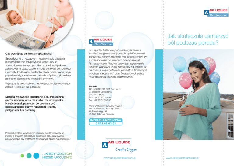 Jak skutecznie uśmierzyć ból podczas porodu? Czy występują działania niepożądane? Sporadycznie u rodzących mogą wystąpić działania niepożądane. Nie ma pewności jednak czy są spowodowane samym porodem czy też są wynikiem zastosowania gazu. Czasem mogą pojawiać się nudności i wymioty. Podawaniu podtlenku azotu może towarzyszyć pojawienie się mrowienia w palcach stóp i/lub rąk, zmiany percepcji (zaburzenia narządów zmysłów). Wystąpienie jakichkolwiek niepokojących objawów należy zgłosić lekarzowi lub położnej. Metoda wziewnego łagodzenia bólu mieszaniną gazów jest przyjazna dla matki i dla noworodka. Należy jednak pamiętać, że powinna być stosowana pod stałym nadzorem lekarza, pielęgniarki lub położnej. Air Liquide Healthcare jest światowym liderem w dziedzinie gazów medycznych, opieki domowej, produktów higieny szpitalnej oraz specjalistycznych substancji wykorzystywanych przez przemysł farmaceutyczny. Naszym celem jest zapewnienie klientom właściwej opieki począwszy od szpitala aż do domu z wykorzystaniem produktów leczniczych, wyrobów medycznych oraz świadczonych usług, które wspierają ochronę zdrowia i życia. Kontakt AIR LIQUIDE POLSKA Sp. z o. o. ul. Josepha Conrada 63 31-357 Kraków Tel.: +48 12 627 93 00 Fax: +48 12 627 93 33 HURTOWNIA FARMACEUTYCZNA AIR LIQUIDE POLSKA Sp. z o.o. Al. Piłsudskiego 92 41-308 Dąbrowa Górnicza Położna lub lekarz są właściwymi osobami, do których należy się zwrócić z pytaniami dotyczącymi stosowania gazu, dawkowania, przeciwwskazań czy wystąpienia ewentualnych działań niepożądanych. www.airliquidehealthcare.pl www.airliquidehealthcare.pl Ból podczas porodu Dawkowanie - podczas porodu Kobieta oczekująca narodzin swojego dziecka pod koniec ciąży najbardziej obawia się bólu porodowego. Ból podczas porodu nie świadczy o nieprawidłowym jego przebiegu, lecz jest fizjologią tego wydarzenia. Istnieje wiele sposobów łagodzenia bólu porodowego wykorzystujących metody farmakologiczne i niefarmakologiczne. Farmakologiczne znieczulenie porodu opiera się na podawaniu rodzącej odpowiednich leków, które działają przeciwbólowo. Jednym z takich leków jest mieszanina gazów podawana wziewnie. Rodząca przy zastosowaniu tzw. zaworu na żądanie sama dawkuje produkt. Przepływ gazu jest dostosowany do naturalnych zdolności oddechowych rodzącej. Pacjentka wdycha gaz, oddychając normalnie, przy użyciu maski twarzowej (ewentualnie ustnika). Rekomendowane jest, aby pierwsze podanie mieszaniny trwało 3 minuty bez przerwy. Następnie rodząca wdycha gaz według zasady: ok. 30-50 sekund przed rozpoczynającym się skurczem. Dlatego też pacjentka, powinna zacząć wdychać gaz na samym początku skurczu, przed jego szczytem. Najbardziej efektywne są wdechy głębokie i powolne. Inhalację należy przerwać wraz z ustępowaniem bólu towarzyszącemu skurczowi. Pomiędzy skurczami należy zdejmować maskę (lub ustnik) i oddychać normalnie. W przerwach pomiędzy wdychaniem mieszaniny rodząca może korzystać z innych metod uśmierzania bólu (np.: piłka, prysznic, wanna, TENS itp.) Co to jest wziewna mieszanina gazów? Jest to gaz podawany wziewnie składający się z 50% tlenu i 50% podtlenku azotu, który posiada udowodnione działanie łagodzące ból oraz zmniejszające stres. Użycie mieszaniny zapewni rodzącej działanie znieczulające i przyniesie uczucie ulgi. Kiedy mieszanina wziewna przestaje działać? Zastosowanie w położnictwie na Świecie i w Polsce W Wielkiej Brytanii mieszaninę gazów stosuje się w trakcie 50%-75% porodów, a w Finlandii w trakcie około 60% porodów. W Hiszpanii, taki rodzaj terapii zalecany jest przez Ministerstwo Zdrowia. W Polsce jest bardzo powszechnie stosowaną metodą łagodzenia bólu. Po odstawieniu maski (lub ustnika) działanie ustępuje w ciągu kilku minut. Po ok. 5 minutach większość gazu zostaje usunięta z organizmu. Do podawania mieszaniny rekomenduje się stosowanie masek twarzowych. Zastosowanie gazu to możliwość pomocy rodzącej podczas porodu • może być podawany na każdym etapie porodu • podanie leku można rozpocząć, gdy rodząca ma skurcze intensywne, regularne i bolesne • nie zakłóca poszczególnych etapów akcji porodowej (nie hamuje skurczów macicy ani nie wywołuje niekorzystnych skutków u płodu lub noworodka). Wpływ na rodzącą i dziecko • nie jest szkodliwy dla płodu - zwiększona ilość tlenu jest potencjalnie korzystna dla rodzącej i dla dziecka • nie ogranicza swobody poruszania rodzącej • nie wpływa na podstawowe funkcje organizmu • nie zmniejsza siły parcia • nie wpływa na długość trwania akcji porodowej • działa przeciwbólowo, przeciwlękowo i uspokajająco • szybko przenika barierę łożyskową, ale nie ma dowodów negatywnego wpływu na dziecko • nie wywołuje wad wrodzonych • nie wpływa na punktację w skali APGAR • nie zwiększa ryzyka powikłań u noworodka • nie wpływa na mleko matki i karmienie piersią.