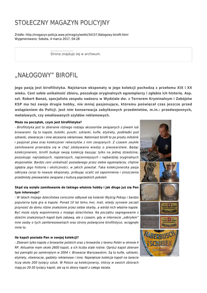 STOŁECZNY MAGAZYN POLICYJNY Źródło: http://magazyn.policja.waw.pl/mag/sylwetki/34157,Nalogowy-birofil.html Wygenerowano: Sobota, 4 marca 2017, 04:28 Strona znajduje się w archiwum. „NAŁOGOWY” BIROFIL Jego pasją jest birofilistyka. Najstarsze eksponaty w jego kolekcji pochodzą z przełomu XIX i XX wieku. Ceni sobie unikalność zbioru, poszukuje oryginalnych egzemplarzy i zgłębia ich historię. Asp. szt. Robert Banaś, specjalista zespołu nadzoru w Wydziale dw. z Terrorem Kryminalnym i Zabójstw KSP ma też swoje drugie hobby, nie mniej pasjonujące, któremu poświęcał czas jeszcze przed wstąpieniem do Policji. Jest nim konserwacja zabytkowych przedmiotów, m.in.: przedwojennych, metalowych, czy emaliowanych szyldów reklamowych. Może na początek, czym jest birofilistyka? - Birofilistyka jest to zbieranie różnego rodzaju akcesoriów związanych z piwem lub browarami. Są to kapsle, butelki, puszki, szklanki, kufle, etykiety, podkładki pod szklanki, otwieracze i inne akcesoria reklamowe. Natomiast birofil to po prostu miłośnik i pasjonat piwa oraz kolekcjoner rekwizytów z nim związanych. Z czasem zwykłe zamiłowanie przeradza się w chęć zdobywania wiedzy o piwowarstwie. Będąc kolekcjonerem, birofil buduje swoją kolekcję bazując tylko na jednej dziedzinie, poszukując najrzadszych, najstarszych, najcenniejszych i najbardziej oryginalnych eksponatów. Bardzo ceni unikalność posiadanego przez siebie egzemplarza, chętnie zgłębia jego historię i okoliczności, w jakich powstał. Taka kolekcjonerska pasja odkrywa coraz to nowsze eksponaty, próbując ocalić od zapomnienia i zniszczenia przedmioty piwowarskie związane z kulturą poprzednich pokoleń. Skąd się wzięło zamiłowanie do takiego właśnie hobby i jak długo już się Pan tym interesuje? - W latach mojego dzieciństwa corocznie odbywał się kolarski Wyścig Pokoju i bardzo popularna była gra w kapsle. Ponad 10 lat temu moi, mali, wtedy synowie zaczęli przynosić do domu różne znalezione przez siebie skarby, a wśród nich właśnie kapsle. Być może ożyły wspomnienia z mojego dzieciństwa. Na początku segregowanie z dziećmi znalezionych kapsli było zabawą, ale z czasem, gdy w internecie „odkryłem” inne osoby o tych zainteresowaniach oraz strony poświęcone birofilistyce, wciągnęło mnie to. Ile kapsli posiada Pan w swojej kolekcji? - Zbieram tylko kapsle z browarów polskich oraz z browarów z terenu Polski w okresie II RP. Aktualnie mam około 2600 kapsli, a ich liczba stale rośnie. Oprócz kapsli zbieram też pamiątki po zamkniętym w 2004 r. Browarze Warszawskim. Są to kufle, szklanki, etykiety, otwieracze, gadżety reklamowe i inne. Największe kolekcje kapsli na świecie liczą około 200 tysięcy sztuk. W Polsce są kolekcjonerzy, którzy w swoich zbiorach mają po 20-30 tysięcy kapsli, ale są to zbiory kapsli z całego świata. Czy jest jakiś szczególny kapsel, który chciałby Pan posiadać? - Każdy kolekcjoner ma takie obiekty westchnień. Dla mnie są to kapsle z warszawskiego Browaru Haberbusch i Schiele. W jaki sposób gromadzi Pan kapsle? - Zdobywam je przede wszystkim poprzez wymianę z innymi kolekcjonerami, ale także giełdy birofilistyczne i aukcje internetowe. Przechowuję je w segregatorach, w specjalnie do tego celu produkowanych kartach. Aktualnie cała moja kolekcja mieści się w 11 segregatorach. Jaki jest najstarszy kapsel w Pana kolekcji? - Moje najstarsze eksponaty (zrywki, nakładki) pochodzą z przełomu XIX i XX wieku. Niestety, nie mam jeszcze żadnego kapsla z okresu międzywojennego. Ich ceny na aukcjach internetowych sięgają 2 tys. zł. Nie każdy wie, że kapsel został wymyślony w USA w 1892 r., a rok później wymyślono też pierwszy otwieracz do kapsli. W Polsce kapsle zaczęto stosować w okresie międzywojennym. Wcześniej używano butelek popularnie nazywanych „oranżadówkami”. Do butelek z piwem używano korków oraz ołowianych nakładek i aluminiowych zamknięć (tzw. zrywek) przypominających dzisiejsze zamknięcia butelek z napojami znanej firmy. Czy ma Pan kontakt z innymi birofilami? - Utrzymuję stały kontakt z birofilami z całej Polski, co w znacznym stopniu ułatwia powiększanie mojej kolekcji. Birofilów można znaleźć wśród różnych grup zawodowych, także wśród prokuratorów i policjantów. Znam jeszcze jednego policjanta zbierającego kapsle. Może po tym artykule ktoś jeszcze się ujawni? Chętnie nawiążę z nim kontakt. Mam też taką cichą nadzieję, że ktoś z czytających ten artykuł przypomni sobie, że gdzieś w piwnicy, szafie, komórce ma ukryte kapsle z lat dziecięcych i odezwie się do mnie. Mój adres e-mail: [email protected]. Aktywnie udzielam się na forach kolekcjonerskich. Według mojej wiedzy w Polsce kapsle zbiera około 200-300 osób, z czego około połowę stanowi młodzież, która po dość krótkim okresie rezygnuje. Utrzymuję stały kontakt z wieloma kolekcjonerami, nie tylko zbierającymi birofilia, ponieważ kolekcjoner ma w sobie takie coś, co powoduje, że „przyklejają mu się do rąk” różne przedmioty niekoniecznie związane z hobby. Część moich zbiorów pochodzi z wymian z osobami, które nie kolekcjonują birofiliów, a przez przypadek weszły w ich posiadanie. Jaką wartość ma Pana kolekcja? - Nie przeliczam jej na pieniądze. Faktem jest, że ma ona swoją wartość, ale jaką, nad tym nigdy się nie zastanawiałem. Ale chyba nie chcę wiedzieć, ile na to swoje hobby wydaję… Czy wśród birofilów jest więcej pań, czy panów? - Znaczna większość kolekcjonerów to oczywiście mężczyźni, ale są też nieliczne kobiety, choć to rzadkość. Jest bardzo duża rozpiętość wiekowa, od kilkunastu do kilkudziesięciu lat. Znam osobiście co najmniej kilku siedemdziesięciolatków. Czy fakt, że posiada Pan tak bogatą kolekcję, oznacza także zamiłowanie do tych trunków, od których pochodzą kapsle? - W odróżnieniu od pi