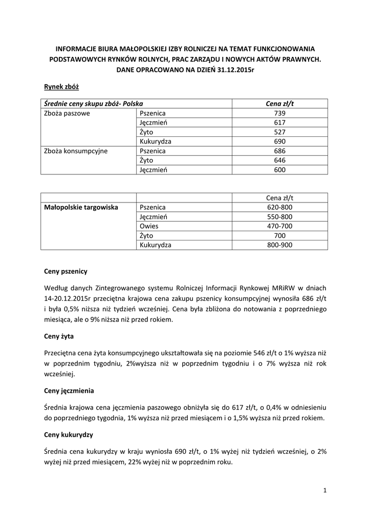 INFORMACJE BIURA MAŁOPOLSKIEJ IZBY ROLNICZEJ NA TEMAT FUNKCJONOWANIA PODSTAWOWYCH RYNKÓW ROLNYCH, PRAC ZARZĄDU I NOWYCH AKTÓW PRAWNYCH. DANE OPRACOWANO NA DZIEŃ 31.12.2015r Rynek zbóż Średnie ceny skupu zbóż- Polska Zboża paszowe Pszenica Jęczmień Żyto Kukurydza Zboża konsumpcyjne Pszenica Żyto Jęczmień Małopolskie targowiska Pszenica Jęczmień Owies Żyto Kukurydza Cena zł/t 739 617 527 690 686 646 600 Cena zł/t 620-800 550-800 470-700 700 800-900 Ceny pszenicy Według danych Zintegrowanego systemu Rolniczej Informacji Rynkowej MRiRW w dniach 14-20.12.2015r przeciętna krajowa cena zakupu pszenicy konsumpcyjnej wynosiła 686 zł/t i była 0,5% niższa niż tydzień wcześniej. Cena była zbliżona do notowania z poprzedniego miesiąca, ale o 9% niższa niż przed rokiem. Ceny żyta Przeciętna cena żyta konsumpcyjnego ukształtowała się na poziomie 546 zł/t o 1% wyższa niż w poprzednim tygodniu, 2%wyższa niż w poprzednim tygodniu i o 7% wyższa niż rok wcześniej. Ceny jęczmienia Średnia krajowa cena jęczmienia paszowego obniżyła się do 617 zł/t, o 0,4% w odniesieniu do poprzedniego tygodnia, 1% wyższa niż przed miesiącem i o 1,5% wyższa niż przed rokiem. Ceny kukurydzy Średnia cena kukurydzy w kraju wyniosła 690 zł/t, o 1% wyżej niż tydzień wcześniej, o 2% wyżej niż przed miesiącem, 22% wyżej niż w poprzednim roku. 1 Rynek trzody chlewnej SKUP/ POLSKA Klasa półtusz wieprzowych wg SEUROP Klasa S Klasa E Klasa U Klasa R Klasa O Klasa P S-P razem Cena zł/t MPS MPC 2015-12-20 2015-12-13 2015-12-20 2015-12-13 5276 5193 4767 4344 3815 2886 5077 5218 5140 4711 4270 3746 2960 5031 5173 5092 4673 4258 3740 2830 4978 5116 5040 4619 4186 3672 2902 4932 Ceny sprzedaży półtusz wieprzowych 2015-12-13 średnia cena sprzedaży półtusz wieprzowych w Polsce nie zmieniła się w porównaniu do minionego tygodnia i osiągnęła 5.757 zł/t . Z danych ZSRIR wynika, że w średnia cena trzody na początku IV kwartału wynosiła 4,38zł/kg i była o 5% mniejsza niż rok wcześniej. Spadek cen utrzymywał się w kolejnych tygodniach na początku grudnia średnia cena trzody wynosiła 4.16 zł/kg. Ceny prosiąt na polskich targowiskach 12-13-15 średnia krajowa cena sprzedaży prosiąt wyniosła 137,04 zł/szt. (20 kg), co oznacza brak zmian w porównaniu do 12-06-15. Najniższa możliwa cena prosiąt na polskich targowiskach wyniosła 110,00 zł/szt. (o 10% więcej w porównaniu do minionego tygodnia) najwyższa natomiast 160,00 zł/szt. (spadek o 8%). Ceny prosiąt na małopolskich targowiskach targowisko prosięta za tuczniki za kg parę Proszowice 310-320zł 4,20-4,40zł Miechów 320zł 4,20-4,30zł Wadowice 320-350zł - Rynek żywca wołowego W okresie przedświątecznym sprzedaż bydła wyraźnie się ustabilizowała. Większość skupujących zakładów pozostała przy dotychczasowych cennikach. Za buhaje w klasie R zakłady płacą maksymalnie 13 zł/kg. Najlepsze buhaje w wadze żywej wyceniane są na 7.50 zł/kg. Górne stawki w przypadku jałówek w klasie R dochodzą do 12,4 zł/kg., natomiast te zaklasyfikowane do klasy O kosztują maksymalnie 12 zł/kg. Jałówki skupowane w wadze żywej wyceniane są maksymalnie na 6,80 zł/kg. Aktualne stawki za krowy w rozliczeniu poubojowym zatrzymują się na poziomie 10,50 zł/kg. W wielu zakładach stawki znajdują się poniżej 10 zł/kg. Krowy wyceniane na żywą wagę kosztują maksymalnie 5,2 zł/kg. Źródło www.farmer.pl, ZSRIR MRiRW 2 Rynek owoców i warzyw Owoce/warzywa w Małopolsce Cebula Kalafior Czosnek Marchew Pietruszka Pomidory Ogórki długie Pieczarki Ziemniaki Jabłka Seler Kapusta biała Kapusta czerwona Cena w zł/kg 0,85 – 2,50 1,80 – 3,50 0,50 – 1,80 0,75 – 2,50 1,85 – 6,00 3,30 – 8,00 4,50 5,50 – 8,00 0,43 – 1,50 1,33 – 3,00 1,80 - 6,00 0,60 – 2,50 1,30 – 2,50 Jabłka Ceny jabłek krajowych są obecnie dwa razy droższe niż przed rokiem. Za jeden kilogram tych owoców trzeba zapłacić obecnie średnio 2 zł, podczas gdy rok wcześniej jabłka kosztowały 1 zł/kg .Zbiory ukształtowały się na poziomie 3,15 mln t, czyli nieznacznie, bo o 1,4 proc., niższym niż w roku poprzednim. Pomidory i ogórki Tańsze niż przed rokiem są pomidory i ogórki. Kilogram pomidorów kosztuje średnio 6 zł wobec 7,5 zł/kg w 2014 r. Z kolei średnia cena ogórków spadła z 7 zł/kg do 4,5 zł/kg. Cebula, marchew, ziemniaki Ceny cebuli, marchwi i ziemniaków były wyższe niż przed rokiem i wynosiły: cebula – średnio 1,50 zł/kg.-zbiory 540 tys. t ,marchew-średnio 1,50 zł/kg zbiory-670 tys. t, ziemniaki- średnio 80 zł za dt – zbiory- 6,3 mln t Owoce suszone, kapusta kiszona, buraki czerwone, orzechy Za kilogram kapusty kiszonej trzeba średnio zapłacić od 2,40 zł do 3,76 zł. Średnie ceny kapusty białej wahają się od 0,80 zł/kg do 1,10 zł/kg. Produkt ten na giełdach owocowo-warzywnych sprzedawany jest także „na sztuki”. Główka kosztuje od 1,00 zł do 3,15 zł (średnia cena). Średnie ceny buraków czerwonych z kolei oscylują w granicach 0,70-1,10 zł/kg. Średnie ceny owoców suszonych- gruszki i jabłka kupimy za 9,50 zł/kg, śliwki (bez pestek) za 11,50 zł/kg. Średnia cena orzechów włoskich waha się od 3,50 zł/kg do 6,50 zł/kg. Laskowe kosztują od 10 zł/kg do 15,50 zł/kg . Opracowano na podstawie ZSRIR MRiRW, www.stat.gov.pl, TOP Agrar. Akty prawne dotyczące rolnictwa ogłoszone w grudniu 2015 roku. Dz.U. 2015 nr 0 poz. 2024 Rozporządzenie Rady Ministrów z dnia 30 listopada 2015 r. w sprawie 3 wysokości dopłat do składek z tytułu ubezpieczenia upraw rolnych i zwierząt gospodarskich w 2016 r ( W 2016 r. dopłata do składki z tytułu ubezpieczenia: 1) upraw zbóż, kukurydzy, rzepaku, rzepiku, chmielu, tytoniu, warzyw gruntowych, drzew i krzewów owocowych, truskawek, ziemniaków, buraków cukrowych lub roślin strączkowych – wynosi 65% składki do 1 ha uprawy; 2) bydła, koni, owiec, kóz, drobiu lub świń 