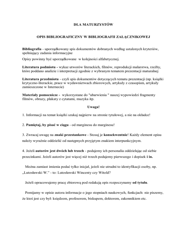 DLA MATURZYSTÓW OPIS BIBLIOGRAFICZNY W BIBLIOGRAFII
