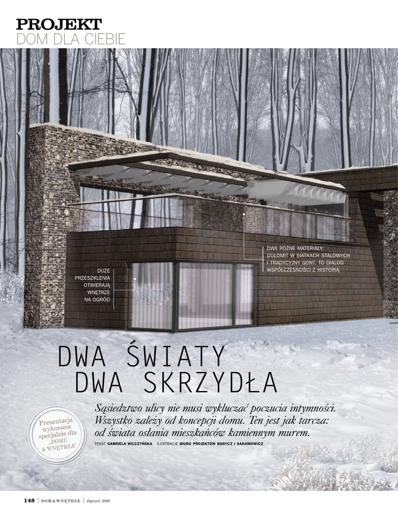 projekt DOM DLA CIEBIE Dwa różne materiały: dolomit w SIATKACH STALOWYCH i tradycyjny gont. to dialog współczesności z historią Duże przeszklenia otwierają wnętrze na ogród Dwa światy dwa skrzydła Sąsiedztwo ulicy nie musi wykluczać poczucia intymności. Wszystko zależy od koncepcji domu. Ten jest jak tarcza: od świata osłania mieszkańców kamiennym murem. ja Prezentac a n a n o k y w dla specjalnie „Domu rza” & Wnęt 148 | dom & wnĘtrze tekst gabriela Wilczyńska | styczeń 2009 ilustracje Biuro projektów Barycz i saramowicz przeszklona altana zamyka KOMPOZYCJĘ BUDYNKU, TWORZĄC INTYMNE ATRIALNE WNĘTRZE OGRODU Ty teŻ moŻesz mieĆ podobny dom! pracownia: Biuro Projektów Barycz i Saramowicz Autorzy Projektu: dr Rafał Barycz, dr Paweł Saramowicz z zespołem kontakt: www.barycz-saramowicz.pl, [email protected] powierzchnia uŻytkowa: 468,95 m2 przewidywany koszt inwestycji: 3 mln zł styczeń 2009 | dom & wnĘtrze | 149 projekt dom dla ciebie Elewacja ogrodowa: wielkie przeszklenia o uporządkowanym rytmie zapewniają rozległą panoramę Elewacja frontowa: wygląda jak skalny monoliT. Kontakt z otoczeniem zapewniają okna typu wstęgowego o modernistycznym rodowodzie Dla kogo Dla miłośników architektury. Dla rodziny z dwójką dzieci. Niezależne skrzydło mieści również pokoje dla gości bądź opiekunki. To może być też dom dla rodziny wielopokoleniowej. Pomieści rodziców oraz dzieci wkraczające w dorosłe życie. Działka W kształcie zbliżonym do prostokąta, o minimalnej szerokości ok. 30 m. Układ przestrzenny domu pozwala na usytuowanie go jak najbliżej ulicy, przy zachowaniu intymności. W ten sposób wewnętrzna część działki staje się ogrodem. Niezależna altana oraz sadzawka zbliżają tę przestrzeń do atrium. Ograniczone skrzydłami budynku atrium to wnętrze domu, które jest ogrodem. Kształt domu Elewacja frontowa: jest jak twierdza, osłania przed wzrokiem przechodniów i daje mieszkańcom poczucie bezpieczeństwa Prosta i elegancka dwuskrzydłowa bryła. Ściany wewnętrzne od strony ogrodu okrywa ciepły przytulny gont oraz drewniane przesuwne okiennice. Zewnętrzne są w charakterze technologiczne. Okrywa je dolomit w stalowych siatkach oraz perforowana blacha. Z czego budować Technologia tradycyjna mieszana murowano-żelbetowa. Fundamenty bezpośrednie w postaci ław i stóp fundamentowych. Ściany zewnętrzne nośne z pustaków ceramicznych. Stropy międzykondygnacyjne płytowe żelbetowe, jednokierunkowo i krzyżowo zbrojone, wylewane na mokro. Dach płaski z warstwą żwirową w technologii stropodachu odwróconego; na fragmencie z nawierzchnią drewnianą typu deck-dry do chodzenia oraz z warstwą roślinną. Termoizolacja z użyciem ekstrudowanego polistyrenu. Balustrady z samonośnych płyt szklanych. Wewnątrz Elewacja ogrodowa: harmonijna bryła dobrze komponuje się z otoczeniem 150 | dom & wnĘtrze | styczeń 2009 Przestrzeń domu jest otwarta. Duże przeszklenia zapewniają rozległą panoramę. Meble, szafy, garderoby i pawlacze zostały wbudowane w ściany. Projekt zakłada wykorzystanie we- Elewacja ogrodowa: tu najlepiej widać grę dwóch materiałów – ciepłego gontu i ascetycznego kamienia Elewacja zewnętrzna: NIECO TECHNOLOGICZNA w charakterze I trudno DOSTĘPna. Takie wrażenie stwarza dolomit w siatkach stalowych i OKIENNICE Z PERFOROWANEJ BLACHY parter wnątrz domu materiałów elewacyjnych, co bardzo wzmacnia efekt spójności stylistycznej. pokój gościnny schowek łazienka dzienna plan domu powierzchnia użytkowa 468,95 m2 sypialnia rodziców łazienka garaż kuchnia pokój dziecka salon garderba Przy głównym wejściu są hol główny, garderoba na okrycia wierzchnie i łazienka dzienna. Z holu przechodzi się do garażu na dwa pojazdy. Przylegają do niego kotłownia oraz schowek. Centrum strefy dziennej stanowi kuchnia z barem, jadalnią codzienną, jadalnią do wydawania przyjęć. Leży na osi jadalni letniej znajdującej się pod gołym niebem (obie można łączyć, są tam drzwi rozsuwane). Do kuchni przylega spiżarnia z wejściem do piwniczki na wino. Strefa dzienna obejmuje pokój dzienny wysoki na dwie kondygnacje, kominek i przedpokój. Odrębną część tworzą dwa pokoje gościnne w bocznym skrzydle domu z garderobami, łazienkami oraz osobnym wejściem. Taka lokalizacja zapewnia pełną niezależność gościom i domownikom. Na końcu tego skrzydła jest strefa pracy twórczej – gabinet z biblioteką. Na piętrze mieści się strefa prywatna zaprojektowana wokół galerii nad pokojem dziennym. Pokoje rodziców ulokowano w północnym skrzydle piętra. Do sypialni przylega obszerny taras z widokiem na ogród. Obok sypialni jest pokój kąpielowy oraz garderoba bezpośrednio połączona z pralnią. Po przeciwnej stronie, w południowym skrzydle usytuowano dwa duże pokoje dziecinne, pomiędzy którymi znajduje się własna łazienka. Kształt sypialni dziecięcych pomyślano tak, by swobodnie mogły pomieścić więcej niż dwoje dzieci. łazienka pokój dziecka Plan taras pokój gościnny taras łazienka Zastosowano rodzime surowce trwale wpisane w polską tradycję budowlaną. Elewacja jest połączeniem naturalnego gontu elewacyjnego z dranicy dębowej i bardzo innowacyjnego materiału, jakim są kosze gabionowe z zasypem kamiennym. Gont jest surowcem ciepłym i przytulnym, głęboko osadzonym w polskiej tradycji architektonicznej. Świetne efekty daje w zestawieniu z kamieniem naturalnym. Zarówno gont elewacyjny, jak i kosze kamienne mają intrygującą fakturę. piętro taras jadalnie Na zewnątrz gabinet hol pralnia Elewacja frontowa: od strony ulicy uwagę zwraca fakturalna rzeźbiarska elewacja domu styczeń 2009 | dom & wnĘtrze | 151