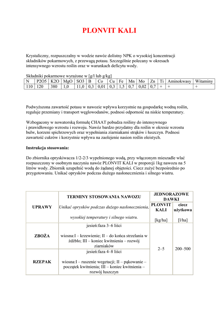PLONVIT KALI Krystaliczny, rozpuszczalny w wodzie nawóz dolistny NPK o wysokiej koncentracji składników pokarmowych, z przewagą potasu. Szczególnie polecany w okresach intensywnego wzrostu roślin oraz w warunkach deficytu wody. Składniki pokarmowe wyrażone w [g/l lub g/kg] N P2O5 K2O MgO SO3 B Co Cu Fe Mn Mo Zn Ti Aminokwasy Witaminy 110 120 380 1,0 11,0 0,3 0,01 0,3 1,5 0,7 0,02 0,7 + + + Podwyższona zawartość potasu w nawozie wpływa korzystnie na gospodarkę wodną roślin, reguluje przemiany i transport węglowodanów, podnosi odporność na niskie temperatury. Wzbogacony w nowatorską formułę CHAAT pobudza rośliny do intensywnego i prawidłowego wzrostu i rozwoju. Nawóz bardzo przydatny dla roślin w okresie wzrostu bulw, korzeni spichrzowych oraz wypełniania ziarniakami strąków i łuszczyn. Podnosi zawartość cukrów i korzystnie wpływa na zaolejenie nasion roślin oleistych. Instrukcja stosowania: Do zbiornika opryskiwacza 1/2-2/3 wypełnionego wodą, przy włączonym mieszadle wlać rozpuszczony w osobnym naczyniu nawóz PLONVIT KALI w proporcji 1kg nawozu na 5 litrów wody. Zbiornik uzupełnić wodą do żądanej objętości. Ciecz zużyć bezpośrednio po przygotowaniu. Unikać oprysków podczas dużego nasłonecznienia i silnego wiatru. JEDNORAZOWE DAWKI ciecz Unikać oprysków podczas dużego nasłonecznienia, PLONVIT KALI użytkowa TERMINY STOSOWANIA NAWOZU UPRAWY wysokiej temperatury i silnego wiatru. [kg/ha] [l/ha] 2–5 200–500 jesień:faza 3–6 liści ZBOŻA RZEPAK wiosna:I – krzewienie; II – do końca strzelania w źdźbło; III – koniec kwitnienia – rozwój ziarniaków jesień:faza 4–8 liści wiosna:I – ruszenie wegetacji; II – pąkowanie – początek kwitnienia; III – koniec kwitnienia – rozwój łuszczyn I –faza 2–6 liści; II – 8–10 liści; III – przed wyrzuceniem wiech Od 4–8 liści, w czasie rozwoju korzenia stosować BURAK co 10–14 dni I – formowanie liści; II – formowanie pędów – zwieranie międzyrzędzi; III–VIII – tworzenie ZIEMNIAK kwiatostanów do dojrzewania (wykonać od 1do 5 zabiegów, w zależności od wczesności odmiany, co 7–14 dni) I– po kwitnieniu; II – 10–14 dni później STRĄCZKOWE 2–4 zabiegi co 7–14 dni w fazie intensywnego Inne rolnicze wzrostu KUKURYDZA W przypadku wystąpienia na roślinach objawów niedoboru składników pokarmowych wykonać 2–4 opryski co 4–7 dni.