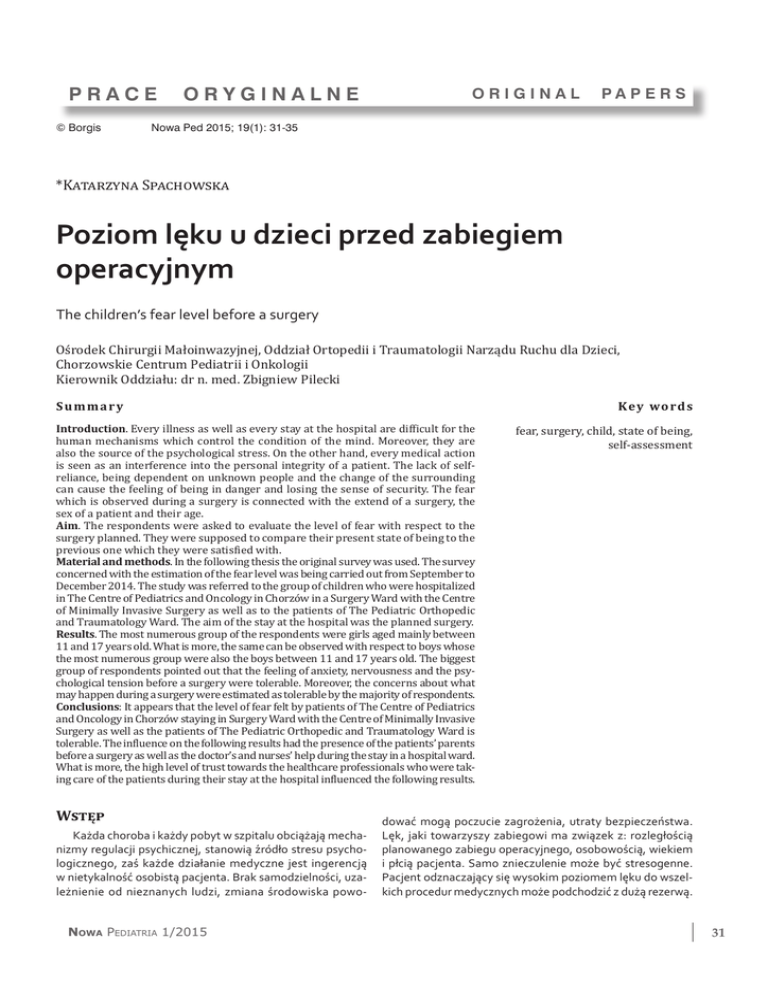 PRACE © Borgis ORYGINALNE ORIGINAL PA P E R S Nowa Ped 2015; 19(1): 31-35 *Katarzyna Spachowska Poziom lęku u dzieci przed zabiegiem operacyjnym The children’s fear level before a surgery Ośrodek Chirurgii Małoinwazyjnej, Oddział Ortopedii i Traumatologii Narządu Ruchu dla Dzieci, Chorzowskie Centrum Pediatrii i Onkologii Kierownik Oddziału: dr n. med. Zbigniew Pilecki Summary Key wo rd s Introduction. Every illness as well as every stay at the hospital are difficult for the human mechanisms which control the condition of the mind. Moreover, they are also the source of the psychological stress. On the other hand, every medical action is seen as an interference into the personal integrity of a patient. The lack of selfreliance, being dependent on unknown people and the change of the surrounding can cause the feeling of being in danger and losing the sense of security. The fear which is observed during a surgery is connected with the extend of a surgery, the sex of a patient and their age. Aim. The respondents were asked to evaluate the level of fear with respect to the surgery planned. They were supposed to compare their present state of being to the previous one which they were satisfied with. Material and methods. In the following thesis the original survey was used. The survey concerned with the estimation of the fear level was being carried out from September to December 2014. The study was referred to the group of children who were hospitalized in The Centre of Pediatrics and Oncology in Chorzów in a Surgery Ward with the Centre of Minimally Invasive Surgery as well as to the patients of The Pediatric Orthopedic and Traumatology Ward. The aim of the stay at the hospital was the planned surgery. Results. The most numerous group of the respondents were girls aged mainly between 11 and 17 years old. What is more, the same can be observed with respect to boys whose the most numerous group were also the boys between 11 and 17 years old. The biggest group of respondents pointed out that the feeling of anxiety, nervousness and the psychological tension before a surgery were tolerable. Moreover, the concerns about what may happen during a surgery were estimated as tolerable by the majority of respondents. Conclusions: It appears that the level of fear felt by patients of The Centre of Pediatrics and Oncology in Chorzów staying in Surgery Ward with the Centre of Minimally Invasive Surgery as well as the patients of The Pediatric Orthopedic and Traumatology Ward is tolerable. The influence on the following results had the presence of the patients’ parents before a surgery as well as the doctor’s and nurses’ help during the stay in a hospital ward. What is more, the high level of trust towards the healthcare professionals who were taking care of the patients during their stay at the hospital influenced the following results. Wstęp Każda choroba i każdy pobyt w szpitalu obciążają mechanizmy regulacji psychicznej, stanowią źródło stresu psychologicznego, zaś każde działanie medyczne jest ingerencją w nietykalność osobistą pacjenta. Brak samodzielności, uzależnienie od nieznanych ludzi, zmiana środowiska powoNowa Pediatria 1/2015 fear, surgery, child, state of being, self-assessment dować mogą poczucie zagrożenia, utraty bezpieczeństwa. Lęk, jaki towarzyszy zabiegowi ma związek z: rozległością planowanego zabiegu operacyjnego, osobowością, wiekiem i płcią pacjenta. Samo znieczulenie może być stresogenne. Pacjent odznaczający się wysokim poziomem lęku do wszelkich procedur medycznych może podchodzić z dużą rezerwą. 31 Katarzyna Spachowska Sytuacja taka ma miejsce zwłaszcza w przypadku dzieci i młodzieży. Okresowi oczekiwania na operację towarzyszą różne napięcia, w różny też sposób młodzi pacjenci radzą sobie ze stresem wynikającym z perspektywy leczenia. Pojawia się konflikt „przyciąganie-unikanie”. Polega on na tym, że cel ma zarówno wartość pozytywną, jak i negatywną. Jawi się jako atrakcyjny, gdy jest oddalony, zaś w miarę zbliżania się do niego, zwiększa się aspekt negatywny, co staje się przyczyną zaburzeń emocjonalnych. Stan psychiczny pacjenta przed zabiegiem jest zmienny, jednak dominującymi uczuciami są strach i lęk. Jeśli się nasilają, mogą w niekorzystny sposób wpłynąć na parametry fizjologiczne przed anestezją i podczas niej, zaburzać przebieg okresu po operacji i wydłużać czas hospitalizacji (1). Dlatego pacjent, trafiając do szpitala, powinien być otoczony troskliwą opieką personelu. Zadanie to jest szczególnie ważne na oddziałach chirurgicznych. Postawa, zachowanie, sposób porozumiewania się lekarzy i pielęgniarek z pacjentem oraz poszanowanie jego praw mogą minimalizować lęk i strach przed zabiegiem. Niezwykle ważna jest rozmowa przedoperacyjna, która ma na celu wyjaśnienie wszelkich niezrozumiałych kwestii i rozwianie wątpliwości związanych z procesem leczenia i zabiegiem operacyjnym. Zespół opiekujący się pacjentem powinien jednak pamiętać, że nazbyt obszerna informacja nie jest wskazana, gdyż zdarza się, że powoduje wzrost poziomu lęku u pacjenta. Dlatego należy dostarczać mu jedynie najważniejszych, najbardziej przydatnych treści w danym momencie. Przygotowaniem do zabiegu powinien zająć się cały zespół terapeutyczny, bowiem nawet najlepiej wykonana operacja nie przyniesie pozytywnych efektów, jeśli chory nie będzie do niej w odpowiedni sposób przygotowany oraz nie będzie miał właściwej opieki po zabiegu. Bezpośrednią opiekę nad chorym sprawuje pielęgniarka. Do jej zadań należy przygotowanie pacjenta pod względem fizycznym i psychicznym. Jej opieka nie polega wyłącznie na zabiegach technicznych, manualnych, ale i na kontaktach interpersonalnych, oddziaływaniu psychoterapeutycznym i wychowawczym (2). Postulowane jest traktowanie psychoterapii elementarnej jako jednego z zadań zawodowych pielęgniarki. Szacune