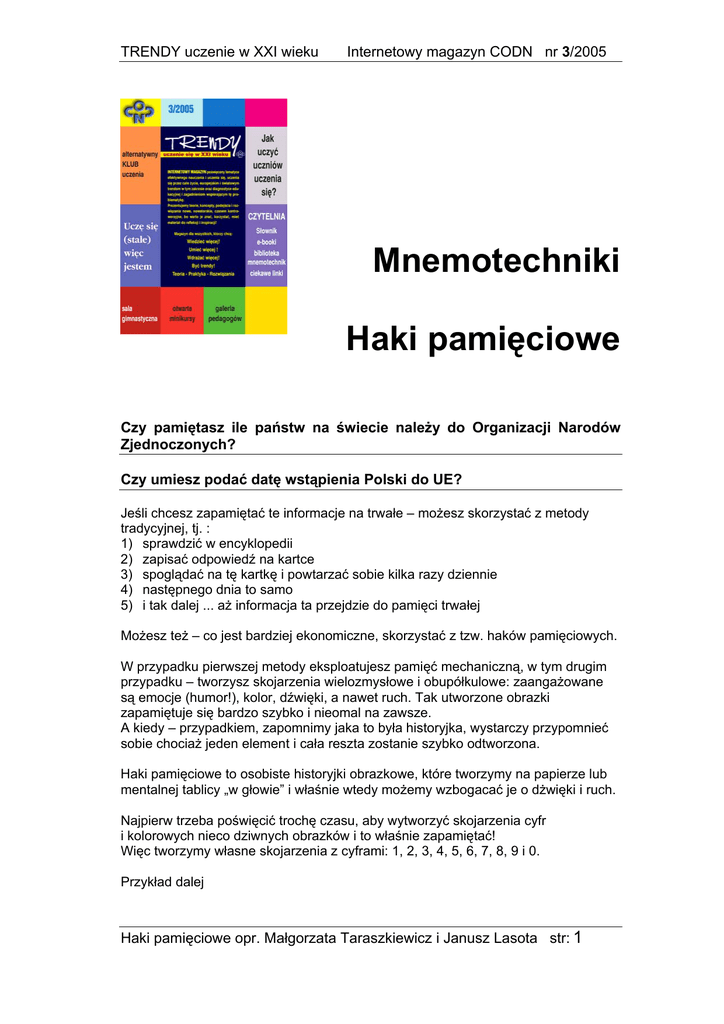 TRENDY uczenie w XXI wieku Internetowy magazyn CODN nr 3/2005 Mnemotechniki Haki pamięciowe Czy pamiętasz ile państw na świecie należy do Organizacji Narodów Zjednoczonych? Czy umiesz podać datę wstąpienia Polski do UE? Jeśli chcesz zapamiętać te informacje na trwałe – możesz skorzystać z metody tradycyjnej, tj. : 1) sprawdzić w encyklopedii 2) zapisać odpowiedź na kartce 3) spoglądać na tę kartkę i powtarzać sobie kilka razy dziennie 4) następnego dnia to samo 5) i tak dalej ... aż informacja ta przejdzie do pamięci trwałej Możesz też – co jest bardziej ekonomiczne, skorzystać z tzw. haków pamięciowych. W przypadku pierwszej metody eksploatujesz pamięć mechaniczną, w tym drugim przypadku – tworzysz skojarzenia wielozmysłowe i obupółkulowe: zaangażowane są emocje (humor!), kolor, dźwięki, a nawet ruch. Tak utworzone obrazki zapamiętuje się bardzo szybko i nieomal na zawsze. A kiedy – przypadkiem, zapomnimy jaka to była historyjka, wystarczy przypomnieć sobie chociaż jeden element i cała reszta zostanie szybko odtworzona. Haki pamięciowe to osobiste historyjki obrazkowe, które tworzymy na papierze lub mentalnej tablicy „w głowie” i właśnie wtedy możemy wzbogacać je o dżwięki i ruch. Najpierw trzeba poświęcić trochę czasu, aby wytworzyć skojarzenia cyfr i kolorowych nieco dziwnych obrazków i to właśnie zapamiętać! Więc tworzymy własne skojarzenia z cyframi: 1, 2, 3, 4, 5, 6, 7, 8, 9 i 0. Przykład dalej Haki pamięciowe opr. Małgorzata Taraszkiewicz i Janusz Lasota str: 1 TRENDY uczenie w XXI wieku Internetowy magazyn CODN nr 3/2005 Haki pamięciowe Jeden Dwa Trzy Cztery Haki pamięciowe opr. Małgorzata Taraszkiewicz i Janusz Lasota str: 2 TRENDY uczenie w XXI wieku Internetowy magazyn CODN nr 3/2005 Pięć Sześć Siedem Haki pamięciowe opr. Małgorzata Taraszkiewicz i Janusz Lasota str: 3 TRENDY uczenie w XXI wieku Internetowy magazyn CODN nr 3/2005 Osiem Dziewięć Zero Haki pamięciowe opr. Małgorzata Taraszkiewicz i Janusz Lasota str: 4 TRENDY uczenie w XXI wieku Internetowy magazyn CODN nr 3/2005 Wyobraź sobie taką historyjkę: Wędka wbita w jabłko, a obok łabędź z jajami i krzesłem na grzbiecie, który skrzeczy „Unia Unia!” Jaka i czego to data? Jaka to data? Haki pamięciowe opr. Małgorzata Taraszkiewicz i Janusz Lasota str: 5