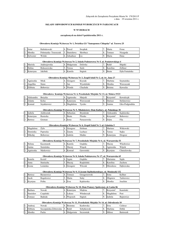 Załącznik do Zarządzenia Prezydenta Miasta Nr 170/2011/P z dnia 19 września 2011 r. SKŁADY OBWODOWYCH KOMISJI WYBORCZYCH W PABIANICACH W WYBORACH zarządzonych na dzień 9 października 2011 r. Obwodowa Komisja Wyborcza Nr 1, Świetlica GS "Samopomoc Chłopska" ul. Torowa 25 1. Artur Rubinkowski 4. Paweł Swędrak 7. Marta 2. Monika Połomaska- Trzeszczak 5. Stanisława Skrobacz 8. Tomasz Niezgoda 3. Sylwester Wolski 6. Arkadiusz Lis 9. Maria Dana 1. Mariola Obwodowa Komisja Wyborcza Nr 2, Szkoła Podstawowa Nr 5, ul. Poniatowskiego 4 Andrzejewska 4. Małgorzata Doliwka 7. Rafał Słupski 2. Halina Rokuszewska 5. Teresa Szelc 8. Karolina Zellmer 3. Katarzyna Jakóbek 6. Kamila Stępień 9. Beata Dyła Fontańska 1. Agnieszka Mruk 2. Angelika Stano 5. Jan Wysokiński 8. Monika Wawszczak 3. Elżbieta Bobowicz 6. Wanda Chachuła 9. Bożena Kawecka 1. Aleksandra Borycka 4. Agnieszka Matysik 7. Krzysztof 2. Jolanta Kolus 5. Katarzyna Wawszczak 8. Dariusz Stefanowicz 3. Konrad Szynkiewicz 6. Magdalena Tyczko 9. Joanna Głos-Podgrodzka 1. Izabela Obwodowa Komisja Wyborcza Nr 5, Młodzieżowy Dom Kultury, ul. Pułaskiego 38 Ambroziak 4. Sebastian Bryndziak 7. Aleksandra Kędzierska Obwodowa Komisja Wyborcza Nr 3, Zespół Szkół Nr 2, ul. św. Jana 27 4. Grzegorz Krysiak 7. Marlena Fronc Szymańska Obwodowa Komisja Wyborcza Nr 4, Przedszkole Miejskie Nr 13, ul. Mokra 19/23 Kowalczyk 2. Katarzyna Rusiecka 5. Beata Pliszka 8. Krzysztof Bobowicz 3. Bartosz Groman 6. Irena Paruszewska 9. Edyta Fila 1. Magdalena Żylis 2. Dominika Paprocka 5. Żaneta Łachacz 8. Teresa Sujka 3. Mikołaj Bobowicz 6. Izabela Mańko 9. Katarzyna Drogosz 1. Helena Obwodowa Komisja Wyborcza Nr 7, Przedszkole Miejskie Nr 6, ul. Warszawska 53 Kaczmarek 4. Kamila Grądzka 7. Maciej Wlazłowicz 2. Janina Siemińska 5. Maciej Wiącek 8. Agnieszka Wójcik 3. Agnieszka Markowicz 6. Konrad Gawroński 9. Krystyna Chmielewska 1. Kamila Obwodowa Komisja Wyborcza Nr 8, Szkoła Podstawowa Nr 17, ul. Warszawska 65 Kozieł 4. Agata Grądzka 7. Marianna Sajda Obwodowa Komisja Wyborcza Nr 6, Zespół Szkół Nr 3, ul. Gdańska 5 4. Grzegosz Hofman 7. Mariusz Witkowski 2. Anna Staniucha 5. Maciej Rządziński 8. Karolina Zuchora 3. Iwona Leżańska 6. Grzegorz Witczak 9. Mirosława Dąbrowska 1. Bartosz Obwodowa Komisja Wyborcza Nr 9, I Liceum Ogólnokształcące, ul. Moniuszki 132 Baranowicz 4. Tomasz Grzegorzewski 7. Irena Kellner 2. Jacek Rogalewicz 5. Marta Sulej 8. Zbigniew Turkiewicz 3. Krystyna Próba 6. Ewa Kędzierska 9. Monika Joachim 1. Barbara Obwodowa Komisja Wyborcza Nr 10, Dom Pomocy Społecznej, ul. Łaska 86 Nowak 4. Katarzyna Miękina 7. Krzysztof Kamiński 2. Stanisław Czapiński 5. Łukasz Włodarczyk 8. Magdalena Post 3. Tomasz Badziak 6. Wojciech Stępień 9. Izabela Bujnowicz 1. Andrzej Obwodowa Komisja Wyborcza Nr 11, Przedszkole Miejskie Nr 14, ul. Odrodzenia 10 Nowak 4. Bożenna Kozłowska 7. Ewa Cichosz 2. Elżbieta Szczepańska-Żebrowska 5. Rafał Sobytkowski 8. Marlena Dzbik 3. Monika Packa Szczesniak 9. Miłosz Bartoszek 6. Małgorzata Obwodowa Komisja Wyborcza Nr 12, NZOZ Pabianickie Centrum Medyczne Przychodnia Nr 1, ul. Wileńska 61 1. Adam Sobczak 4. Stanisław Sałaga 7. Jarosław Fuks 2. Katarzyna Wolska 5. Karolina Grzelczak 8. Joanna Habura 3. Krystyna Błoch 6. Agnieszka Zdziech 9. Kamila Dębińska 1. Arkadiusz Obwodowa Komisja Wyborcza Nr 13, Przedszkole Miejskie Nr 12, ul. Śniadeckiego 6a Jeger 4. Beata Becht 7. Rita Pinar-Socha 2. Maciej Sałaga 5. Bogumił Bujacz 8. Joanna Kupś 3. Mariola Gałęska 6. Aneta Szymczak 9. Barbara Wlażlak 1. Andrzej Obwodowa Komisja Wyborcza Nr 14, Szkoła Podstawowa Nr 14, ul. Ostatnia 15a Ostrowski 4. Dorota Becht 7. Julita Dziuba 2. Dawid Adamczyk 5. Wiesława Guzińska 8. Laurencja Śmiałkowska 3. Irena Strzelec 6. Ewelina Dana 9. Iwona Marusik 1. Bożenna Pluta 2. Krzysztof Brożyna 5. Joanna Błoch-Kapuścińska 8. Mateusz Wątorowski 3. Berenika Karaszkiewicz 6. Elżbieta Durczyńska 9. Beata Nowak 1. Jerzy Obwodowa Komisja Wyborcza Nr 16, Przedszkole Miejskie Nr 2, ul. Cicha 26 Majewski 4. Anna Sobczak 7. Andrzej Wołoszyn Obwodowa Komisja Wyborcza Nr 15, Gimnazjum Nr 1, ul. Tkacka 15 4. Dawid Stulczewski 7. Maria Konrad 2. Teresa Molińska 5. Adrian Famin 8. Katarzyna Rakowska 3. Marek Błoch 6. Katarzyna Durajska 9. Jolanta Sobala 1. Justyna Obwodowa Komisja Wyborcza Nr 17, Przedszkole Miejskie Nr 5, ul. Zamkowa 48/50 Grabarczyk 4. Dorota Ziętala 7. Karol Kantorek 2. Małgorzata Praszkowska 5. Iwona Majeran 8. Barbara Polak 3. Adam Janeta 6. Jadwiga Miszewska 9. Bożena Szalewska 1. Wacław Obwodowa Komisja Wyborcza Nr 18, Spółdzielczy Dom Kultury PSM, ul. Orla 45 Hetman 4. Aleksandra Karaszkiewicz 7. Zenon Drogosz 2. Agata Jaros 5. Monika Jarończyk 8. Adam Kunka 3. Mirosława Krzemińska 6. Lucyna Krzemińska-Wolska 9. Jarosław Biskupski 1. Andrzej Obwodowa Komisja Wyborcza Nr 19, Szkoła Podstawowa Nr 13, ul. Jana Pawła II 16 Wierucki 4. Tadeusz Gęs 7. Ewa Famin 2. Krystyna Maciejewska 5. Alina Pacer 8. Anna Jaworowska 3. Bartłomiej Drogosz 6. Ewa Markiewicz 9. Piotr Binkowski 1. Sylwia Obwodowa Komisja Wyborcza Nr 20 Gimnazjum Nr 2, ul. Skłodowskiej 5 Jamrozińska 4. Stanisław Ziętala 7. Bogumiła Słupska 2. Danuta Stępniak 5. Andrzej Sobytkowski 8. Marcin Biegajło 3. Alina Łacheta 6. Justyna Łacheta 9. Paweł Lewicki 1. Adrian Obwodowa Komisja Wyborcza Nr 21, Hala Sportowa Gimnazjum Nr 2, ul. Orla 1 Nawrocki 4. Bożena Szkudlarek 7. Piotr Nita 2. Anna Gryglewska 5. Damian Kacperski 8. Magdalena Kardas 3. Wiesława Paruszewska 6. Urszula Witkowska 9. Ryszard Zapart 1. Ardian Obwodowa Komisja Wyborcza Nr 22, Lokal Związku Nauczycielstwa Polskiego, ul. Kilińskiego 8 a Szumiał 4. Jolanta Gabryjanczyk 7. Henryka Górecka 2. Szymon Otomański 5. Agnieszka Zielińska 8. Michał Beda 3. Agata Pisarek 6. Agnieszka Filak 9. Małgorzata Kaczmarek 1. Małgorzata Obwodowa Komisja Wyborcza Nr 23, Szkoła Podstawowa Nr 8, ul. Piotra Skar