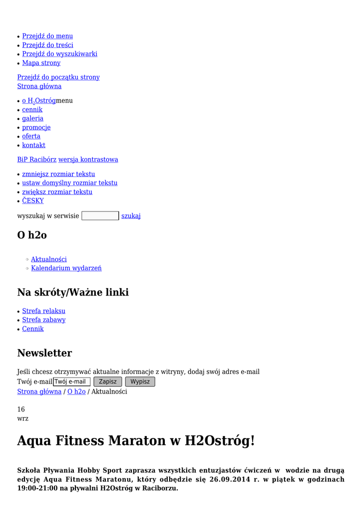 ● ● ● ● Przejdź do menu Przejdź do treści Przejdź do wyszukiwarki Mapa strony Przejdź do początku strony Strona główna ● ● ● ● ● ● o H2Ostrógmenu cennik galeria promocje oferta kontakt BiP Racibórz wersja kontrastowa ● ● ● ● zmniejsz rozmiar tekstu ustaw domyślny rozmiar tekstu zwiększ rozmiar tekstu ČESKY wyszukaj w serwisie szukaj O h2o ❍ ❍ Aktualności Kalendarium wydarzeń Na skróty/Ważne linki ● ● ● Strefa relaksu Strefa zabawy Cennik Newsletter Jeśli chcesz otrzymywać aktualne informacje z witryny, dodaj swój adres e-mail Twój e-mail Twój e-mail Zapisz Wypisz Strona główna / O h2o / Aktualności 16 wrz Aqua Fitness Maraton w H2Ostróg! Szkoła Pływania Hobby Sport zaprasza wszystkich entuzjastów ćwiczeń w wodzie na drugą edycję Aqua Fitness Maratonu, który odbędzie się 26.09.2014 r. w piątek w godzinach 19:00-21:00 na pływalni H2Ostróg w Raciborzu. Wodne aqua party poprowadzą profesjonaliści - instruktorzy pływania, fitness, zumby i tańca a dodatkowo całą imprezę uświetni dj Łukasz Kucięba (BSMusic), który fitnessowymi rytmami będzie rozgrzewał nas do ćwiczeń. W programie przewidziane są różnorodne ćwiczenia w wodzie tj. aqua power, aqua zumba, aqua energy hantle, aqua dance, aqua fun. Zajęcia poprowadzą Patrycja Chomiczewska, prezenterka Endorfina Fitness Club oraz gość specjalny Iwona Węgrzyn - instruktor fitness Wrocław. Organizator imprezy Szkoła Pływania Hobby Sport, sponsor główny Chapel Parket i Apteka pod Różami oraz partnerzy imprezy: Endorfina Fitness Club, Instytut Zdrowia i Urody Yasumi, Sandra Kania Dietetyka, Ośrodek Rehabilitacji Akson, Dentica 24, Cafe Deso, Bar Na Klasztornej, Za Rogiem, Fotografia Joanna Olejnik przygotowali wiele nagród i dodatkowych atrakcji dla wszystkich uczestników aqua maratonu. W czasie imprezy będzie można skorzystać z bezpłatnych konsultacji dietetycznych i wykonać analizę składu ciała. Trener personalny doradzi jak ćwiczyć, aby przyniosło to zamierzony efekt. Dodatkowo zostanie też zorganizowana loteria z atrakcyjnymi nagrodami m.in. vouchery na zajęcia fitness, masaż, usługi kosmetyczne i fryzjerskie, dobre jedzenie oraz nagrody rzeczowe itp. Więcej informacji na www.hobbysport.com.pl. Udział w imprezie to koszt 40 zł. Zapisy pod numerem telefonu 796 626 868, ale należy się spieszyć, bo ilość miejsc jest ograniczona. wszystkie drukuj zapisz jako pdf Redagował: anna koza 2014-10-09 11:24:38 ● ● ● ● 32 415 48 09 32 415 37 17 Mail Facebook Ośrodek Sportu i Rekreacji ul. Zamkowa 4, 47-400 Racibórzgodziny otwarcia obiektu: 7 dni w tygodniu, od poniedziałku do niedzieli 6.00-22.00 ● ● ● ● ● ● ● O h2o cennik galeria promocje oferta kontakt mapa witryny Projektowanie stron: IntraCOM.pl