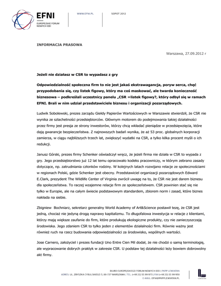 INFORMACJA PRASOWA Warszawa, 27.09.2012 r Jeżeli nie działasz w CSR to wypadasz z gry Odpowiedzialność społeczna firm to nie jest jakaś ekstrawagancja, poryw serca, chęć przypodobania się, czy listek figowy, który ma coś maskować, ale twarda konieczność biznesowa – podkreślali uczestnicy panelu „CSR =listek figowy?, który odbył się w ramach EFNI. Brali w nim udział przedstawiciele biznesu i organizacji pozarządowych. Ludwik Sobolewski, prezes zarządu Giełdy Papierów Wartościowych w Warszawie stwierdził, że CSR nie wynika ze szlachetności przedsiębiorców. Głównym motorem do podejmowania takiej działalności przez firmy jest presja ze strony inwestorów, którzy chcą wkładać pieniądze w przedsięwzięcia, które dają gwarancje bezpieczeństwa. Z najnowszych badań wynika, że aż 53 proc. globalnych korporacji zamierza, w ciągu najbliższych trzech lat, zwiększyć wydatki na CSR, a tylko kilka procent myśli o ich redukcji. Janusz Górski, prezes firmy Schenker oświadczył wręcz, że jeżeli firma nie działa w CSR to wypada z gry. Jego przedsiębiorstwo już 12 lat temu opracowało kodeks pracowniczy, w którym zebrano zasady dotyczące, np. zatrudniania członków rodziny. W kolejnych latach rozwijano relacje ze społecznościami w regionach Polski, gdzie Schenker jest obecny. Przedstawiciel organizacji pozarządowych Edward E.Clark, prezydent The Wildlife Center of Virginia zwrócił uwagę na to, że CSR nie jest darem biznesu dla społeczeństwa. To raczej wzajemne relacje firm ze społeczeństwem. CSR powinien stać się nie tylko w Europie, ale na całym świecie podstawowym standardem, zbiorem norm i zasad, które biznes nakłada na siebie. Zbigniew Bochniarz, sekretarz generalny World Academy of Art&Science postawił tezę, że CSR jest jedną, chociaż nie jedyną drogą naprawy kapitalizmu. To długofalowa inwestycja w relacje z klientami, którzy mają większe zaufanie do firm, które produkują ekologiczne produkty, czy nie zanieczyszczają środowiska. Jego zdaniem CSR to tylko jeden z elementów działalności firm. Równie ważny jest również ruch na rzecz budowania odpowiedzialności za środowisko, wspólnych wartości. Jose Carnero, założyciel i prezes fundacji Uno Entre Cien Mil dodał, że nie chodzi o samą terminologię, ale wypracowanie dobrych praktyk w zakresie CSR. U podstaw tej działalności leży bowiem dobrowolny akt firmy. Jorge Gimeno, prezes zarządu fundacji Duende przestrzegł, że część firm inwestuje w CSR przede wszystkim dlatego, że traktuje go jako działalność PR. Dodał, że szkoda, że ten termin nie jest jeszcze znany w większości małych i średnich przedsiębiorstw. Patronem debaty była Giełda Papierów Wartościowych w Warszawie. Europejskie Forum Nowych Idei, którego druga edycja odbywa się w Sopocie od 26-28 września 2012 r. to międzynarodowy kongres środowisk biznesowych, z udziałem wybitnych ekonomistów i innych ekspertów, a także przedstawicieli świata kultury i polityki. Forum jest organizowane przez Polską Konfederację Pracodawców Prywatnych Lewiatan we współpracy z BUSINESSEUROPE miastem Sopot oraz wiodącymi firmami i instytucjami. Partnerami strategicznymi EFNI są Orange, Orlen, PZU, Rzeczpospolita i TVP. Polska Konfederacja Pracodawców Prywatnych Lewiatan