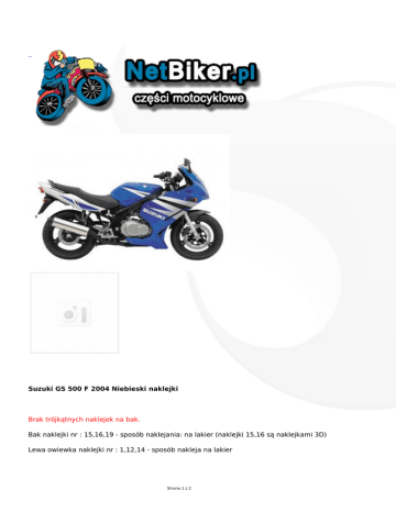 Suzuki GS 500 F 2004 Niebieski naklejki Brak trójkątnych naklejek na bak. Bak naklejki nr : 15,16,19 - sposób naklejania: na lakier (naklejki 15,16 są naklejkami 3D) Lewa owiewka naklejki nr : 1,12,14 - sposób nakleja na lakier Strona 1 z 2 Prawa owiewka naklejki nr : 2,11,13 - sposób naklejania: na lakier Zadupek naklejki nr : 3,4,5,6,7,8,17 - sposób naklejania: na lakier Czasza - naklejki nr : 9,10,18 - sposób naklejania: na lakier Zdjęcie poglądowe - przedstawia co znajduje się w zestawie. Na rózne kolory motocykla naklejki maja odpowiedni kolor. Istnieje możliwość zakupu naklejek na sztuki. Uwaga! Czas realizacji zamówienia może potrawać do 8 dni roboczych Strona 2 z 2