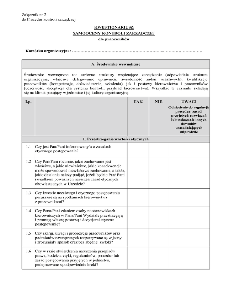 Załącznik nr 2 do Procedur kontroli zarządczej KWESTIONARIUSZ SAMOOCENY KONTROLI ZARZĄDCZEJ dla pracowników Komórka organizacyjna: ………………………………………………………..………………………. A. Środowisko wewnętrzne Środowisko wewnętrzne to: zarówno struktury wspierające zarządzanie (odpowiednia struktura organizacyjna, właściwe delegowanie uprawnień, świadomość zadań wrażliwych), kwalifikacje pracowników (kompetencje, doświadczenie, szkolenia), jak i postawy kierownictwa i pracowników (uczciwość, akceptacja dla systemu kontroli, przykład kierownictwa). Wszystkie te czynniki składają się na klimat panujący w jednostce i jej kulturę organizacyjną. Lp. TAK NIE UWAGI Odniesienie do regulacji: procedur, zasad, przyjętych rozwiązań lub wskazanie innych dowodów uzasadniających odpowiedź 1. Przestrzeganie wartości etycznych 1.1 Czy jest Pan/Pani informowany/a o zasadach etycznego postępowania? 1.2 Czy Pan/Pani rozumie, jakie zachowanie jest właściwe, a jakie niewłaściwe, jakie konsekwencje może spowodować niewłaściwe zachowanie, a także, jakie działania należy podjąć, jeżeli będzie Pan/ Pani świadkiem poważnych naruszeń zasad etycznych obowiązujących w Urzędzie? 1.3 Czy kwestie uczciwego i etycznego postępowania poruszane są na spotkaniach kierownictwa z pracownikami? 1.4 Czy Pana/Pani zdaniem osoby na stanowiskach kierowniczych w Pana/Pani Wydziale przestrzegają i promują własną postawą i decyzjami etyczne postępowanie? 1.5 Czy skargi, uwagi i propozycje pracowników oraz podmiotów zewnętrznych rozpatrywane są w jasny i zrozumiały sposób oraz bez zbędnej zwłoki? 1.6 Czy w razie stwierdzenia naruszenia przepisów prawa, kodeksu etyki, regulaminów, procedur lub zasad postępowania przyjętych w jednostce, podejmowane są odpowiednie kroki? Załącznik nr 2 do Procedur kontroli zarządczej 2. Kompetencje zawodowe 2.1 Czy Pan/Pani posiada aktualne pisemnie ustalone wymagania w zakresie wiedzy, umiejętności i doświadczenia konieczne do wykonywania zadań na poszczególnych stanowiskach pracy (np. zakresy obowiązków, opisy stanowisk pracy)? 2.2 Czy posiada Pan/Pani wiedzę i umiejętności konieczne do skutecznego realizowania zadań? 2.3 Czy został sporządzony odpowiedni plan szkoleń stosownie do Pana/Pani potrzeb? 2.4 Czy bierze Pan/Pani udział w szkoleniach w wystarczającym stopniu, aby skutecznie realizować powierzone zadania? 2.5 Czy jest Pan/Pani informowany/a o jakości wykonywania przez Pana/Panią zadań oraz udzielane są Panu/Pani konstruktywne rady i wskazówki służących poprawie? 2.6 Czy istniejące w Urzędzie procedury zatrudniania prowadzą do zatrudniania osób, które posiadają pożądane na danym stanowisku pracy wiedzę i umiejętności? 2.7 Czy proces rekrutacji jest jawny i otwarty dla wszystkich? 2.8 Czy przyjęte zasady awansowania i nagradzania zostały Panu/Pani jasno zakomunikowane? 3. Struktura organizacyjna 3.1. Czy struktura organizacyjna Pana/Pani Oddziału jest dostosowana do aktualnych jej celów i zadań? 3.2 Czy został określony w formie pisemnej zakres zadań Pana/Pani Oddziału w Wydziale, a także zakres zadań, uprawnień i odpowiedzialności w tym zakresie? 3.3 Czy ma Pan/Pani dostęp do aktualnego regulaminu organizacyjnego jednostki zawierającego zakres obowiązków i odpowiedzialności kierownictwa i poszczególnych Wydziałów? 4. Delegowanie uprawnień 4.1 Czy powierzenie uprawnień lub obowiązków dokonywane jest w drodze pisemnej, np. w formie upoważnienia czy pełnomocnictwa? Załącznik nr 2 do Procedur kontroli zarządczej 4.2 Czy przyjęcie uprawnień lub obowiązków towarzyszy przyjęciu odpowiedzialności za podejmowane decyzje lub dokonywane czynności? B. Cele i zarządzanie ryzykiem Niezbędnym warunkiem zarządzania ryzykiem jest określenie jasnych i spójnych celów całej jednostki. Dopiero po określeniu celów możliwa jest identyfikacja ryzyka, które może zagrozić ich osiągnięciu. Każde zidentyfikowane ryzyko powinno zostać poddane analizie pod kątem jego możliwych skutków i prawdopodobieństwa wystąpienia. Następnie określany jest stosunek do ryzyka, czyli poziom ryzyka akceptowalny w danej sytuacji jednostki, oraz sposób reakcji na każde zidentyfikowane ryzyko. Ostatnim elementem w cyklu zarządzania ryzykiem jest wdrożenie zaplanowanych działań oraz ich monitorowanie. Lp. TAK NIE UWAGI Odniesienie do regulacji: procedur, zasad, przyjętych rozwiązań lub wskazanie innych dowodów uzasadniających odpowiedź 5. Misja 5.1 Czy został określony ogólny cel istnienia Urzędu np. w postaci misji (poza statutem lub ustawą powołującą jednostkę)? 6. Określenie celów i zadań, monitorowanie i ocena ich realizacji 6.1 Czy w Urzędzie zostały określone cele do osiągnięcia lub zadania do realizacji w bieżącym roku w innej formie niż regulamin organizacyjny czy statut (np. jako plan pracy, plan działalności itp.)? 6.2 Czy cele i zadania Urzędu na bieżący rok mają określone mierniki, wskaźniki bądź inne kryteria, za pomocą, których można sprawdzić czy cele i zadania zostały zrealizowane? – należy odpowiedzieć tylko w przypadku, gdy odpowiedź na pytanie nr 6.1 brzmi TAK 6.3 Czy Pana/Pani bezpośredni przełożony na bieżąco monitoruje stan zaawansowania realizacji powierzonych Panu/Pani zadań? 7. Identyfikacja, analiza i reakcja na ryzyko 7.1 Czy w Pana/Pani Oddziale w udokumentowany sposób identyfikuje się i analizuje zagrożenia/ryzyka, które mogą przeszkodzić w realizacji celów i zadań (np. poprzez sporządzanie rejestru ryzyka lub innego dokumentu zawierającego zidentyfikowane zagrożenia/ryzyka)? Załącznik nr 2 do Procedur kontroli zarządczej 7.2 Czy w Pana/ Pani Oddziale w analizę ryzyka są zaangażowani wszyscy pracownicy? 7.3 Czy w Pana/Pani Oddziale zostały zaplanowane i wdrożone odpowiednie działania w stosunku do każdego ryzyka zgodnie