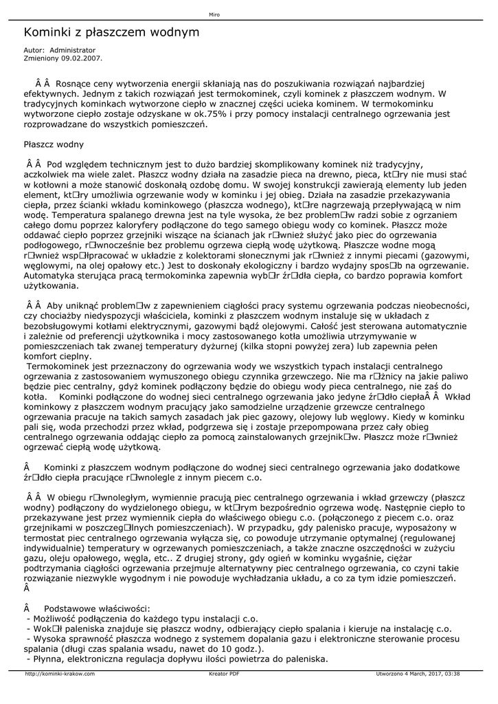 Miro Kominki z płaszczem wodnym Autor: Administrator Zmieniony 09.02.2007.   Rosnące ceny wytworzenia energii skłaniają nas do poszukiwania rozwiązań najbardziej efektywnych. Jednym z takich rozwiązań jest termokominek, czyli kominek z płaszczem wodnym. W tradycyjnych kominkach wytworzone ciepło w znacznej części ucieka kominem. W termokominku wytworzone ciepło zostaje odzyskane w ok.75% i przy pomocy instalacji centralnego ogrzewania jest rozprowadzane do wszystkich pomieszczeń. Płaszcz wodny   Pod względem technicznym jest to dużo bardziej skomplikowany kominek niż tradycyjny, aczkolwiek ma wiele zalet. Płaszcz wodny działa na zasadzie pieca na drewno, pieca, ktÃłry nie musi stać w kotłowni a może stanowić doskonałą ozdobę domu. W swojej konstrukcji zawierają elementy lub jeden element, ktÃłry umożliwia ogrzewanie wody w kominku i jej obieg. Działa na zasadzie przekazywania ciepła, przez ścianki wkładu kominkowego (płaszcza wodnego), ktÃłre nagrzewają przepływającą w nim wodę. Temperatura spalanego drewna jest na tyle wysoka, że bez problemÃłw radzi sobie z ogrzaniem całego domu poprzez kaloryfery podłączone do tego samego obiegu wody co kominek. Płaszcz może oddawać ciepło poprzez grzejniki wiszące na ścianach jak rÃłwnież służyć jako piec do ogrzewania podłogowego, rÃłwnocześnie bez problemu ogrzewa ciepłą wodę użytkową. Płaszcze wodne mogą rÃłwnież wspÃłłpracować w układzie z kolektorami słonecznymi jak rÃłwnież z innymi piecami (gazowymi, węglowymi, na olej opałowy etc.) Jest to doskonały ekologiczny i bardzo wydajny sposÃłb na ogrzewanie. Automatyka sterująca pracą termokominka zapewnia wybÃłr źrÃłdła ciepła, co bardzo poprawia komfort użytkowania.   Aby uniknąć problemÃłw z zapewnieniem ciągłości pracy systemu ogrzewania podczas nieobecności, czy chociażby niedyspozycji właściciela, kominki z płaszczem wodnym instaluje się w układach z bezobsługowymi kotłami elektrycznymi, gazowymi bądź olejowymi. Całość jest sterowana automatycznie i zależnie od preferencji użytkownika i mocy zastosowanego kotła umożliwia utrzymywanie w pomieszczeniach tak zwanej temperatury dyżurnej (kilka stopni powyżej zera) lub zapewnia pełen komfort cieplny. Termokominek jest przeznaczony do ogrzewania wody we wszystkich typach instalacji centralnego ogrzewania z zastosowaniem wymuszonego obiegu czynnika grzewczego. Nie ma rÃłżnicy na jakie paliwo będzie piec centralny, gdyż kominek podłączony będzie do obiegu wody pieca centralnego, nie zaś do kotła. Kominki podłączone do wodnej sieci centralnego ogrzewania jako jedyne źrÃłdło ciepła  Wkład kominkowy z płaszczem wodnym pracujący jako samodzielne urządzenie grzewcze centralnego ogrzewania pracuje na takich samych zasadach jak piec gazowy, olejowy lub węglowy. Kiedy w kominku pali się, woda przechodzi przez wkład, podgrzewa się i zostaje przepompowana przez cały obieg centralnego ogrzewania oddając ciepło za pomocą zainstalowanych grzejnikÃłw. Płaszcz może rÃłwnież ogrzewać ciepłą wodę użytkową.  Kominki z płaszczem wodnym podłączone do wodnej sieci centralnego ogrzewania jako dodatkowe źrÃłdło ciepła pracujące rÃłwnolegle z innym piecem c.o.   W obiegu rÃłwnoległym, wymiennie pracują piec centralnego ogrzewania i wkład grzewczy (płaszcz wodny) podłączony do wydzielonego obiegu, w ktÃłrym bezpośrednio ogrzewa wodę. Następnie ciepło to przekazywane jest przez wymiennik ciepła do właściwego obiegu c.o. (połączonego z piecem c.o. oraz grzejnikami w poszczegÃłlnych pomieszczeniach). W przypadku, gdy palenisko pracuje, wyposażony w termostat piec centralnego ogrzewania wyłącza się, co powoduje utrzymanie optymalnej (regulowanej indywidualnie) temperatury w ogrzewanych pomieszczeniach, a także znaczne oszczędności w zużyciu gazu, oleju opałowego, węgla, etc.. Z drugiej strony, gdy ogień w kominku wygaśnie, ciężar podtrzymania ciągłości ogrzewania przejmuje alternatywny piec centralnego ogrzewania, co czyni takie rozwiązanie niezwykle wygodnym i nie powoduje wychładzania układu, a co za tym idzie pomieszczeń.   Podstawowe właściwości: - Możliwość podłączenia do każdego typu instalacji c.o. - WokÃłł paleniska znajduje się płaszcz wodny, odbierający ciepło spalania i kieruje na instalację c.o. - Wysoka sprawność płaszcza wodnego z systemem dopalania gazu i elektroniczne sterowanie procesu spalania (długi czas spalania wsadu, nawet do 10 godz.). - Płynna, elektroniczna regulacja dopływu ilości powietrza do paleniska. http://kominki-krakow.com Kreator PDF Utworzono 4 March, 2017, 03:38 Miro - Centralka elektroniczna steruje pracą kominka i dopływem tlenu do paleniska. - Użytkownik może zaprogramować okres przedmuchu, czas przedmuchu, temperaturę załączania pompy cyrkulacyjnej, pompy c.w.u., wydajność dmuchawy. - lość dopływającego tlenu może być płynnie sterowana. Odbywa się to dzięki turbinie zasysającej powietrze z otoczenia i wtłaczającej je do komory spalania. Umożliwia to także dokładna kontrolę procesu spalania. - Po zrealizowaniu temperatury zadanej, kominek automatycznie odłącza inne urządzenia takie jak kocioł gazowy, olejowy czy elektryczny. - Tanie źrÃłdło energii. Drewno kominkowe należy do najtańszych źrÃłdeł energii. - Paląc nim w kominku ogrzewamy cały dom i podgrzewamy wodę. - Przygotowanie ciepłej wody użytkowej w zasobnikach od 100 do 500 litrÃłw. - Możliwość ogrzania od 100 do 250 m2 (stare budownictwo) i od 100 do 600 m2 powierzchni użytkowej (dom dobrze zrealizowany). Moc robocza od 18 do 32 kw. - Ogrzewanie niskotemperaturowe - zapobiega suchemu pyleniu. Dzięki zastosowaniu istniejącej instalacji c.o. do rozprowadzania ciepła, powietrze w mieszkaniu pozbawione jest spalonych drobin kurzu. - Bezpieczeństwo. Na wyposażeniu naczynie zbiorc
