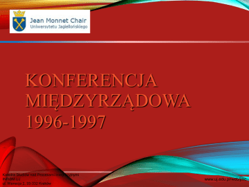 KONFERENCJA MIĘDZYRZĄDOWA 1996-1997 Katedra Studiów nad Procesami Integracyjnymi INPiSM UJ ul. Wenecja 2, 33-332 Kraków www.uj.edu.pl/web/jmc PODSTAWY PRAWNE KM 1996-1997: art. N TUE Katedra Studiów nad Procesami Integracyjnymi INPiSM UJ www.uj.edu.pl/web/jmc FAZA PRZYGOTOWAWCZA KM 1996-1997 1. Grupa Refleksyjna (2.06. – 5.12.1995 r.): 4 obszary reform ustrojowych: 1.1. Zmiany w systemie instytucjonalnym WE 1.2. Reforma WPZiB 1.3. Wzmocnienie aksjologii UE 1.4. Elastyczna integracja Katedra Studiów nad Procesami Integracyjnymi INPiSM UJ www.uj.edu.pl/web/jmc ZMIANY W SYSTEMIE INSTYTUCJONALNYM WE 1. Rada Unii Europejskiej 1.1. Jednomyślność w sprawach dotyczących art. N TUE i art. O TUE oraz systemu zasobów własnych 1.2 KWG jako reguła, ale ustanowienie wyjątków chroniących ważne interesy narodowe PC 2. Komisja Europejska 2.1. Utrzymanie wyłącznego prawa KE do inicjatywy ustawodawczej 2.2. Zachowanie roli KE jako „strażnika traktatów” 2.3. Uprawnienia wykonawcze KE dzielone z RUE 2.4. Skład kolegium KE: Katedra Studiów nad Procesami Integracyjnymi INPiSM UJ www.uj.edu.pl/web/jmc ZMIANY W SYSTEMIE INSTYTUCJONALNYM WE (C.D.) 2.4.1. Każde PC co najmniej 1 komisarz 2.4.2. Zmniejszenie liczby komisarzy, ale wzmocnienie pozycji przewodniczącego KE (wybierany przez PE na wniosek RE, a następnie mianowany przez PE wraz z całym kolegium KE) 2.4.3. Niektórzy członkowie GRef: wprowadzenie zasady „jeden kraj – jeden komisarz” (ograniczenie liczby komisarzy PC, które dotąd miały po 2 komisarzy) 2.4.4. Inni członkowie GRef: kolegium KE 2 różne kategorie komisarzy: seniorów wyposażonych w prawo głosu i juniorów pozbawionych prawa głosu Katedra Studiów nad Procesami Integracyjnymi INPiSM UJ www.uj.edu.pl/web/jmc ZMIANY W SYSTEMIE INSTYTUCJONALNYM WE (C.D.) 3. Parlament Europejski 3.1. Zwiększenie liczby deputowanych do 700 osób 3.2. Ograniczenie liczby procedur ustawodawczych (współdecydowanie, zgoda i konsultacja) 3.3. Uproszczenie procedury współdecydowania i rozszerzenie zakresu jej stosowania na wszystkie przypadki, w których RUE podejmuje decyzje w trybie KWG 3.4. Wzmocnienie pozycji PN. Winny one otrzymywać w językach narodowych projekty aktów prawnych KE w celu dokonywania ich wstępnej analizy, zanim zajmie się nimi RUE Katedra Studiów nad Procesami Integracyjnymi INPiSM UJ www.uj.edu.pl/web/jmc ZMIANY W SYSTEMIE INSTYTUCJONALNYM WE (C.D.) 4. Trybunał Sprawiedliwości 4.1. Wzmocnienie uprawnień TS w dziedzinie WSiSW 4.2. Przedłużenie kadencji sędziów TS do 9 lat, ale bez możliwości ponownego powołania 5. Trybunał Obrachunkowy i Komitet Regionów Niektórzy członkowie GRef: TO i KR prawo do ochrony swoich prerogatyw przed TS Katedra Studiów nad Procesami Integracyjnymi INPiSM UJ www.uj.edu.pl/web/jmc ZMIANY W WPZIB 1. Wysoki przedstawiciel ds. WPZiB 1.1. Nominowany przez Radę ds. Ogólnych i umiejscowiony przy SG RUE 1.2. Niektórzy członkowie GRef: WP w KE, co zapewniałoby spójność pomiędzy WPZiB a innymi działaniami zewnętrznymi UE Katedra Studiów nad Procesami Integracyjnymi INPiSM UJ www.uj.edu.pl/web/jmc AKSJOLOGIA 1. Wzmocnienie aksjologii UE 1.1. Włączenie do art. F TUE [art. 6 TUE) zobowiązania PC do przestrzegania wartości UE pod rygorem sankcji, w tym zawieszenia w prawach członka Katedra Studiów nad Procesami Integracyjnymi INPiSM UJ www.uj.edu.pl/web/jmc ELASTYCZNA INTEGRACJA 1. Kryteria elastycznej integracji: 1.1. Winna być realizowana w poszanowaniu i rozwijaniu acquis communautaire jako całości oraz w obrębie jednolitych ram instytucjonalnych UE 1.2. Winny ją podejmować PC chcące szybciej realizować cele UE zawarte w traktatach 1.3. Udział w elastycznej integracji winien być zawsze dostępny dla pozostałych PC 2. Większość członków GRef: elastyczna integracja jedynie w filarach międzyrządowych (aby nie podważać spójności jednolitego rynku) Katedra Studiów nad Procesami Integracyjnymi INPiSM UJ www.uj.edu.pl/web/jmc OBRADY KM 1996-1997 1. RE (15-16.12.1995 r.): raport GRef jako podstawa obrad KM. Obrady KM odbywały się pod auspicjami prezydencji: I, IRL i NL 2. Projekt reformy WPZiB: F i D (luty 1996 r.): 2.1. Rezygnacja z głosowania jednomyślnego 2.2. Wprowadzenie do TUE klauzuli solidarności 2.3. Ustanowienie organu ds. planowania i analiz 2.4. Włączenie do UE misji petersberskich UZE inkorporacja UZE do UE 3. RE w Turynie (29-30.03.1996 r.) przyjęła program prac KM, obejmujący 6 kierunków reform: Katedra Studiów nad Procesami Integracyjnymi INPiSM UJ www.uj.edu.pl/web/jmc OBRADY KM 1996-1997 3.1. Zmiany w systemie instytucjonalnym 3.1.1. Rozszerzenie zakresu stosowania KGW i nowa definicja KWG w RUE 3.1.2. Zmiany w składzie KE 3.1.3. Wzmocnienie PE przez rozszerzenie zakresu stosowania procedury współdecydowania 3.1.4. Zwiększenie uprawnień TS i TO 3.2. Rozszerzenie kompetencji UE w polityce wizowej, azylowej i imigracyjnej 3.3. Zbliżenie UE do obywateli: wzmocnienie aksjologii oraz efektywniejsza walka z bezrobociem 3.4. Zmiany w WPZiB (m.in. uregulowanie relacji między UE a UZE) Katedra Studiów nad Procesami Integracyjnymi INPiSM UJ www.uj.edu.pl/web/jmc OBRADY KM 1996-1997 3.5. Lepsze wykorzystanie zasady pomocniczości 3.6. Rozważenie możliwości ustanowienia WW 4. Prezydencja I: raport przejściowy, który nie rozwiązywał kluczowych zagadnień 5. Prezydencja IRL (5.12.1996 r.) - projekt TR: 5.1. Zmiany w systemie instytucjonalnym, w tym m.in. w II filarze UE 5.2. Utworzenie PWBiS w I filarze (polityka wizowa, azylowa i imigracyjna) 5.3. Zwiększenie roli PN w procesie legislacyjnym 5.4. Ustanowienie WW Katedra Studiów nad Procesami Integracyjnymi INPiSM UJ www.uj.edu.pl/web/jmc OBRADY KM 1996-1997 6. Zmiany instytucjonalne, najwięcej uwagi poświęcono RUE, KE i PE 6.1. Rada Unii Europejskiej 6.1.1. W pierwszej fazie obrad wszystkie PC, z wyjątkiem GB i S, poparły rozszerzenie zakresu stosowania KWG, ale później wiele z nich uzale