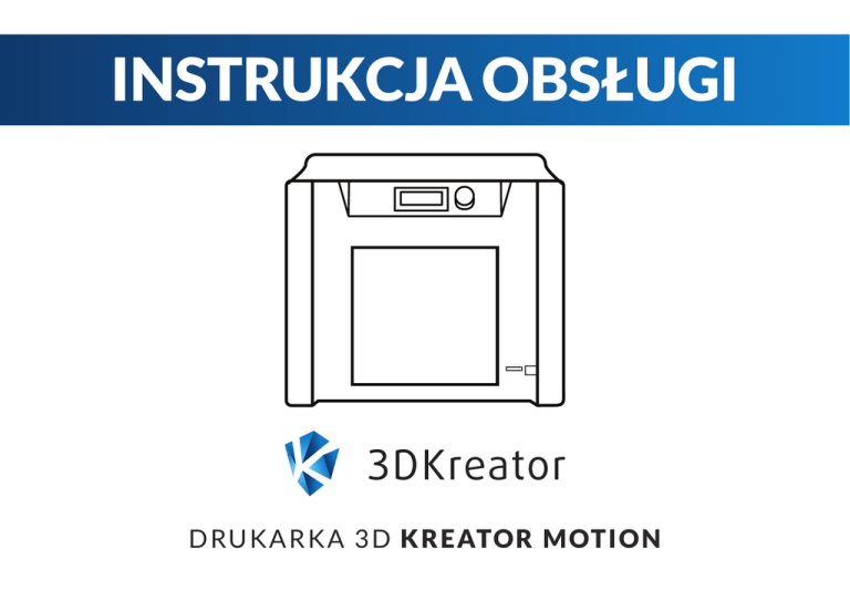 INSTRUKCJA OBSŁUGI DRUKARKA 3D KREATOR MOTION Witamy Witamy w gronie użytkowników drukarki Kreator Motion! Zapoznaj się z instrukcją obsługi urządzenia, zawarte w niej informacje pozwolą Ci na bezproblemową pracę z drukarką. 2 Spis treści 2 Witamy 12 3 Spis treści 14 Wyświetlacz 4 Informacje podstawowe 16 Kalibracja platformy roboczej 5 Drukarka Kreator Motion - zawartość zesawu 18 Montaż / Zmiana filamentu 6 Specyfikacja produktu 21 Drukowanie 8 Materiały do druku 22 Informacje dodatkowe 9 Wypakowywanie 23 Pomoc techniczna 11 Wyświetlacz i sterowanie Pierwsze uruchomienie 3 Informacje podstawowe BEZPIECZEŃSTWO UWAGI OGÓLNE Przed rozpoczęciem użytkowania drukarki Kreator Motion zalecamy dokładne zapoznanie się z instrukcją. Podczas pracy drukarki nie należy dotykać: modelu, głowicy i stołu roboczego; niestosowanie się do powyższego ostrzeżenia grozi poparzeniem i/lub deformacją wydruku, Należy pamiętać, aby po ukończeniu wydruku odczekać, aż elementy drukarki ostygną, ŚRODKI OSTROŻNOŚCI Urządzenie zasilane jest prądem przemiennym 230V/50Hz. Należy podłączyć je do gniazda sieciowego wyposażonego w kołek ochronny (uziemienie), aby uniknąć porażenia prądem w przypadku ewentualnej usterki. Miejsce instalacji urządzenia powinno spełniać następujące warunki: w pomieszczeniu należy zapewnić stosowną do jego wielkości wentylację, drukarka musi być umieszczona na płaskiej, stabilnej powierzchni. Nie wolno instalować urządzenia: na zewnątrz budynków, w miejscach zawilgoconych lub narażonych na zalanie, w sąsiedztwie substancji łatwopalnych i źródeł ciepła. Podczas wydruku nie należy umieszczać innych przedmiotów w obszarze pracy drukarki, ponieważ grozi to uszkodzeniem drukarki, Należy używać rękawic i mieć założone okulary podczas zdejmowania modelu z platfomy, Nieletni mogą używać drukarki tylko i wyłącznie pod opieką dorosłych, Dodatkowe narzędzia powinny być przechowywane z dala od nieletnich. 4 Drukarka Kreator Motion ZAWARTOŚĆ ZESTAWU 1x szpula z filamentem 1x 1x drukarka 3D Kreator Motion karta gwarancyjna 1x pudełko z narzędziami i zestaw kabli 1x Quick Start 5 Specyfikacja produktu PARAMETRY WYMIARY FIZYCZNE Technologia drukowania Fused Filament Fabrication Wymiary drukarki 519 x 395 x 420 mm Obszar roboczy wydruku 200 x 200 x 190 mm Wymiary opakowania 650 x 535 x 563 mm Rozdzielczość wydruku do 60 mikronów Waga urządzenia 18 kg Precyzja pozycjonowania do 10 mikronów Waga przesyłki 22 kg Średnica dyszy drukującej 0.4 mm Średnica filamentu (materiału wsadowego) 1.75 mm Maksymalna temperatura głowicy drukującej 260 °C Maksymalna temperatura platformy wydruku 110 °C ZASILANIE Gniazdo zasilania TEMPERATURA Temperatura pracy 15 - 350C Temperatura przechowywania 0 - 350C 230 V AC / 50 Hz 6 Specyfikacja produktu 1 2 11 3 4 5 6 7 8 9 10 12 13 14 1. Panel LCD 6. Komora robocza 11. Pokrywa 2. Pokrętło sterujące 7. Czytnik kart SD 12. Komora filamentu 3. Głowica z ekstruderem 8. Gniazdo USB 13. Czujnik filamentu 4. Stół roboczy 9. Włącznik 14. Uchwyt szpuli 5. Platforma stołu 10. Gniazdo zasilania 7 Materiały do druku W ofercie 3DKreator znajdziesz dedykowane filamenty dla drukarki Kreator Motion. Są one gwarancją udanych wydruków i bezproblemowej pracy z urządzeniem. Szczegółowe informacje na ich temat znajdziesz na: www.3dkreator.com 8 Wypakowanie WYPAKOWANIE I PIERWSZE URUCHOMIENIE 4x 1. 1. Umieść paczkę na płaskim, stabilnym podłożu, następnie otwórz pudło zewnętrzne. 2. 2. Wyciągnij pudło wewnętrzne. 3. 3. Usuń cztery narożniki. 4. kartonowe 4. Unieś pudełko wewnętrzne do góry, aż do momentu, gdy zobaczysz drukarkę. Schowaj wszystkie elementy opakowania do dużego kartonu – przydadzą się przy transporcie drukarki. 9 Wypakowanie WYPAKOWANIE I PIERWSZE URUCHOMIENIE 6. Zalecamy przecinanie opaski zabezpieczającej z prawej strony głowicy drukujacej. 5. 5. Zlokalizuj plastikową obejmę transportową, która zabezpiecza głowicę przed ruchem podczas transportu. Zaznaczono ją na żółto na powyższych grafikach. 6. Przetnij opaskę i usuń ją z wnętrza drukarki. 10 Pierwsze uruchomienie WYPAKOWANIE I PIERWSZE URUCHOMIENIE 7. 7. Wyjmij pudełka znajdujące się pod stołem roboczym użyj odrobiny siły, ze względu na ciasne osadzenie pudełek. 8. 8. Podłącz kabel zasilania do gniazdka znajdującego się się na tylnej ścianie drukarki oraz włóż wtyczkę do gniazdka sieci elektrycznej. 9. 9. Włącz drukarkę przyciskiem znajdujacym się nad gniazdem zasilania. 10. 10. Komora drukarki powinna podświetlić się na kolor niebieski co oznacza, że znajduje się w trybie czuwania. 11 Wyświetlacz i sterowanie PIERWSZY EKRAN STARTOWY 4 5 1 2 3 3DKREATOR Z: 23/ 00 P H : 23/ 00 R Silnik wyl. Po uruchomieniu drukarki na wyświetlaczu pojawia się ekran startowy. 1. Temperatura głowicy drukującej: 5.00 100% 2. Temperatura platformy druku: aktualna/ustawiona. aktualna/ustawiona. 3. Aktualny status drukarki. 4. Aktualna pozycja stolika od pozycji zerowej wyrażona w milimetrach. 5. Bieżąca prędkość drukowania, której wartość 100% odpowiada prędkości zdefiniowanej w mm/s dla każdego pliku g-code podczas jego generowania. 12 Wyświetlacz i sterowanie DRUGI EKRAN STARTOWY I STEROWANIE Przekręcenie pokrętła sterującego wywoła drugi ekran startowy 1 2 3 3DKREATOR o: 0 d 0:08:03 t: 0:01:13 F: 0.0 m 1. Całkowity czas pracy urządzenia. 2. Czas trwania aktualnego wydruku. 3. Całkowita ilość zużytego materiału (wyrażona w metrach). Do poruszania się po menu używamy pokrętła sterującego. Jego obrót w prawo lub w lewo powoduje przemieszczanie się pomiędzy wierszami menu w dół lub w górę. Kliknięcie pokrętła to wybór aktualnie zaznaczonej zakładki lub akceptacja zaznaczonej opcji. 13 Wyświetlacz MENU GŁÓWNE Wejście do głównego menu następuje po kliknięciu pokrętła sterującego. Powrot Drukowanie Zmien fi