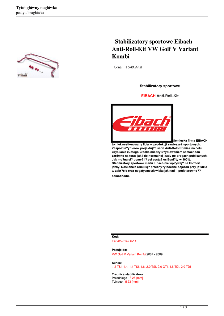 Tytuł główny nagłówka podtytuł nagłówka Stabilizatory sportowe Eibach Anti-Roll-Kit VW Golf V Variant Kombi Cena: 1 549.99 zł Stabilizatory sportowe EIBACH Anti-Roll-Kit Niemiecka firma EIBACH to niekwestionowany lider w produkcji zawiesze? sportowych. Zespó? in?ynierów projektuj?c serie Anti-Roll-Kit mia? na celu uzyskanie z?otego ?rodka miedzy u?ytkowaniem samochodu zarówno na torze jak i do normalnej jazdy po drogach publicznych. Jak mo?na si? domy?li? cel zosta? osi?gni?ty w 100%. Stabilizatory sportowe marki Eibach nie wp?ywaj? na komfort jazdy. Doskonale redukuj? przechy?y boczne pojazdu przy je?dzie w zakr?cie oraz negatywne zjawiska jak nad- i podsterowno?? samochodu. Kod: E40-85-014-06-11 Pasuje do: VW Golf V Variant Kombi 2007 - 2009 Silniki: 1.2 TSI, 1.4, 1.4 TSI, 1.6, 2.0 TSI, 2.0 GTI, 1.6 TDI, 2.0 TDI ?rednica stabilizatora: Przedniego - fi 26 [mm] Tylnego - fi 23 [mm] 1/3 Tytuł główny nagłówka podtytuł nagłówka Regulacja: Przodu - 2-stopniowa regulacja Ty?u - 2-stopniowa regulacja Uwagi: - Poza modelami z nap?dem 4x4 (4WD) - Bez systemu samopoziomowania (nivo) - Tylko w po??czeniu ze spr??ynami marki Eibach lub seryjnym zawieszeniem - W niektórych przypadkach konieczne jest zastosowanie dodatkowych cz??ci OE (pierwszego wyposa?enia). Cz??ci te nie znajduj? si? w zestawie. Prosz? zweryfikowa? na podstawie dokumentacji technicznej (TUV, instrukcja monta?u), która dost?pna jest do wgl?du na stronie Eibach Firma Tomas Tuning jest oficjalnym dystrybutorem firmy Eibach. Kupuj?c w naszym sklepie masz pewno??, ?e otrzymasz produkt zgodny z opisem, z legalnej dystrybucji, ca?kowicie nowy oraz na gwarancji producenta 24 miesi?ce. Monta? powinien by? przeprowadzany w specjalistycznym warsztacie. Pozycja monta?u (góra-dó?) oznaczona jest poprzez nadruk - u?o?enie tekstu sugeruje prawid?ow? pozycj?. Po monta?u spr??yn/elementów zawieszenia, nale?y sprawdzi? geometri? kó?. Je?li oryginalne amortyzatory s? mocno zu?yte, zaleca si? za?o?enie nowych standardowych, lub sportowych. Wszystkie dopuszczalne przez producenta kombinacje ko?o / opona s? mo?liwe do zastosowania po za?o?eniu spr??yn. Dobieraj?c produkt nale?y opiera? si? na danych w certyfikacie TÜV lub dokumencie ABE. Prosz? przed monta?em porówna? oznaczenia na otrzymanym produkcie z oznaczeniami zawartymi w TÜV lub dokumencie ABE (do??czane do paczek lub dost?pne do pobrania na www.eibach.com). W przypadku stwierdzenia rozbie?no?ci zestawu nie nale?y montowa? - prosimy w takim wypadku o kontakt ze sprzedawc?. W zale?no?ci od wersji silnikowej, skrzyni biegów, wyposa?enia i tolerancji producenta auta, warto?ci obni?enia mog? odbiega? o par? mm od warto?ci wskazanych w niniejszym katalogu. Warto?? obni?enia b?dzie stosunkowo ni?sza w przypadku seryjnego (fabrycznego) obni?enia(np. zawieszenie mtechnik, s-line itp.). Wszystkie podane dane odnosz? si? do fabrycznych, nowych pojazdów. Zastosowanie naszych produktów odnosi si? do seryjnych pojazdów. Wszystkie spr??yny EIBACH posiadaj? certyfikat TUV. 2/3 Tytuł główny nagłówka podtytuł nagłówka Powy?sze zdj?cia s? przyk?adowe. 3/3 Powered by TCPDF (www.tcpdf.org)