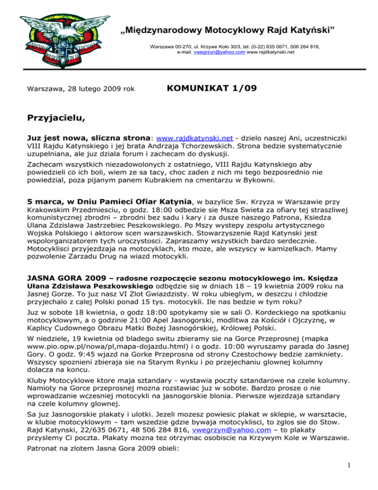 „Międzynarodowy Motocyklowy Rajd Katyński” Warszawa 00-270, ul. Krzywe Koło 30/3, tel. (0-22) 635 0671, 506 284 816, e-mail. [email protected] www.rajdkatynski.net Warszawa, 28 lutego 2009 rok KOMUNIKAT 1/09 Przyjacielu, Juz jest nowa, sliczna strona: www.rajdkatynski.net - dzielo naszej Ani, uczestniczki VIII Rajdu Katynskiego i jej brata Andrzaja Tchorzewskich. Strona bedzie systematycznie uzupelniana, ale juz dziala forum i zachecam do dyskusji. Zachecam wszystkich niezadowolonych z ostatniego, VIII Rajdu Katynskiego aby powiedzieli co ich boli, wiem ze sa tacy, choc zaden z nich mi tego bezposrednio nie powiedzial, poza pijanym panem Kubrakiem na cmentarzu w Bykowni. 5 marca, w Dniu Pamieci Ofiar Katynia, w bazylice Sw. Krzyza w Warszawie przy Krakowskim Przedmiesciu, o godz. 18:00 odbedzie sie Msza Swieta za ofiary tej straszliwej komunistycznej zbrodni – zbrodni bez sadu i kary i za dusze naszego Patrona, Ksiedza Ulana Zdzislawa Jastrzebiec Peszkowskiego. Po Mszy wystepy zespolu artystycznego Wojska Polskiego i aktorow scen warszawskich. Stowarzyszenie Rajd Katynski jest wspolorganizatorem tych uroczystosci. Zapraszamy wszystkich bardzo serdecznie. Motocyklisci przyjezdzaja na motocyklach, kto moze, ale wszyscy w kamizelkach. Mamy pozwolenie Zarzadu Drug na wiazd motocykli. JASNA GORA 2009 – radosne rozpoczęcie sezonu motocyklowego im. Księdza Ułana Zdzisława Peszkowskiego odbędzie się w dniach 18 – 19 kwietnia 2009 roku na Jasnej Gorze. To juz nasz VI Zlot Gwiazdzisty. W roku ubieglym, w deszczu i chlodzie przyjechalo z calej Polski ponad 15 tys. motocykli. Ile nas bedzie w tym roku? Juz w sobote 18 kwietnia, o godz 18:00 spotykamy sie w sali O. Kordeckiego na spotkaniu motocyklowym, a o godzinie 21:00 Apel Jasnogorski, modlitwa za Kościół i Ojczyznę, w Kaplicy Cudownego Obrazu Matki Bożej Jasnogórskiej, Królowej Polski. W niedziele, 19 kwietnia od bladego switu zbieramy sie na Gorce Przeprosnej (mapka www.pio.opw.pl/nowa/pl,mapa-dojazdu.html) i o godz. 10:00 wyruszamy parada do Jasnej Gory. O godz. 9:45 wjazd na Gorke Przeprosna od strony Czestochowy bedzie zamkniety. Wszyscy spoznieni zbieraja sie na Starym Rynku i po przejechaniu glownej kolumny dolacza na koncu. Kluby Motocyklowe ktore maja sztandary - wystawia poczty sztandarowe na czele kolumny. Namioty na Gorce przeprosnej mozna rozstawiac juz w sobote. Bardzo prosze o nie wprowadzanie wczesniej motocykli na jasnogorskie blonia. Pierwsze wjezdzaja sztandary na czele kolumny glownej. Sa juz Jasnogorskie plakaty i ulotki. Jezeli mozesz powiesic plakat w sklepie, w warsztacie, w klubie motocyklowym – tam wszedzie gdzie bywaja motocyklisci, to zglos sie do Stow. Rajd Katynski, 22/635 0671, 48 506 284 816, [email protected] – to plakaty przyslemy Ci poczta. Plakaty mozna tez otrzymac osobiscie na Krzywym Kole w Warszawie. Patronat na zlotem Jasna Gora 2009 obieli: 1 Przeor Jasnej Gory - Ojciec Roman Majewski Prezydent Czestochowy Pan dr Tadeusz Wrona IX Rajd Katyński wystartuje z Warszawy 29 sierpnia i wracamy 14 wrzesnia 2009. Pierwszy etap Warszawa - Lwow. Juz mozna planowac urlopy. Zaczniemy od Lwowa. (Trasa w zalaczenu) Odwiedzimy rowniez Hute Pieniacka, gdzie 65 lat temu, wlasnie dzis, 28 lutego, ukrainscy bandyci z UPA i SS Galizien wymordowali mieszkancow i spalili polska wioske. Zachecam do przeczytania tych przypadkowo wybranych linkow: http://www.rp.pl/artykul/10,269584_Polakow_spalili_tam_zywcem_.html http://www.npw.pl/ARCHIWUM_NPW/2001_03_04/PiP-Prus_Requiem-nadzamordowanym.html Rajd Ojcow Naszych Starym Szlakiem – pojedzie w tym roku do Budslawia, obecnie na Bialorusi. Tam, w pobernardynskim kosciele p. w. Wniebowziecia NMP, jest obecnie Narodowe Sanktuarium Maryjne Bialorusi. 2 lipca, na uroczystość Najświętszej Maryi Panny przychodzi, czasem przyjezdza 30 tys. pielgrzymow. W ubieglym roku po raz pierwszy pielgrzymowali tam motocyklisci. Poraz pierwszy pojawily sie bialoczerwone churagiewki. Wrazena niesamowite. Pielgrzymka potrwa ok. 10 dni. Pojedziemy szlakiem Mickiewicza. Spotkamy Polakow, dzieci w sierocincach. Mocne przezycia. Szczegoly podamy w nastepnych Komunikatach. Nasz Kolega, wielokrotny uczestnik Rajdow Katynskich, inz. gornik Mirek Wenglorz zaprasza na bardzo ciekawa wycieczke: Wzorem lat ubiegłych zapraszam wszystkich chętnych motocyklistów na trzecie spotkanie na Śląsku Cieszyńskim. Jak co roku celem naszego spotkania będzie: - poznanie historii Ziemi Cieszyńskiej rozdzielonej w 1918 roku między dwa organizmy państwowe – Polskę i Czechy, - złożenie hołdu polskim żołnierzom poległym i pomordowanym w czasie najazdu czeskiego w styczniu 1919 r., - spotkanie z dziećmi ze szkoły polskiej oraz Polakami mieszkającymi na Zaolziu, - złożenie hołdu polskim lotnikom Żwirce i Wigurze w miejscu ich tragicznej śmierci w Cierlicku koło Cieszyna, - poznanie historii i dnia dzisiejszego górnictwa węgla kamiennego, tym razem zwiedzimy zabytkową kopalnię w Zabrzu oraz poznamy historię Starej Karwiny (tej z opowiadań Gustawa Morcinka), - poznanie atrakcji turystycznych Ziemi Cieszyńskiej, a zwłaszcza urokliwych zakątków Beskidów i pośmiganie po górskich winklach w trzech krajach ( Polsce, Czechach i Słowacji ), - dla chętnych zwiedzenie Zameczku Prezydenckiego w Wiśle (zameczek ofiarowany przez lud Śląska dla prezydenta Mościckiego), - zwiedzenie muzeum motocykli „Rdzawe Diamenty” w Ustroniu. III Spotkanie motocyklistów na Śląsku Cieszyńskim odbędzie się w dniach 26-30.04.2009 r., czyli zaraz po zakończeniu tygodniowego rajdu do Dachau. Wyjazd motocyklistów na Śląsk Cieszyński planowany jest w niedzielę 26.04.2009r. o godz. 9.00 z parkingu przy Domu Pielgrzyma na Jasnej Górze w Częstochowie. Szczegółowy program realizacji wyżej wymienionych celów naszego spotkania zostanie opracowany w terminie późniejszym i rozesłany do wszystkich zgłoszonych do udziału. Zgłoszenia przyjmowane będą do 15.03.2009 r. pocztą