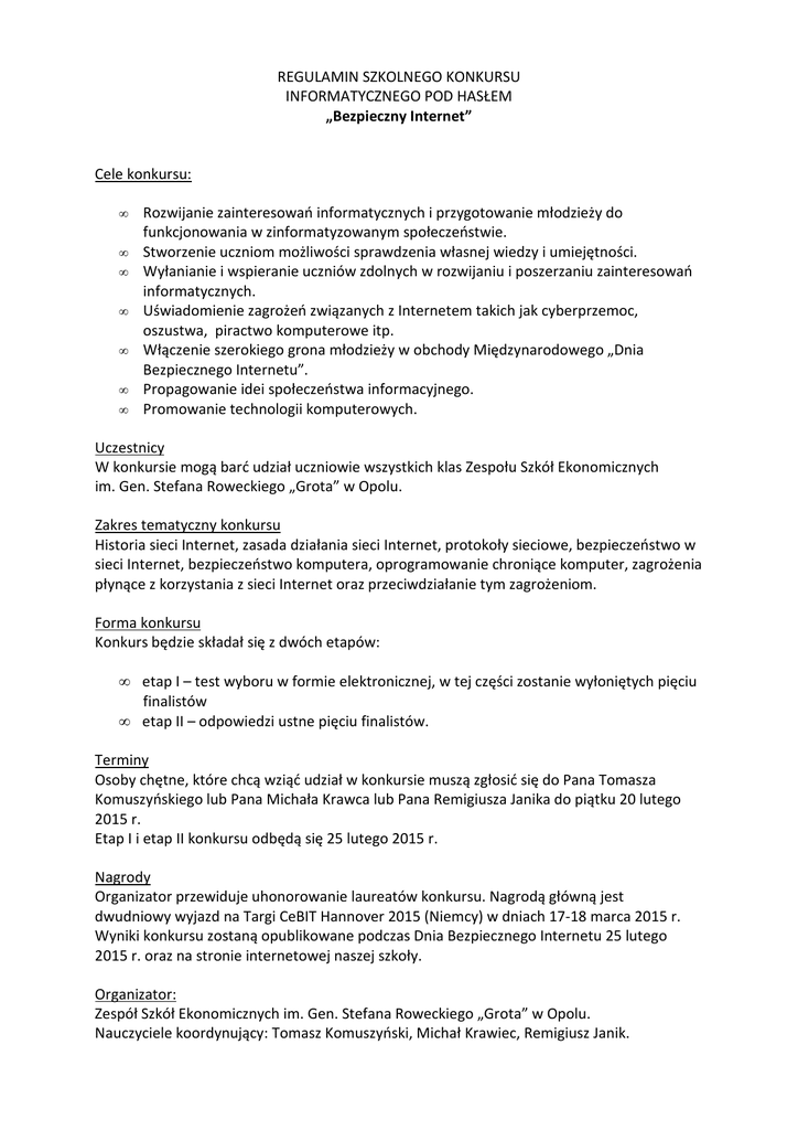 REGULAMIN SZKOLNEGO KONKURSU INFORMATYCZNEGO POD HASŁEM „Bezpieczny Internet” Cele konkursu: • • • • • • • Rozwijanie zainteresowań informatycznych i przygotowanie młodzieży do funkcjonowania w zinformatyzowanym społeczeństwie. Stworzenie uczniom możliwości sprawdzenia własnej wiedzy i umiejętności. Wyłanianie i wspieranie uczniów zdolnych w rozwijaniu i poszerzaniu zainteresowań informatycznych. Uświadomienie zagrożeń związanych z Internetem takich jak cyberprzemoc, oszustwa, piractwo komputerowe itp. Włączenie szerokiego grona młodzieży w obchody Międzynarodowego „Dnia Bezpiecznego Internetu”. Propagowanie idei społeczeństwa informacyjnego. Promowanie technologii komputerowych. Uczestnicy W konkursie mogą barć udział uczniowie wszystkich klas Zespołu Szkół Ekonomicznych im. Gen. Stefana Roweckiego „Grota” w Opolu. Zakres tematyczny konkursu Historia sieci Internet, zasada działania sieci Internet, protokoły sieciowe, bezpieczeństwo w sieci Internet, bezpieczeństwo komputera, oprogramowanie chroniące komputer, zagrożenia płynące z korzystania z sieci Internet oraz przeciwdziałanie tym zagrożeniom. Forma konkursu Konkurs będzie składał się z dwóch etapów: • etap I – test wyboru w formie elektronicznej, w tej części zostanie wyłoniętych pięciu finalistów • etap II – odpowiedzi ustne pięciu finalistów. Terminy Osoby chętne, które chcą wziąć udział w konkursie muszą zgłosić się do Pana Tomasza Komuszyńskiego lub Pana Michała Krawca lub Pana Remigiusza Janika do piątku 20 lutego 2015 r. Etap I i etap II konkursu odbędą się 25 lutego 2015 r. Nagrody Organizator przewiduje uhonorowanie laureatów konkursu. Nagrodą główną jest dwudniowy wyjazd na Targi CeBIT Hannover 2015 (Niemcy) w dniach 17-18 marca 2015 r. Wyniki konkursu zostaną opublikowane podczas Dnia Bezpiecznego Internetu 25 lutego 2015 r. oraz na stronie internetowej naszej szkoły. Organizator: Zespół Szkół Ekonomicznych im. Gen. Stefana Roweckiego „Grota” w Opolu. Nauczyciele koordynujący: Tomasz Komuszyński, Michał Krawiec, Remigiusz Janik.