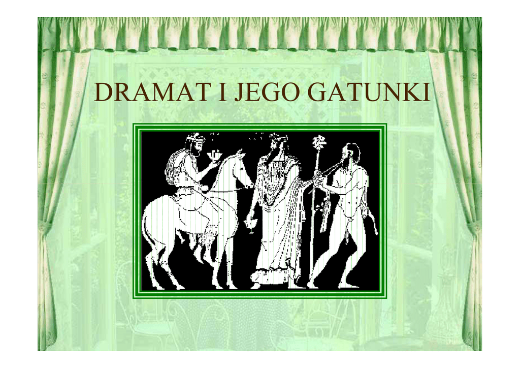 DRAMAT I JEGO GATUNKI Dramat (gr. drama = działanie) - jeden z trzech rodzajów literackich oparty na konstrukcji fabularnej, obejmujący utwory przeznaczone do realizacji teatralnej z dominacją dialogu. Rodzaj literacki, powstały w starożytnej Grecji, wywodzący się z pieśni pochwalnych, śpiewany w czasie misteriów dionizyjskich. Rozwinął się około V w. p.n.e. Cechy dramatu antycznego • • • • • • • podział na akty, sceny i odsłony tekst poboczny - didaskalia zasada decorum podzielony na role – 3 aktorów brak narratora kreowanie świata poprzez dialogi i monologi zasada trzech jedności - akcja trwająca 24 godziny, jedno miejsce wydarzeń, jeden problem • Istnienie chóru Krzywa dramatyczna Punkt kulminacyjny katastrofa prolog Rozwiązanie akcji Dramat antyczny Tragedia Komedia Ajschylos Arystofanes Sofokles Menander Eurypides Plaut Seneka Terencjusz Tragedia Tragedia oznacza pieśń kozłów - aktorów ubranych w koźle skóry mające ich upodobnić do satyrów. W VI wieku p.n.e. poeta Tespis wprowadził dialog między chórem a aktorem, były to początki tragedii. utwór, który przedstawia nieprzezwyciężalny konflikt między dążeniami jakiejś wybitnej osoby, a siłami wyższymi (Bogiem, bogami, losem, prawem, moralnością). Wszystkie dążenia bohatera prowadzą do nieuchronnej klęski. Często też do klęski popycha bohatera Hybris, czyli pycha i zaślepienie na prawdę Służy przeżyciu katharsis. Cechy tragedii Hibris – pycha, zaślepienie Hamatia – omyłka tragiczna Pathos – czyn tragiczny Katastrophe- katastrofa Gnosis – wiedza Katharsis - oczyszczenie Wyznaczniki tragedii wysoki styl wznisłośc bogactwo figur stylistycznych patos kommos stasimon Budowa tragedii • • • • • prolog - temat sztuki i charakter; wprowadzenie parados - pierwsza, wprowadzająca pieśń chóru epejsódion - część mówiona przez aktora, aktorów stásimon - część mówiona przez chór éxodos - kończy sztukę właściwą; zawiera kommos, czyli lament bohatera. Wg „Poetyki” Arystotelesa Dramat średniowieczny liturgiczny • misterium • moralitet • mirakle • dramat liturgiczny • intermedium • farsa Tragedia renesansowa Jan Kochanowski „(Odprawa W. Szekspir i jego twórczość posłów greckich”) Nawiązanie do wzorców antycznych Dramat humanistyczny Odrzucenie zasady decorum i trzech jedności, Luźna kompozycja, Łącznie tragedii z elementami epiki, liryki oraz fantastyki. Miejsce początkowego wystawiania DRAMATU BUDOWA TEATRU Kolejne etapy rozwoju dramatu XVIII w. - Dramat mieszczański 1 poł. XIX w. - Dramat romantyczny 2 poł. XIX w. - Dramat obyczajowo – psychologiczny XX w. -Dramat poetycki i groteskowy Dramat mieszczański Komedia łzawa Melodramat Dramat obyczajowopsychologiczny Drama mieszczański (XVIII w.) Przedstawienie o tematyce historycznej, obyczajowej sentymentalnej Posiada cechy dydaktyczne Upiększa świat Odmiana – łzawa komedia Dramat romantyczny Odrzucenie reguły trzech jedności, Wprowadzenie fabuły o luźnej kompozycji, dającej znaczną swobodę poszczególnym epizodom, Swobodne łączenie elementów dramatycznych z poetyckimi i epickimi. Twórcy: W. Hugo, J. Słowacki, Z. Krasiński, A. Mickiewicz. Dramat obyczajowo-psychologiczny, dramat poważny = dramat właściwy Idea realizmu Konsekwentna akcja Niewielka liczba postaci, dokładnie określone ideologicznie Język potoczny A. Czechow (Trzy siostry, Czajka, Wiśniowy sad) G. Zapolska (Żabusia) Dramat poetycki Swobodna kompozycja Poetyckość języka Symbole i metafory Elementy przypowieści Komedia Cechy charakterystyczne: pogodna tematyka, żywa akcja, zamknięta rozwiązaniem pomyślnym dla bohaterów, operowanie chwytami komizmu sytuacyjnego, charakterologicznego i językowego, wyjaskrawienia i groteska cel: wywołanie śmiechu u widza. Komedia wyrosła z dwóch źródeł: pierwsze attyckie – stanowiły je obrzędy dionizyjskie, w których śpiewane były swawolne i satyryczne piosenki towarzyszące wesołym pochodom ku czci Dionizosa, drugie doryckie – były nim mimy ludowe, improwizowane scenki rodzajowe lub mitologiczne. Rozwój komedii Za prekursora uznaje się Epicharma; do głównych przedstawicieli zalicza się : Kratinosa, Eupolisa, Frynicha, Ferekratesa Arystofanesa (m.in. Chmury, Ptaki, Żaby, Rycerze, Plutos, Lizystrata). Antyfanesa, Aleksisa, Eubulosa. Difilosa, Filemona, Menandra (m.in. Pochlebca, Bliźnięta, Sąd rozjemczy), Apollodora z Karystos. Pod jej wpływem rozwinęła się komedia rzymska (Plaut, Terencjusz). Akcja komedii starożytnej nie była konsekwentna, mogła składać się z epizodów, zmian sytuacyjnych, przeszkód, pomyłek, nieporozumień. Comedia dell’arte (wł. commedia dell’arte= sztuka, sztuczka) Źródłami sięga: zarówno sztuk mimu oraz ludowego teatru artystycznego, jak i występów żonglerów i linoskoczków w średniowieczu. Arlekin Dottore Capitano Pantalone Początek nowożytnym formom komedii dała epoka renesansu. Skrystalizowało się wiele jej odmian tematycznokompozycyjnych, po części nawiązujących do doświadczeń komedii antycznej, z których zasadnicze to komedia sytuacji (a w jej obrębie komedia intrygi), komedia charakterów, komedia satyryczna (w jej obrębie komedia obyczajowa i komedia polityczna). Komedia sytuacji akcja obfitująca w konflikty, powikłania sytuacyjne, zbiegi okoliczności i nagłe zmiany kierunku akcji, zaskakujące zarówno bohaterów w niej uczestniczących, jak i widzów, Np. „Komedia omyłek”, „Wieczór Trzech Króli” Szekspira, „Wesele Figara” Baumarchais'go, „Mąż i żona” A. Fredry. Wesela Figara w warszawskim Teatrze Wielkim Komedia charakterów przed akcję wysuwają się sylwetki moralne i psychologiczne bohaterów, postacie są zwykle podporządkowane jakiejś jednej cesze charakteru lub namiętności, która kieruje ich czynami i określa stosunki z otoczeniem, Np. „Poskromienie złośnicy”, „Kupiec weneck