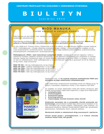 CENTRUM PROFILAKTYKI ZIOŁOWEJ I ZDROWEGO ŻYWIENIA B I U L E T Y N c z e r w i e c 2 0 1 4 MIÓD MANUKA Coraz częściej w naszych domach Miód Manuka nie jest lekiem, lecz należąc do grupy żywności funkcjonalnej jest bardzo pomocny w wielu problemach zdrowotnych. dy Miód Manuka produkują pszczoły, które żywią się nektarem z krzewu herbacianego Manuka. Rośnie on jedynie w Nowej Zelandii i prawdziwy miód powinien pochodzić właśnie stamtąd. /m io W roku 2008 prof. Thomas Henle z Politechniki w Dreźnie odkrył, że miód Manuka zawiera wysokie stężenie MGO / methylglyoxalu / silnego składnika antybakteryjnego, stałego i niezawodnego bez względu na warunki przetwarzania i przechowywania. Stwierdził również jego działanie przeciwzapalne, przeciwwirusowe, antyoksydacyjne, antyseptyczne i przeciwgrzybiczne. TM TM TM TM TM 30+ /30 mg methylglyoxalu na kg miodu/ 100+ /100mg methylglyoxalu n a kg miodu/ 250+ /250 mg methylglyoxalu na kg miodu / 400+ /400 mg methylglyoxalu na kg miodu/ 550+ /550 mg methylglyoxalu na kg miodu / ato re bk MGO MGO MGO MGO MGO a.p l/c ate g or y Methylglyoxol /MGO / jest naturalnym związkiem miodu i występuje w różnym stężeniu i tylko w niektórych miodach. Badania naukowe potwierdziły, iż jest głównym bakteriobójczym związkiem w miodzie Manuka. Należy być świadomym tego, że miody Manuka zawierają różne ilości MGO i w związku z tym różne jest ich oddziaływanie. Ilość methylglyoxolu w miodzie Manuka waha się w granicach od 30 do 1000mg na kg miodu, stąd oznaczenia: ww .zi elo n Wiadomym jest, że im wyższe stężenie methygloxalu-MGO tym silniejsze są jego właściwości antybakteryjne. ht tp :/ /w I tak właściwości terapeutyczne posiadają miody od 100mg na kg. W Polsce w sprzedaży znajdziemy miody o max stężeniu 550 MGO Ze względu na swoje właściwości miód jest bardzo skuteczny jako środek wzmacniający odporność organizmu, a jego silne właściwości: • antybakteryjne • przeciwzapalne • przeciwwirusowe • przeciwgrzybicze • wspomagają również leczenie wielu chorób Doskonale sprawdza się w przypadku chorób przewodu pokarmowego, potwierdzone zostało jego dobroczynne działanie w takich chorobach jak wrzody żołądka, nadkwasota, jelito drażliwe, czy zaburzenia trawienia. Hamuje rozwój bakterii takich jak: gronkowiec, paciorkowiec, helicobacter pylori, pałeczki jelitowe. Skutecznie działa w zakażeniach dróg moczowych i pęcherza. Chroni przed grypą i przeziębieniem, a w trakcie choroby zwalcza nieżyt nosa, ból gardła. Centrum Profilaktyki Ziołowej i Zdrowego Żywienia www.zielonatorebka.pl [email protected] strona 1 CENTRUM PROFILAKTYKI ZIOŁOWEJ I ZDROWEGO ŻYWIENIA B I U L E T Y N c z e r w i e c 2 0 1 4 MIÓD MANUKA Coraz częściej w naszych domach Miód smakowy, pyszny i wartościowy dodatek do codziennej zdrowej diety. Miód Manuka MGO 100+ Zwiększanie odporności przeciw popularnym infekcjom bakteryjnym, poprawa ogólnego samopoczucia. elo na to re bk a .pl /ca teg or y /m io dy Miód Manuka MGO 30+ Zwiększanie odporności i wsparcie przy odzyskiwaniu zdrowia w przypadku mniejszych, ale uciążliwych problemów zdrowotnych- wspomagająco przy lekkich i średnich przeziębieniach- wspomagająco przy lekkich postaciach problemów żołądkowych takich jak wrzody, helicobacter i refluks. /w ww .zi Miód Manuka MGO 250+ ht tp :/ Miód Manuka MGO 400+ Miód Manuka MGO 550+ Zwiększanie odporności i wsparcie przy odzyskiwaniu zdrowia w przypadku poważniejszych infekcji- wspomagająco przy przeziębieniach i grypie- wspomagająco przy problemach żołądkowych- wspomagająco przy problemach żołądkowych i jelitowych, takich jak wrzody, helicobacter, refluks, IBS- wspomagająco przy problemach skórnych (np. egzema, trądzik) i trudno gojących się ranach (np. stopa cukrzycowa, odleżyny, zakażenia bakteryjne). Wsparcie intensywnego leczenia trudnych i chronicznych infekcji- wspomagająco przy przeziębieniach i grypiewspomagająco przy problemach żołądkowych- wspomagająco przy problemach żołądkowych i jelitowych, takich jak wrzody, helicobacter, refluks, IBS- wspomagająco przy problemach skórnych (np. egzema, trądzik) i trudno gojących się ranach (np. stopa cukrzycowa, odleżyny, zakażenia bakteryjne) - wspomagająco przy trudnych infekcjach bakteryjnych (np. gronkowiec) Dane ze strony www.swiatmanuka.pl Centrum Profilaktyki Ziołowej i Zdrowego Żywienia www.zielonatorebka.pl [email protected] strona 2 CENTRUM PROFILAKTYKI ZIOŁOWEJ I ZDROWEGO ŻYWIENIA B I U L E T Y N c z e r w i e c 2 0 1 4 MIÓD MANUKA Coraz częściej w naszych domach Bardzo ważne jest właściwe stosowanie miodu. Podstawowa zasada to stosowanie miodu tak, by zachować najwyższe możliwe stężenie substancji działających nie rozcieńczając w wodzie czy herbacie. Spożywamy bezpośrednio 2 do 3 łyżek dziennie. Najlepiej rano na czczo jeszcze przed wypiciem jakichkolwiek płynów, wieczorem można spożyć miód już po wymyciu zębów, gdyż działa on również przeciwbakteryjnie na gardło i jamę ustną. dy Oto szczegółowy sposób spożywania miodu przy określonych problemach: /m io Przy wspomaganiu terapii problemów układu pokarmowego (wrzodu, helicobacter, refluks, IBS), najlepsze efekty przynosi spożywanie miodu 3 razy dziennie po dwie łyżeczki lub więcej, bez rozcieńczania i bez popijania wodą. Miód należy spożywać przynajmniej pół godziny przed posiłkiem. Układ oddechowy /ca teg or y W przypadku przeziębień, bólu gardła, kaszlu Miód Manuka należy spożywać rano i wieczorem, dwie lub więcej łyżeczek oraz dodatkowo niewielkie ilości kilka razy w ciągu dnia, spożywane powoli, co pomoże złagodzić dokuczliwość objawów infekcji. Odporność i dobre samopoczucie elo na to re bk a .pl Najlepsze efekty w budowaniu odporności i poprawie ogólnego samopoczucia przyniesie spożywaniu jednej – dwóch łyżeczek Miodu Manuka rano (na czc