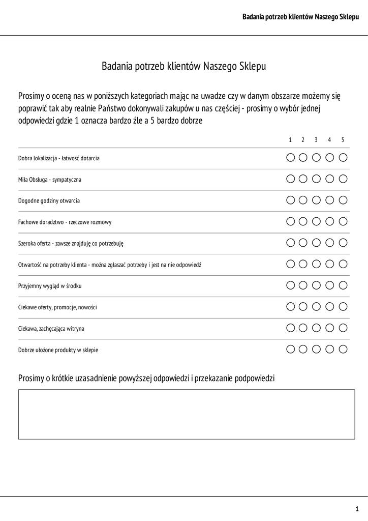 BadaniapotrzebklientówNaszegoSklepu BadaniapotrzebklientówNaszegoSklepu Prosimyoocenąnaswponiższychkategoriachmającnauwadzeczywdanymobszarzemożemysię poprawićtakabyrealniePaństwodokonywalizakupówunasczęściej-prosimyowybórjednej odpowiedzigdzie1oznaczabardzoźlea5bardzodobrze 1 2 3 4 5 Dobralokalizacja-łatwośćdotarcia MiłaObsługa-sympatyczna Dogodnegodzinyotwarcia Fachowedoradztwo-rzeczowerozmowy Szerokaoferta-zawszeznajdujęcopotrzebuję Otwartośćnapotrzebyklienta-możnazgłaszaćpotrzebyijestnanieodpowiedź Przyjemnywyglądwśrodku Ciekaweoferty,promocje,nowości Ciekawa,zachęcającawitryna Dobrzeułożoneproduktywsklepie Prosimyokrótkieuzasadnieniepowyższejodpowiedziiprzekazaniepodpowiedzi 1 BadaniapotrzebklientówNaszegoSklepu JakimipowodamikierująsięPaństwoprzywyborzenaszegosklepu-możnapodaćwięcejodpowiedzi Asortymentniedostępnywinnychsklepach-specjalizacjasklepu Wybieramtensklepbogolubię-popieramtensklep Fachowedoradztwo,jakośćobłsugi Atrakcyjneceny,promocje Żadnazpowyższych Którekategorieproduktówpowinniśmyrozwinąć?możnawybraćwięcejopcji SuperFood-nasiona,jagodyitp Suplementydiety Kosmetyki Środkiczystości Żywnośćekologiczna Żywnośćdladzieci Żywnośćcodzienna Zioła Leki Sprzętmedyczny Innejakie? Copowinniśmyzmienićwnaszejdziałalności,ojakieinneproduktyrozwinąćofertę? JakczęstodokonujecieunasPaństwozakupów? Kilkarazywtygodniu Razwtygodniu Razwmiesiącu Razwkwartale Rzadziej Obecniedokonuję Mógłbymgdybypoprawićopisanewankiecieelementy 2