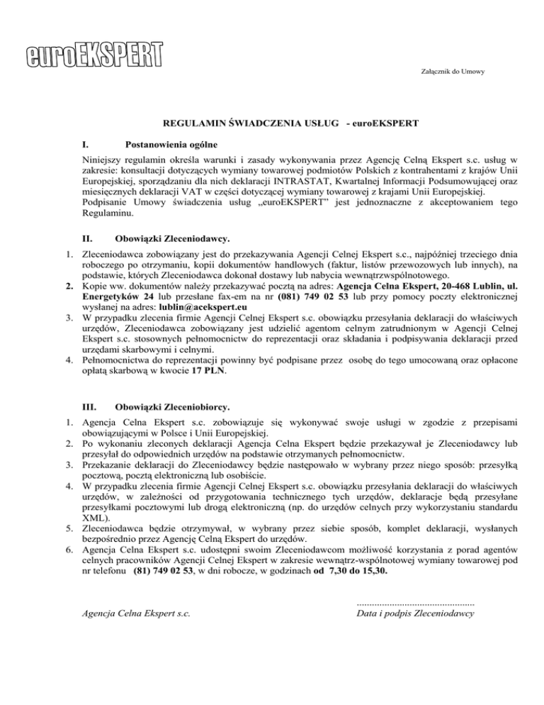 Załącznik do Umowy REGULAMIN ŚWIADCZENIA USŁUG - euroEKSPERT I. Postanowienia ogólne Niniejszy regulamin określa warunki i zasady wykonywania przez Agencję Celną Ekspert s.c. usług w zakresie: konsultacji dotyczących wymiany towarowej podmiotów Polskich z kontrahentami z krajów Unii Europejskiej, sporządzaniu dla nich deklaracji INTRASTAT, Kwartalnej Informacji Podsumowującej oraz miesięcznych deklaracji VAT w części dotyczącej wymiany towarowej z krajami Unii Europejskiej. Podpisanie Umowy świadczenia usług „euroEKSPERT” jest jednoznaczne z akceptowaniem tego Regulaminu. II. Obowiązki Zleceniodawcy. 1. Zleceniodawca zobowiązany jest do przekazywania Agencji Celnej Ekspert s.c., najpóźniej trzeciego dnia roboczego po otrzymaniu, kopii dokumentów handlowych (faktur, listów przewozowych lub innych), na podstawie, których Zleceniodawca dokonał dostawy lub nabycia wewnątrzwspólnotowego. 2. Kopie ww. dokumentów należy przekazywać pocztą na adres: Agencja Celna Ekspert, 20-468 Lublin, ul. Energetyków 24 lub przesłane fax-em na nr (081) 749 02 53 lub przy pomocy poczty elektronicznej wysłanej na adres: [email protected] 3. W przypadku zlecenia firmie Agencji Celnej Ekspert s.c. obowiązku przesyłania deklaracji do właściwych urzędów, Zleceniodawca zobowiązany jest udzielić agentom celnym zatrudnionym w Agencji Celnej Ekspert s.c. stosownych pełnomocnictw do reprezentacji oraz składania i podpisywania deklaracji przed urzędami skarbowymi i celnymi. 4. Pełnomocnictwa do reprezentacji powinny być podpisane przez osobę do tego umocowaną oraz opłacone opłatą skarbową w kwocie 17 PLN. III. Obowiązki Zleceniobiorcy. 1. Agencja Celna Ekspert s.c. zobowiązuje się wykonywać swoje usługi w zgodzie z przepisami obowiązującymi w Polsce i Unii Europejskiej. 2. Po wykonaniu zleconych deklaracji Agencja Celna Ekspert będzie przekazywał je Zleceniodawcy lub przesyłał do odpowiednich urzędów na podstawie otrzymanych pełnomocnictw. 3. Przekazanie deklaracji do Zleceniodawcy będzie następowało w wybrany przez niego sposób: przesyłką pocztową, pocztą elektroniczną lub osobiście. 4. W przypadku zlecenia firmie Agencji Celnej Ekspert s.c. obowiązku przesyłania deklaracji do właściwych urzędów, w zależności od przygotowania technicznego tych urzędów, deklaracje będą przesyłane przesyłkami pocztowymi lub drogą elektroniczną (np. do urzędów celnych przy wykorzystaniu standardu XML). 5. Zleceniodawca będzie otrzymywał, w wybrany przez siebie sposób, komplet deklaracji, wysłanych bezpośrednio przez Agencję Celną Ekspert do urzędów. 6. Agencja Celna Ekspert s.c. udostępni swoim Zleceniodawcom możliwość korzystania z porad agentów celnych pracowników Agencji Celnej Ekspert w zakresie wewnątrz-wspólnotowej wymiany towarowej pod nr telefonu (81) 749 02 53, w dni robocze, w godzinach od 7,30 do 15,30. Agencja Celna Ekspert s.c. ............................................... Data i podpis Zleceniodawcy