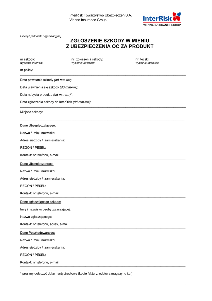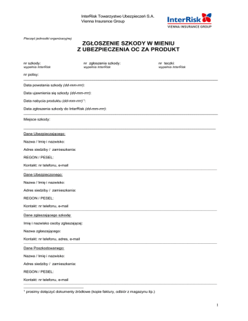 InterRisk Towarzystwo Ubezpieczeń S.A. Vienna Insurance Group Pieczęć jednostki organizacyjnej ZGŁOSZENIE SZKODY W MIENIU Z UBEZPIECZENIA OC ZA PRODUKT nr szkody: nr zgłoszenia szkody: nr teczki: wypełnia InterRisk wypełnia InterRisk wypełnia InterRisk nr polisy: _____________________________________________________________________________________________ Data powstania szkody (dd-mm-rrrr): Data ujawnienia się szkody (dd-mm-rrrr): Data nabycia produktu (dd-mm-rrrr) 1: Data zgłoszenia szkody do InterRisk (dd-mm-rrrr): _____________________________________________________________________________________________ Miejsce szkody: ____________________________________________________________________________________________ Dane Ubezpieczającego: Nazwa / Imię i nazwisko: Adres siedziby / zamieszkania: REGON / PESEL: Kontakt: nr telefonu, e-mail ___________________________________________________________________________________________________________________________________________ Dane Ubezpieczonego: Nazwa / Imię i nazwisko: Adres siedziby / zamieszkania: REGON / PESEL: Kontakt: nr telefonu, e-mail ___________________________________________________________________________________________________________________________________________ Dane zgłaszającego szkodę: Imię i nazwisko osoby zgłaszającej: Nazwa zgłaszającego: Kontakt: nr telefonu, adres, e-mail ___________________________________________________________________________________________________________________________________________ Dane Poszkodowanego: Nazwa / Imię i nazwisko: Adres siedziby / zamieszkania: REGON / PESEL: Kontakt: nr telefonu, e-mail ___________________________________________________________________________________________________________________________________________ 1 prosimy dołączyć dokumenty źródłowe (kopie faktury, odbiór z magazynu itp.) 1 InterRisk Towarzystwo Ubezpieczeń S.A. Vienna Insurance Group Dane sprawcy szkody: Nazwa / Imię i nazwisko: Adres siedziby / zamieszkania: REGON / PESEL: Kontakt: nr telefonu, e-mail __________________________________________________________________________________________ Świadkowie zdarzenia 2: Imię i nazwisko: Adres zamieszkania: Kontakt: nr telefonu, e-mail __________________________________________________________________________________________ Dokładny opis okoliczności zdarzenia (załączyć szkic) i zakres uszkodzeń 3: O zdarzeniu poinformowano TAK NIE Dokładny adres i telefon Policję Straż Pożarną Straż Miejską Inne NIE □ TAK □ Pod wpływem alkoholu TAK □ NIE □ Narkotyków, środków odurzających lub psychotropowych TAK □ NIE □ Czy Poszkodowany przyczynił się do powstania szkody? elementy uzasadniające Jego przyczynienie: Jeżeli tak to prosimy wskazać Czy Poszkodowany w chwili wypadku znajdował się: Czy w sprawie wdrożono postępowanie karne? komu oraz organ prowadzący sprawę: 2 3 NIE □ TAK □ Jeżeli tak to prosimy wskazać przeciwko w przypadku kilku świadków prosimy załączyć dane w osobnym załączniku w przypadku niewystarczającej ilości miejsca, prosimy dołączyć opis jako załącznik 2 InterRisk Towarzystwo Ubezpieczeń S.A. Vienna Insurance Group Przyczyna powstania szkody: Wadliwość towaru Niezgodność towaru z zamówieniem 4 Produkt nie zapewniający bezpieczeństwa użytkowania Inne □ □ □ □ Jeżeli tak to prosimy wymienić jakie: Na czym polegała wadliwość / niezgodność produktu z zamówieniem? ____________________________________________________________________________________________ Wadliwy produkt znajduje się5: U Poszkodowanego Dane adresowe: □ U Ubezpieczającego / Ubezpieczonego Dane adresowe: □ W innym miejscu (jakim?) □ Nazwa firmy, dane adresowe: ____________________________________________________________________________________________ Rodzaj poniesionej szkody6: Szkoda w samym produkcie Szkoda w mieniu poza produktem7 Szkoda w postaci czystych strat finansowych8 Szkody w mieniu połączonym lub zmieszanych z produktem □ □ □ □ ___________________________________________________________________________________________________________________________________________ Czy szkoda polega na wadliwości rzeczy wytworzonych lub poddanych obróbce przy użyciu maszyn lub urządzeń wprowadzonych do obrotu, naprawianych, konserwowanych (serwisowanych) przez Ubezpieczającego / Ubezpieczonego ? TAK9 □ NIE □ ___________________________________________________________________________________________________________________________________________ Zakupiony produkt służył: Wyłącznie do użytku osobistego Do użytku osobistego i prowadzonej działalności gospodarczej W ramach prowadzonej działalności gospodarczej □ □ □ ___________________________________________________________________________________________________________________________________________ Czy wartość szkody przekracza 500 EURO? TAK □ NIE □ NIE WIEM □ Wysokość roszczenia (wstępna wycena strat): Wskazać co zostało uszkodzone i w jakim stopniu? 4 Należy dołączyć kopie dokumentów zamówienia Produkt należy zachować do czasu sporządzenia przez Ubezpieczyciela ekspertyzy 6 Przedmiotowy formularz nie dotyczy szkód osobowych 7 Szkoda w mieniu – uszkodzenie lub zniszczenie rzeczy oraz straty pozostające w normalnym związku przyczynowym z uszkodzeniem lub zniszczeniem rzeczy 8 Czysta strata finansowa - szkoda mająca postać straty wyrażonej w pieniądzu nie będąca ani szkodą osobową ani szkodą rzeczową 9 W przypadku zaznaczenia odpowiedzi tak należy dołączyć dokumentację potwierdzającą zakup, naprawę lub konserwację urządzenia przez Ubezpieczonego / Ubezpieczającego 5 3 InterRisk Towarzystwo Ubezpieczeń S.A. Vienna Insurance Group Ile w przybliżeniu wyniesie koszt naprawy uszkodzonej / wadliwej rzeczy? Kiedy, gdzie i za jaką cenę zostały nabyte uszkodzone w wypadku przedmioty? ________________________________________________