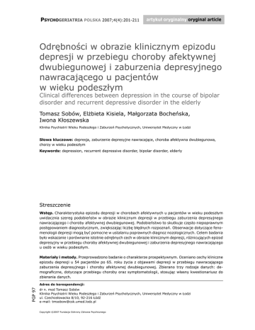 PSYCHOGERIATRIA POLSKA 2007;4(4):201-211 artykuł oryginalny oryginal article Odrębności w obrazie klinicznym epizodu depresji w przebiegu choroby afektywnej dwubiegunowej i zaburzenia depresyjnego nawracającego u pacjentów w wieku podeszłym Clinical differences between depression in the course of bipolar disorder and recurrent depressive disorder in the elderly Tomasz Sobów, Elżbieta Kisiela, Małgorzata Bocheńska, Iwona Kłoszewska Klinika Psychiatrii Wieku Podeszłego i Zaburzeń Psychotycznych, Uniwersytet Medyczny w Łodzi Słowa kluczowe: depresja, zaburzenie depresyjne nawracające, choroba afektywna dwubiegunowa, chorzy w wieku podeszłym Keywords: depression, recurrent depressive disorder, bipolar disorder, elderly Streszczenie Wstęp. Charakterystyka epizodu depresji w chorobach afektywnych u pacjentów w wieku podeszłym uwidacznia szereg podobieństw w obrazie klinicznym depresji w przebiegu zaburzenia depresyjnego nawracającego i choroby afektywnej dwubiegunowej. Podobieństwo to skutkuje często niepoprawnym postępowaniem diagnostycznym, zwiększając liczbę błędnych rozpoznań. Obserwacje dotyczące fenomenologii depresji mogą być pomocne w ustalaniu poprawnych diagnoz nozologicznych. Celem badania było wskazanie i porównanie istotnie odrębnych cech w obrazie klinicznym depresji, różnicujących epizod depresyjny w przebiegu choroby afektywnej dwubiegunowej i zaburzenia depresyjnego nawracającego u osób w wieku podeszłym. Materiały i metody. Przeprowadzono badanie o charakterze prospektywnym. Oceniano cechy kliniczne epizodu depresji u 54 pacjentów po 65. roku życia z objawami depresji w przebiegu nawracającego zaburzenia depresyjnego i choroby afektywnej dwubiegunowej. Zbierano trzy rodzaje danych: demograficzne, dotyczące przebiegu choroby oraz symptomatologii, stosując własny kwestionariusz do zbierania danych. PGP 97 Adres do korespondencji: dr n. med Tomasz Sobów Klinika Psychiatrii Wieku Podeszłego i Zaburzeń Psychotycznych, Uniwersytet Medyczny w Łodzi ul. Czechosłowacka 8/10, 92-216 Łódź e-mail: [email protected] Copyright ©2007 Fundacja Ochrony Zdrowia Psychicznego 202 T. Sobów, E. Kisiela i wsp.: Choroba afektywna dwubiegunowa a zaburzenie depresyjne nawracające Wyniki. Pacjentów z depresją dwubiegunową charakteryzuje większa liczba hospitalizacji, dłuższy czas leczenia oraz relatywnie więcej epizodów ciężkich i częściej zgłaszane objawy psychotyczne w porównaniu z depresją w przebiegu nawracającego zaburzenia depresyjnego. Dla epizodów depresji w zaburzeniu depresyjnym nawracającym charakterystyczne okazały się: dłuższy czas trwania aktualnego epizodu depresji, istotnie częstsze w porównaniu z depresją dwubiegunową zaburzenia rytmu snu i czuwania oraz wyraźnie większa całkowita liczba zgłaszanych objawów somatycznych. Wnioski. U chorych w wieku podeszłym istnieją odrębności w obrazie klinicznym jednostkowego epizodu depresji w przebiegu zaburzenia depresyjnego nawracającego i choroby afektywnej dwubiegunowej. Niektóre cechy aktualnego epizodu depresji oraz charakterystyka przebiegu zaburzenia afektywnego mogą być pomocne w różnicowaniu depresji jednobiegunowej i dwubiegunowej. Summary Introduction. Description of affective disorders reveals many similarities between depression in the course of bipolar disorder and recurrent depression in the elderly. These similarities may result in an increased number of imprecisely diagnosed (and therefore treated) patients. Clinical observations on the phenomenological expressions of depressive episodes might be helpful in establishing proper nosological diagnoses. The aim of this study was comparison of clinical differences between depressive episodes in the course of bipolar disorder and recurrent depressive disorder in the elderly. Material and methods. A prospective analysis of clinical data of 54 elderly patients hospitalized in the University based Psychogeriatric Ward and suffering from a depressive episode due to affective disorders. We have collected data on clinical presentation (with the emphasis on accompanying somatic and psychotic symptoms) as well as on the course of illness using an originally prepared questionnaire. Results. Depression in the course of bipolar disorder was associated with higher number of previous episodes and hospitalization, severe episodes and longer time of treatment. Protracted current episodes were more common in recurrent depressive subjects. Bipolar depression was more likely to manifest with psychosis features while somatic symptoms of depression and sleep disturbances were more prevalent among patients suffering from recurrent depression. Conclusions. The accurate discrimination of bipolar disorder from recurrent depression shows that there are several features of depressive episodes that might help the clinician to distinguish between bipolar disorder and recurrent depressive disorder in the elderly. Wstęp Obecne trendy populacyjne, zwłaszcza w krajach europejskich i Stanach Zjednoczonych, wskazują jednoznacznie na rosnący odsetek osób w wieku podeszłym, czyli według tradycji wywodzącej się od Bismarcka – osób, które ukończyły 65. rok życia. Choroby często dotykające osób starszych będą zatem coraz poważniejszym wyzwaniem dla systemów ochrony zdrowia. Depresja jest dość szczególnym przypadkiem takiej choroby: często nierozpoznawalna lub nieadekwatnie leczona stanowi nie tylko bezpośrednie zagrożenia (ryzyko samobójstw [1, 2]), ale także pogarsza przebieg i podwyższa śmiertelność w przebiegu innych chorób typowych dla populacji osób starych, takich jak choćby choroba niedokrwienna serca i niewydolność krążenia [3]. Wyniki leczenia epizodów depresji u pacjentów w wieku podeszłym są często niesatysfakcjonujące, częstymi problemami są nieuzyskiwanie pełnej remisji objawów, klinicznie definiowana lekooporność oraz nawroty, zwykle wiodące do rehospitaliz