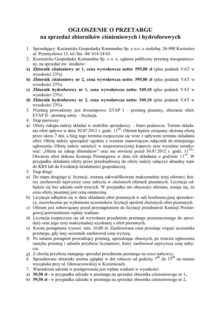 OGŁOSZENIE O PRZETARGU na sprzedaż zbiorników ciśnieniowych i hydroforowych 1. Sprzedający: Kozienicka Gospodarka Komunalna Sp. z o.o. z siedzibą: 26-900 Kozienice ul. Przemysłowa 15, tel./fax /48/ 614-24-03. 2. Kozienicka Gospodarka Komunalna Sp. z o. o. ogłasza publiczny przetarg nieograniczony, na sprzedaż nw. środków: a) Zbiornik ciśnieniowy nr 1, cena wywoławcza netto: 595,00 zł (plus podatek VAT w wysokości 23%) b) Zbiornik ciśnieniowy nr 2, cena wywoławcza netto: 595,00 zł (plus podatek VAT w wysokości 23%) c) Zbiornik hydroforowy nr 1, cena wywoławcza netto: 549,10 (plus podatek VAT w wysokości 23%) d) Zbiornik hydroforowy nr 2, cena wywoławcza netto: 549,10 (plus podatek VAT w wysokości 23%) 3. Przetarg prowadzony jest dwuetapowo: ETAP I – przetarg pisemny, zbieranie ofert; ETAP II - przetarg ustny – licytacja. 4. Etap pierwszy: a) Oferty zakupu należy składać w siedzibie sprzedawcy - biuro podawcze. Termin składania ofert upływa w dniu 30.07.2012 r. godz. 1100. Oferent będzie związany złożoną ofertą przez okres 7 dni, a bieg tego terminu rozpoczyna się wraz z upływem terminu składania ofert. Ofertę należy sporządzić zgodnie z wzorem stanowiącym załącznik do niniejszego ogłoszenia. Ofertę należy umieścić w nieprzezroczystej kopercie oraz wyraźnie oznakować: „Oferta na zakup zbiorników” oraz nie otwierać przed 30.07.2012 r. godz. 1110”. Otwarcia ofert dokona Komisja Przetargowa w dniu ich składania o godzinie 1110. W przypadku składania oferty przez przedsiębiorcę do oferty należy załączyć aktualny wpis do KRS lub do Ewidencji działalności gospodarczej. 5. Etap drugi: a) Do etapu drugiego tj. licytacji, zostaną zakwalifikowani maksymalnie trzej oferenci, którzy zaoferowali najwyższe ceny nabycia w złożonych ofertach pisemnych. Licytacja odbędzie się bez udziału osób trzecich. W przypadku nie obecności oferenta, uznaje się, że cena oferty pisemnej jest ceną ostateczną. b) Licytacja odbędzie się w dniu składania ofert pisemnych w sali konferencyjnej sprzedawcy, niezwłocznie po wyłonieniu uczestników licytacji spośród złożonych ofert pisemnych. c) Oferent jest zobowiązany przed przystąpieniem do licytacji przedstawić Komisji Przetargowej potwierdzenie wpłaty wadium. d) Licytacja rozpoczyna się od wywołania przedmiotu przetargu przeznaczonego do sprzedaży oraz jego ceny maksymalnej uzyskanej z ofert pisemnych. e) Kwota postąpienia wynosi: min. 10,00 zł. Zaoferowana cena przestaje wiązać uczestnika przetargu, gdy inny uczestnik zaoferował cenę wyższą. f) Po ustaniu postąpień prowadzący przetarg, uprzedzając obecnych, po trzecim ogłoszeniu zamyka przetarg i udziela przybicia licytantowi, który zaoferował najwyższą cenę nabycia. g) Z chwilą przybicia następuje sprzedaż przedmiotu przetargu na rzecz nabywcy. 6. Sprzedawane zbiorniki można oglądać w dni robocze od godziny 700 do 1500 na terenie wysypiska przy ul. Głowaczowskiej w Kozienicach. 7. Warunkiem udziału w postępowaniu jest wpłata wadium w wysokości: a) 59,50 zł - w przypadku udziału w przetargu na sprzedaż zbiornika ciśnieniowego nr 1, b) 59,50 zł - w przypadku udziału w przetargu na sprzedaż zbiornika ciśnieniowego nr 2, c) 54,91 zł - w przypadku udziału w przetargu na sprzedaż zbiornika hydroforowego nr 1, d) 54,91 zł - w przypadku udziału w przetargu na sprzedaż zbiornika hydroforowego nr 2. 8. Wadium należy wpłacić w pieniądzu do kasy sprzedającego nie później niż przed terminem składania ofert pisemnych lub przelewem na konto: DnB NORD Polska S.A. o/Kozienice Nr 47 1370 1226 0000 1804 4681 8401 z dopiskiem „WADIUM – Zbiornik ciśnieniowy/hydroforowy nr 1/2” (nie później niż do dnia 27.07.2012 r.). Za skuteczność operacji finansowo-bankowych odpowiada Oferent. 9. Wadium złożone przez oferentów, których oferty nie zostaną przyjęte, zostanie zwrócone bezpośrednio po dokonaniu wyboru oferty, a oferentowi, którego oferta została przyjęta (zaoferował najwyższą cenę) zostanie zarachowane na poczet ceny nabycia sprzętu. 10. Wadium przepada na rzecz sprzedawcy, jeżeli oferent, którego oferta zostanie przyjęta, uchyla się od zawarcia umowy – nie wpłacił ceny nabycia w wymaganym terminie. 11. Sprzedawca wybierze oferenta, który zaoferował najwyższą cenę za przedmiot sprzedaży. Nabywca jest obowiązany zapłacić cenę nabycia niezwłocznie lub w terminie nie dłuższym niż 7 dni od przetargu. Nabywca, który w wymaganym terminie nie uiści ceny nabycia, traci prawa nabycia oraz złożone wadium. 12. Uczestnikom przetargu nie przysługuje prawo domagania się zwrotu kosztów poniesionych w związku z uczestnictwem w postępowaniu przetargowym. 13. Wydanie przedmiotu sprzedaży nabywcy nastąpi niezwłocznie po zapłaceniu ceny nabycia. 14. Sprzedający zastrzega sobie prawo unieważnienia przetargu bez podania przyczyny. 15. Dodatkowych informacji w sprawie przetargu udzielają: a) Dariusz Brzozowski – w sprawach formalnych tel. /48/ 614-60-84, 698-633-490, b) Tomasz Brodnicki – w sprawach technicznych tel. /48/ 614-32-15, 698-633-489. Prezes Zarządu – Robert Wojcieszek Kozienice dnia 13.07.2012 r.