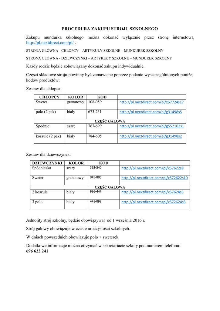 PROCEDURA ZAKUPU STROJU SZKOLNEGO Zakupu mundurka szkolnego można dokonać wyłącznie przez stronę internetową http://pl.nextdirect.com/pl/ . STRONA GŁÓWNA - CHŁOPCY – ARTYKUŁY SZKOLNE – MUNDUREK SZKOLNY STRONA GLÓWNA - DZIEWCZYNKI – ARTYKUŁY SZKOLNE – MUNDUREK SZKOLNY Każdy rodzic będzie zobowiązany dokonać zakupu indywidualnie. Części składowe stroju powinny być zamawiane poprzez podanie wyszczególnionych poniżej kodów produktów: Zestaw dla chłopca: CHŁOPCY Sweter KOLOR KOD granatowy 108-059 http://pl.nextdirect.com/pl/x57724s17 polo (2 pak) biały http://pl.nextdirect.com/pl/g31498s5 673-231 CZĘŚĆ GALOWA Spodnie szare 767-699 http://pl.nextdirect.com/pl/g552102s1 koszule (2 pak) biały 784-605 http://pl.nextdirect.com/pl/g31498s2 Zestaw dla dziewczynek: DZIEWCZYNKI KOLOR Spódniczka szary 392-540 KOD http://pl.nextdirect.com/pl/x57622s9 Sweter granatowy 845-885 http://pl.nextdirect.com/pl/x572622s10 2 koszule biały 996-447 http://pl.nextdirect.com/pl/x57624s5 3 polo biały 441-092 http://pl.nextdirect.com/pl/x572624s5 CZĘŚĆ GALOWA Jednolity strój szkolny, będzie obowiązywał od 1 września 2016 r. Strój galowy obowiązuje w czasie uroczystości szkolnych. W dniach powszednich obowiązuje polo + sweterek Dodatkowe informacje można otrzymać w sekretariacie szkoły pod numerem telefonu: 696 623 241
