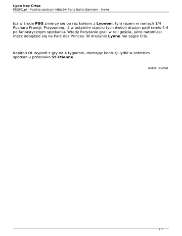 Lyon bez Crisa PSGFC.pl - Polskie centrum kibiców Paris Saint-Germain - News Już w środę PSG zmierzy się po raz kolejny z Lyonem, tym razem w ramach 1/4 Pucharu Francji. Przypomnę, iż w ostatnim starciu tych dwóch drużyn padł remis 4-4 po fantastycznym spotkaniu. Wtedy Paryżanie grali w roli gościa, jutro natomiast mecz odbędzie się na Parc des Princes. W drużynie Lyonu nie zagra Cris. Kapitan OL wypadł z gry na 4 tygodnie, doznając kontuzji łydki w ostatnim spotkaniu przeciwko St.Etienne. Autor: dumel 1/1 Powered by TCPDF (www.tcpdf.org)