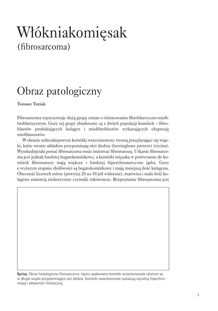 Włókniakomięsak (fibrosarcoma) Obraz patologiczny Tomasz Tuziak Fibrosarcoma reprezentuje dużą grupę zmian o różnicowaniu fibroblastyczno-miofibroblastycznym. Guzy tej grupy zbudowane są z dwóch populacji komórek – fibroblastów produkujących kolagen i miofibroblastów wykazujących ekspresję miofilamentów. W obrazie mikroskopowym komórki wrzecionowate tworzą przeplatające się wiązki, które swoim układem przypominają ości śledzia (herringbone pattern) (rycina). Wysokodojrzała postać fibrosarcoma może imitować fibromatozę. Utkanie fibrosarcoma jest jednak bardziej bogatokomórkowe, a komórki mięsaka w porównaniu do komórek fibromatozy mają większe i bardziej hiperchromatyczne jądra. Guzy o wyższym stopniu złośliwości są bogatokomórkowe i mają mniejszą ilość kolagenu. Obecność licznych mitoz (powyżej 20 na 10 pól widzenia), martwica i mała ilość kolagenu stanowią niekorzystne czynniki rokownicze. Rozpoznanie fibrosarcoma jest Rycina. Obraz histologiczny fibrosarcoma. Gęsto upakowane komórki wrzecionowate ułożone są w długie wiązki przypominające ości śledzia. Komórki nowotworowe wykazują wyraźną hiperchromazję i aktywność mitotyczną. 1 WŁÓKNIAKOMIĘSAK (FIBROSARCOMA) przez wykluczenie i polega na eliminacji nowotworów wrzecionowatokomórkowych o innych kierunkach różnicowania [1]. Immunohistochemicznie komórki fibrosarcoma wykazują dodatni odczyn na obecność wimentyny. Dodatni odczyn na obecność aktyny (smooth muscle actin) jest przejawem różnicowania miofibroblastycznego. Specyficzne, bardzo rzadko występujące podtypy fibrosarcoma to: 1. low grade myofibroblastic sarcoma reprezentujący atypowy miofibroblastyczny guz z predylekcją do głowy i szyi, który histologicznie przypomina fibromatozę, 2. low grade fibromyxoid sarcoma zbudowany z niewinnie wyglądających, układających się wirowato wrzecionowatych komórek, charakterystycznie pozaginanych naczyń i naprzemiennie występujących pól o nasilonej kolagenizacji i przemianie myksoidnej [2,3], 3. sclerosing epithelioid fibrosarcoma zbudowany z komórek epitelioidnych ułożonych w gniazda i sznury otoczone substancją kolagenową [4-6]. Piśmiennictwo 1. Oshiro Y, Fukuda T,Tsuneyoshi M. Fibrosarcoma versus fibromatoses and cellular nodular fasciitis. A comparative study of their proliferative activity using proliferating cell nuclear antigen, DNA flow cytometry, and p53. Am J Surg Pathol, 1994; 18: 712-719. 2. Dvornik G, Barbareschi M, Gallotta P i wsp. Low grade fibromyxoid sarcoma. Histopathology, 1997; 30: 274-276. 3. Evans HL. Low-grade fibromyxoid sarcoma. A report of two metastasizing neoplasms having a deceptively benign appearance. Am J Clin Pathol, 1987; 88: 615-619. 4. Meis-Kindblom JM, Kindblom LG, Enzinger FM. Sclerosing epithelioid fibrosarcoma. A variant of fibrosarcoma simulating carcinoma. Am J Surg Pathol, 1995; 19: 979-993. 5. Antonescu CR, Rosenblum MK, Pereira P i wsp. Sclerosing epithelioid fibrosarcoma: a study of 16 cases and confirmation of a clinicopathologically distinct tumor. Am J Surg Pathol, 2001; 25: 699-709. 6. Eyden BP, Manson C, Banerjee SS i wsp. Sclerosing epithelioid fibrosarcoma: a study of five cases emphasizing diagnostic criteria. Histopathology, 1998; 33: 354-360. Biologia molekularna Janusz Limon Molekularna cytogenetyka i genetyka Guzy włókniakomięsaka wieku dorosłego w zdecydowanej większości są pseudo- lub okołodiploidalne (ponad 95%) i wykazują najczęściej złożone aberracje chromosomowe [1]. Jednak w dwóch guzach wykryto zaangażowanie tego samego regionu chromosomu 2q21qter prowadzące do częściowej tri- lub tetrasomii chromosomu 2q [2]. Z innych częściej występujących zmian cytogenetycznych potwierdzonych badaniami CGH opisano: dodatkowy chromosom 8 oraz utraty chromosomów 1q12-qter, 10q23-10qter i 11q12-q22. Większość guzów włókniakomięsaka wieku dziecięcego wykazuje obecność translokacji t(12;15)(p13;q26) powodującej aktywację genu NTRK3 kodującego 2 M I Ę S A K I T K A N E K M I Ę K K I C H U D O R O S ŁY C H receptor kinazy tyrozynowej C [3]. Aktywację tę indukuje produkt białkowy genu fuzyjnego zbudowanego z genów ETV6 (12p) oraz NTRK3 (15q). Gen ETV6/NTRK3 może być wykrywany technikami FISH lub RT-PCR. Obok t(12;15) równie charakterystyczne zmiany cytogenetyczne dotyczą trisomii chromosomów 8, 11, 17 i 20. Uważa się, że trisomie tych chromosomów wiążą się z progresją guza. Zmiany cytogenetyczne włókniakomięsaka wieku dziecięcego są podobne do zmian obserwowanych w guzach nerczaka mezoblastycznego, co sugeruje wspólny tor patogenezy tych nowotworów. Piśmiennictwo 1. Mitelman Database of Chromosome Aberrations in Cancer 2002. http://cgap.nci.nih.gov/Chromosomes/Mitelman 2. Limon J, Szadowska A, Iliszko M i wsp. Recurrent chromosome changes in two adult fibrosarcomas. Genes Chromosomes Cancer 1998; 21: 720-727 3. Coffin CM i Fletcher JA. Infantile fibrosarcoma. W: Pathology & Genetics. Tumours of Soft Tissue and Bone. (Red. Fletcher ChDM, Krishnan Unni K, Mertens F), Lyon, IARCPress, 2002: 98-100. Uwagi kliniczno-terapeutyczne Piotr Rutkowski Włókniakomięsak jest obecnie jednym z rzadziej rozpoznawanych podtypów mięsaków tkanek miękkich (MTM), stanowi około 1-3% mięsaków u dorosłych. Może występować w każdym wieku i lokalizacji, jego obraz kliniczny (niebolesnego guza) nie różni się znacząco od pozostałych mięsaków tkanek miękkich. Najczęściej występuje w wieku średnim i zajmuje głębokie tkanki miękkie kończyn, tułowia oraz głowy i szyi. Częstość wznowy miejscowej wynosi 12-79% i zależy głównie od doszczętności zabiegu operacyjnego. Przerzuty odległe występują do płuc i kości (szczególnie kręgosłupa). 5-letnie przeżycie waha się w granicach 39-54%.W grupie chorych z American Forced Institute of Pathology mediana wieku chorych wynosiła 45 lat. Podstawę leczenia stanowi radykalny 