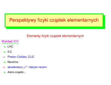 Perspektywy fizyki czastek ˛ elementarnych Elementy fizyki czastek ˛ elementarnych Wykład XIV • LHC • ILC ⇒ Photon Collider, CLIC • Neutrina ⇒ akceleratory µ± i fabryki neutrin • Astro-czastki... ˛ Cele eksperymentów w HEP Poszukiwania "nowej fizyki" • poszukiwania bozonu Higgsa • kolejnych generacji "standardowych" czastek ˛ • czastek ˛ supersymetrycznych Pomiar parametrów i weryfikacja MS • badanie własności czastek ˛ ⇒ mas np. W ±, Z ◦, t, ν ... ⇒ sprzeże ˛ ń ⇒ kanałów rozpadów • podstruktury kwarków i/lub leptonów • pomiar mieszania kwarków i leptonów (neutrin) • ciemnej materii • pomiar łamania symetrii CP • nowych oddziaływań • naruszenia zasad zachowania A.F.Żarnecki • pomiar partonowej (kwarkowo-gluonowej) i spinowej struktury czastek ˛ protonu, neutronu, fotonu... Wykład XIV 1 Warszawska grupa HEP Główne eksperymenty z udziałem fizyków z Warszawy LEP LEP II DELPHI HERA HERA II LHC CMS ZEUS LHC upgrade ILC NA35 NA49 Compass Super Kamiokande K2K Icarus p of the Sky Projekt A.F.Żarnecki 1980 Budowa Zbieranie i analiza danych 2000 Wykład XIV Analiza danych 2020 2 LHC 99.9% CL Przeciwbieżne wiazki ˛ protonów, √ s = 14 TeV. Bardzo wysoka świetlność. Akcelerator i eksperymenty: w budowie. Planowane uruchomienie: 2007. Fizyka: • Higgs • supersymetria • łamanie CP • “polowanie” na wszystkie egzotyczne twory... A.F.Żarnecki Wykład XIV 3 ATLAS wrzesień 2004 A.F.Żarnecki Wykład XIV 4 ATLAS czerwiec 2005 A.F.Żarnecki Wykład XIV 5 ATLAS czerwiec 2006 A.F.Żarnecki Wykład XIV 6 International Linear Collider (ILC) 95% CL Planowana jest już budowa kolejnego akceleratora - akceleratora liniowego e + e−. Program fizyczny: Precyzyjne pomiary • kwarku t • bozonu Higgsa • czastek ˛ supersymetrycznych • wszystkiego co odkryje LHC... Wymagane parametry: • dostepna ˛ energia √ s = 200 − 500 GeV, • bardzo wysoka świetlność: 500 f b−1/4 lata, • wysoka polaryzacja wiazek, ˛ • możliwość rozbudowy m.in. o opcje˛ γγ Projekt ogólnoświatowy Szerokie poparcie jeśli chodzi o potrzebe˛ budowy (silna motywacja fizyczna)! Brak jednomyślności jeśli chodzi o czas i tryb podjecia ˛ ostatecznej decyzji (finanse)... A.F.Żarnecki Wykład XIV 7 ILC Do niedawna rozważanych było kilka koncepcji budowy akceleratora Projekt JLC (Japonia): A.F.Żarnecki Wykład XIV 8 ILC Główna różnica miedzy ˛ projektami - metoda przyspieszania wiazek: ˛ • projekty JLC i NLC - “ciepłe” wneki ˛ przyspieszajace ˛ • projekt TESLA - “zimne” (nadprzewodzace) ˛ wneki ˛ przyspieszajace ˛ • projekt CLIC - jeszcze w fazie testów, nie był rozważany W sierpniu 2004 miedzynarodowa ˛ komisja zadecydowała, że ILC powinien być ˛ wnek ˛ przyspieszajacych. ˛ zbudowany w oparciu o technologie˛ nadprzewodzacych • mniejsze straty energii • wieksza ˛ stabilność • wieksza ˛ niezawodność Ostateczny projekt ILC powinien powstać do roku 2008. Decyzja o budowie: 2010 ? Uruchomienie: 2015 ? A.F.Żarnecki Wykład XIV 9 Raport Komitetu Amerykańskiej Akademii Nauk Rekomendujacy ˛ kierunki rozwoju na kolejne 15 lat kwiecień 2006 Revealing the Hidden Nature of Space and Time Charting the Course for Elementary Particle Physics Committee on Elementary Particle Physics in the 21st Century Board on Physics and Astronomy Division on Engineering and Physical Sciences A.F.Żarnecki Wykład XIV 10 Bardzo silne poparcie dla ILC i dla ILC w USA The Recommendations • The US should remain globally competitive in HEP and play a leading role in the worldwide effort: 1) fully exploit opportunities at LHC 2) world-leading centre for ILC R&D + mount a compelling bid to build ILC in the US 3) expand particle astrophysics programme + collaborate internationally on neutrinos Philip Burrows A.F.Żarnecki HEP Forum, Coseners House, 6/05/06 Wykład XIV 11 Zderzenia γγ Rozpraszanie Comptona “Klasycznie”: foton rozpraszajac ˛ sie˛ na elektronie przekazuje mu cześć ˛ swojej energii: e g Możemy jednak przejść do układu odniesienia, w którym Ee Eγ : g e e g Photon Collider g e ⇒ elektron może przekazać fotonowi wiekszość ˛ swojej energii ! (opcja ILC) Możliwość zderzania fotonów jest opcja˛ we wszystkich projektach e+e−. Wykorzystujac ˛ niezwykle silny laser możemy uzyskać prawie pełna˛ “zamiane” ˛ wiazki ˛ elektronowej w fotonowa... ˛ Fotony “przejmuja” ˛ nie tylko energie˛ (maksimum przy ok. 80% energii wiazki), ˛ ale i kierunek wiazki ˛ elektronów (rozmycie katowe ˛ ∼ me/Ee) ⇒ możemy doprowadzić do zderzeń γγ ze świetlnościa˛ Lγγ ∼ Lee A.F.Żarnecki Wykład XIV 12 Projekt NLC e−: 250 GeV γ ∼ 200 GeV A.F.Żarnecki Wykład XIV 13 Photon Collider Fizyka W zderzeniach γγ możemy produkować wszystkie czastki ˛ naładowane (“czyste” oddziaływanie elektromagnetyczne), ale nie tylko... Wyjatkowa ˛ w zderzeniach γγ jest możliwość rezonansowej produkcji bozonu Higgsa: Ponieważ foton nie sprzega ˛ sie˛ bezpośrednio do Higgsa, tylko przez “petle”, ˛ proces jest czuły na WSZYSTKIE czastki ˛ naładowane ⇒ niezwykle czuły na “nowa˛ fizyk˛e” W innych procesach wkłady petlowe ˛ szybko maleja˛ ze wzrostem masy czastek... ˛ Ale sprzeżenie ˛ Higgsa jest proporcjonalne do masy ! ⇒ wkłady skończone nawet w granicy M → ∞ A.F.Żarnecki Wykład XIV 14 Photon Collider Jedyny kolajder, który może “siegn ˛ ać” ˛ skali unifikacji Wyniki symulacji prowadzonych w Warszawie: γ γ → h → b b̄ - - e e beams with Ösee = 210 GeV Number of events/2GeV Fizyka Higgs signal mh=120 GeV -1 Lgg(Wgg>80GeV)= 84 fb 2500 NLO Background: bb(g) Jz=0 bb(g) Jz=2 cc(g) Jz=0 cc(g) Jz=2 2000 . NZK 1500 For comparison: LO Background 1000 500 0 80 90 100 110 120 130 140 150 Wcorr (GeV) # events γγ → h → ZZ 300 . NZK simulation mh=300 GeV Parameterization: mh=300 GeV 200 no Higgs 100 0 100 A.F.Żarnecki Wyk