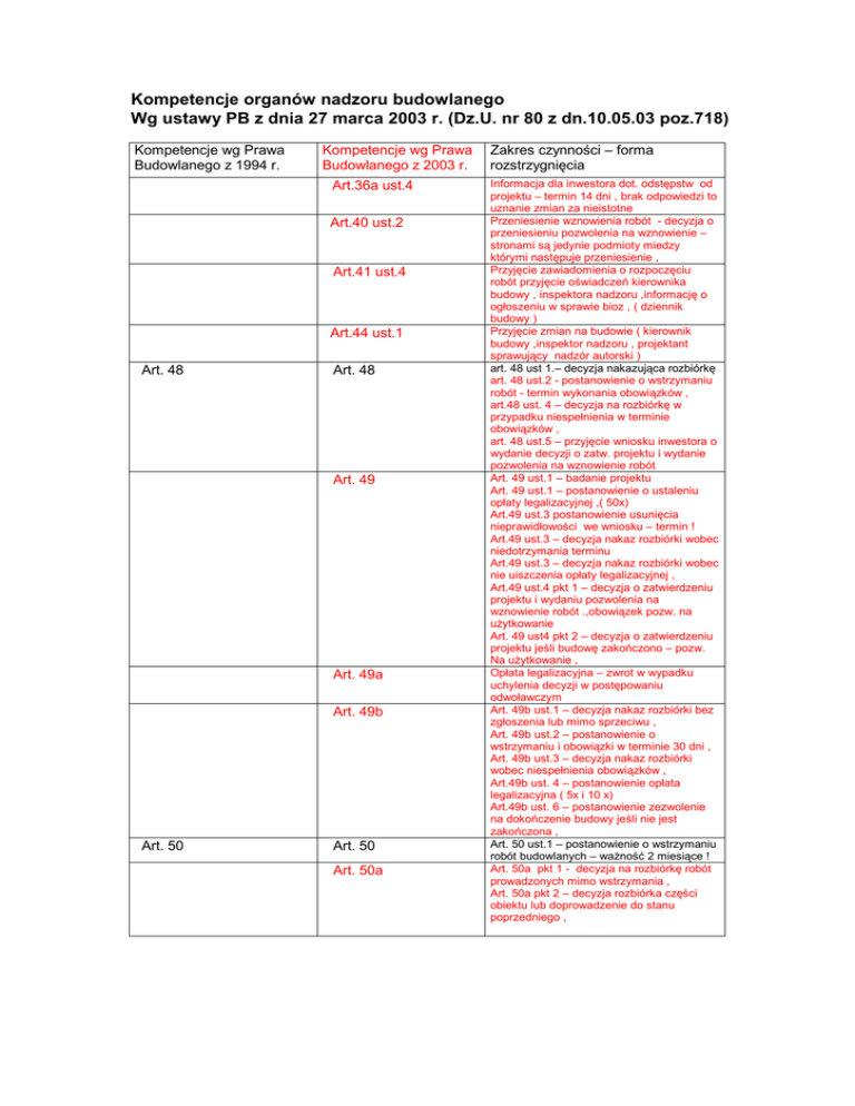 Kompetencje organów nadzoru budowlanego Wg ustawy PB z dnia 27 marca 2003 r. (Dz.U. nr 80 z dn.10.05.03 poz.718) Kompetencje wg Prawa Budowlanego z 1994 r. Kompetencje wg Prawa Budowlanego z 2003 r. Art.36a ust.4 Art.40 ust.2 Art.41 ust.4 Art.44 ust.1 Art. 48 Art. 48 Art. 49 Art. 49a Art. 49b Art. 50 Art. 50 Art. 50a Zakres czynności – forma rozstrzygnięcia Informacja dla inwestora dot. odstępstw od projektu – termin 14 dni , brak odpowiedzi to uznanie zmian za nieistotne Przeniesienie wznowienia robót - decyzja o przeniesieniu pozwolenia na wznowienie – stronami są jedynie podmioty miedzy którymi następuje przeniesienie , Przyjęcie zawiadomienia o rozpoczęciu robót przyjęcie oświadczeń kierownika budowy , inspektora nadzoru ,informację o ogłoszeniu w sprawie bioz , ( dziennik budowy ) Przyjęcie zmian na budowie ( kierownik budowy ,inspektor nadzoru , projektant sprawujący nadzór autorski ) art. 48 ust 1.– decyzja nakazująca rozbiórkę art. 48 ust.2 - postanowienie o wstrzymaniu robót - termin wykonania obowiązków , art.48 ust. 4 – decyzja na rozbiórkę w przypadku niespełnienia w terminie obowiązków , art. 48 ust.5 – przyjęcie wniosku inwestora o wydanie decyzji o zatw. projektu i wydanie pozwolenia na wznowienie robót Art. 49 ust.1 – badanie projektu Art. 49 ust.1 – postanowienie o ustaleniu opłaty legalizacyjnej ,( 50x) Art.49 ust.3 postanowienie usunięcia nieprawidłowości we wniosku – termin ! Art.49 ust.3 – decyzja nakaz rozbiórki wobec niedotrzymania terminu Art.49 ust.3 – decyzja nakaz rozbiórki wobec nie uiszczenia opłaty legalizacyjnej , Art.49 ust.4 pkt 1 – decyzja o zatwierdzeniu projektu i wydaniu pozwolenia na wznowienie robót .,obowiązek pozw. na użytkowanie Art. 49 ust4 pkt 2 – decyzja o zatwierdzeniu projektu jeśli budowę zakończono – pozw. Na użytkowanie , Opłata legalizacyjna – zwrot w wypadku uchylenia decyzji w postępowaniu odwoławczym Art. 49b ust.1 – decyzja nakaz rozbiórki bez zgłoszenia lub mimo sprzeciwu , Art. 49b ust.2 – postanowienie o wstrzymaniu i obowiązki w terminie 30 dni , Art. 49b ust.3 – decyzja nakaz rozbiórki wobec niespełnienia obowiązków , Art.49b ust. 4 – postanowienie opłata legalizacyjna ( 5x i 10 x) Art.49b ust. 6 – postanowienie zezwolenie na dokończenie budowy jeśli nie jest zakończona , Art. 50 ust.1 – postanowienie o wstrzymaniu robót budowlanych – ważność 2 miesiące ! Art. 50a pkt 1 - decyzja na rozbiórkę robót prowadzonych mimo wstrzymania , Art. 50a pkt 2 – decyzja rozbiórka części obiektu lub doprowadzenie do stanu poprzedniego , Kompetencje wg Prawa Budowlanego z 1994 r. Art. 51 Kompetencje wg Prawa Budowlanego z 2003 r. Art. 51 Art.54 Art. 55 Art. 57 ust. 4 Art. 59 Art. 59a Art. 59b Art. 59c Art. 59d Art. 59g Zakres czynności – forma rozstrzygnięcia Art. 51 ust.1 pkt 1 – decyzja nakaz rozbiórki , , zaniechanie robót , doprowadzenie do poprzedniego stanu , Art. 51 ust.1 pkt 2 – decyzja nakaz wykonania czynności , Art. 51 ust. 1 pkt 3 – decyzja nakaz sporządzenia i przedstawienia w terminie projektu budowlanego zamiennego , Art. 51 ust.2 - przyjęcie zawiadomienia o wykonaniu przez inwestora obowiązków i przyjęcie wniosku o pozwolenie na wznowienie robót budowlanych , Art. 51 ust. 3 – decyzja o zatwierdzeniu projektu zamiennego i pozwoleniu na wznowienie robót , Art. 51 ust. 5 – decyzja o zatwierdzeniu projektu zamiennego , Art. 51 ust.4 – decyzja- nakaz zaniechanie dalszych robot , rozbiórka bądź doprowadzenie do stanu poprzedniego ,w razie niewykonania obowiązków , Przyjęcie zawiadomienia o zakończeniu budowy - 21 dni przed zamierzonym przystąpieniem do użytkowania Art.54 ust. 1 decyzja – sprzeciw w terminie 21 dni od dnia doręczenia zawiadomienia , Weryfikacja – z jakiego powodu powstał obowiązek uzyskania pozwolenia na użytkowanie Sprawdzenie kompletności zawiadomienia o zakończeniu budowy lub wniosku o udzielenie pozwolenia na użytkowanie Uzupełnienie wniosku przez inwestora , ?? Art. 57 ust. 6 – zawiadomienie to wezwanie do przeprowadzenia kontroli przez organ , Art. 57 ust. 7 przystąpienie do użytkowania obiektu z naruszeniem przepisów – organ przeprowadza bezzwłoczną obowiązkową kontrolę obiektu , Art. 59 ust.1 – decyzja – pozwolenie na użytkowanie obiektu , Art. 59 ust. 1 decyzja – pozwolenie na użytkowanie z warunkami Art. 59 ust. 5 – decyzja odmowa wydania pozwolenia na użytkowanie , Art 59a ust. 1 – obowiązkowa kontrola na wezwanie inwestora Art. 59b ust. 1 – obowiązkowa kontrola po zawiadomieniu o zakończeniu budowy lub złożeniu wniosku o pozwolenie na użytkowanie , Art. 59b ust. -obowiązkowa kontrola budowy po uchyleniu decyzji o pozwoleniu na budowę w trybie art., 36a ust. 2 i po złożeniu wniosku o wydanie pozwolenia na wznowienie robot budowlanych 59c ust. 1 - Kontrole – termin przed upływem 21 dni , zawiadomienie 7 dni od doręczenia zawiadomienia , Art. 59d ust. 1 – organ sporządza protokół z kontroli w 2 egzemplarzach , Art. 59g ust. 1 postanowienie o wymierzeniu kary za odstępstwo od projektu – zażalenie , Nie wpłacenie kary – egzekucja administracyjna Kompetencje wg Prawa Budowlanego z 1994 r. Kompetencje wg Prawa Budowlanego z 2003 r. Art. 62 ust. 3 Art. 62 ust. 3 Art.65 Art.65 Art. 66 Art. 66 Art. 67 Art. 67 Art. 68 Art. 68 Art. 69 Art. 69 Art. 70 Art. 70 Art. 71 Art. 71 Art. 74 Art. 74 Art. 75 Art. 75 Art. 76 Art. 76 Art. 78 Art. 78 Art. 97 Art. 97 Zakres czynności – forma rozstrzygnięcia Art. 62 ust. 3 – decyzja organu nakaz wykonania kontroli w innym terminie niż wynikający z przepisów Prawa budowlanego , lub opracowanie ekspertyzy Uprawnienie do kontroli dokumentów dot. obiektów budowlanych nakazanych przepisami Prawa Budowlanego Art. 66 ust. 1 – decyzja nakazująca usunięcie stwierdzonych nieprawidłowości w stanie technicznym obiektu Art. 67 ust 1 – decyzja z terminem !nakaz rozbió