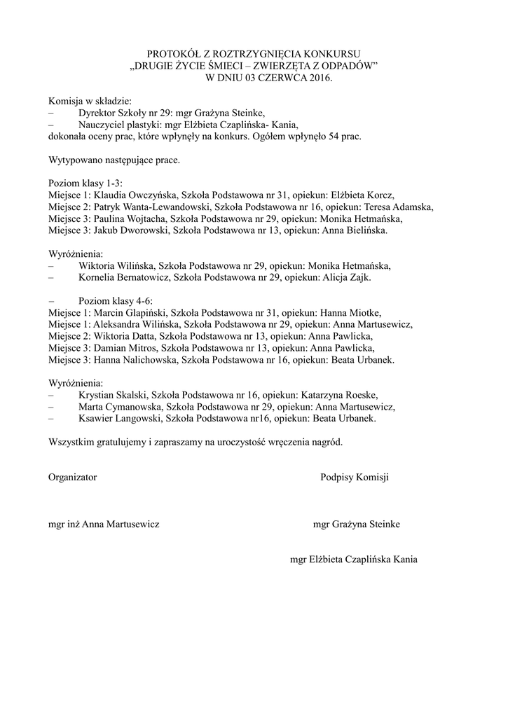 PROTOKÓŁ Z ROZTRZYGNIĘCIA KONKURSU „DRUGIE ŻYCIE ŚMIECI – ZWIERZĘTA Z ODPADÓW” W DNIU 03 CZERWCA 2016. Komisja w składzie: – Dyrektor Szkoły nr 29: mgr Grażyna Steinke, – Nauczyciel plastyki: mgr Elżbieta Czaplińska- Kania, dokonała oceny prac, które wpłynęły na konkurs. Ogółem wpłynęło 54 prac. Wytypowano następujące prace. Poziom klasy 1-3: Miejsce 1: Klaudia Owczyńska, Szkoła Podstawowa nr 31, opiekun: Elżbieta Korcz, Miejsce 2: Patryk Wanta-Lewandowski, Szkoła Podstawowa nr 16, opiekun: Teresa Adamska, Miejsce 3: Paulina Wojtacha, Szkoła Podstawowa nr 29, opiekun: Monika Hetmańska, Miejsce 3: Jakub Dworowski, Szkoła Podstawowa nr 13, opiekun: Anna Bielińska. Wyróżnienia: – Wiktoria Wilińska, Szkoła Podstawowa nr 29, opiekun: Monika Hetmańska, – Kornelia Bernatowicz, Szkoła Podstawowa nr 29, opiekun: Alicja Zajk. – Poziom klasy 4-6: Miejsce 1: Marcin Glapiński, Szkoła Podstawowa nr 31, opiekun: Hanna Miotke, Miejsce 1: Aleksandra Wilińska, Szkoła Podstawowa nr 29, opiekun: Anna Martusewicz, Miejsce 2: Wiktoria Datta, Szkoła Podstawowa nr 13, opiekun: Anna Pawlicka, Miejsce 3: Damian Mitros, Szkoła Podstawowa nr 13, opiekun: Anna Pawlicka, Miejsce 3: Hanna Nalichowska, Szkoła Podstawowa nr 16, opiekun: Beata Urbanek. Wyróżnienia: – Krystian Skalski, Szkoła Podstawowa nr 16, opiekun: Katarzyna Roeske, – Marta Cymanowska, Szkoła Podstawowa nr 29, opiekun: Anna Martusewicz, – Ksawier Langowski, Szkoła Podstawowa nr16, opiekun: Beata Urbanek. Wszystkim gratulujemy i zapraszamy na uroczystość wręczenia nagród. Organizator mgr inż Anna Martusewicz Podpisy Komisji mgr Grażyna Steinke mgr Elżbieta Czaplińska Kania