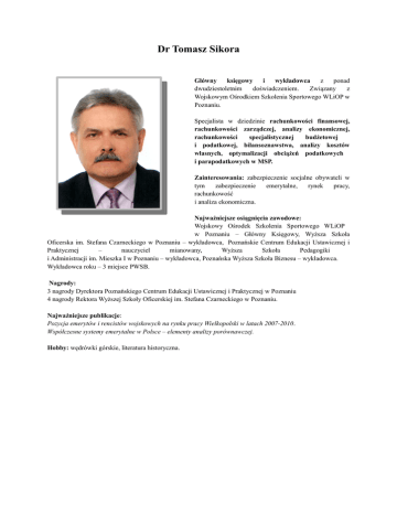 Dr Tomasz Sikora Główny księgowy i wykładowca z ponad dwudziestoletnim doświadczeniem. Związany z Wojskowym Ośrodkiem Szkolenia Sportowego WLiOP w Poznaniu. Specjalista w dziedzinie rachunkowości finansowej, rachunkowości zarządczej, analizy ekonomicznej, rachunkowości specjalistycznej budżetowej i podatkowej, bilansoznawstwa, analizy kosztów własnych, optymalizacji obciążeń podatkowych i parapodatkowych w MSP. Zainteresowania: zabezpieczenie socjalne obywateli w tym zabezpieczenie emerytalne, rynek pracy, rachunkowość i analiza ekonomiczna. Najważniejsze osiągnięcia zawodowe: Wojskowy Ośrodek Szkolenia Sportowego WLiOP w Poznaniu – Główny Księgowy, Wyższa Szkoła Oficerska im. Stefana Czarneckiego w Poznaniu – wykładowca, Poznańskie Centrum Edukacji Ustawicznej i Praktycznej – nauczyciel mianowany, Wyższa Szkoła Pedagogiki i Administracji im. Mieszka I w Poznaniu – wykładowca, Poznańska Wyższa Szkoła Biznesu – wykładowca. Wykładowca roku – 3 miejsce PWSB. Nagrody: 3 nagrody Dyrektora Poznańskiego Centrum Edukacji Ustawicznej i Praktycznej w Poznaniu 4 nagrody Rektora Wyższej Szkoły Oficerskiej im. Stefana Czarneckiego w Poznaniu. Najważniejsze publikacje: Pozycja emerytów i rencistów wojskowych na rynku pracy Wielkopolski w latach 2007-2010. Współczesne systemy emerytalne w Polsce – elementy analizy porównawczej. Hobby: wędrówki górskie, literatura historyczna.