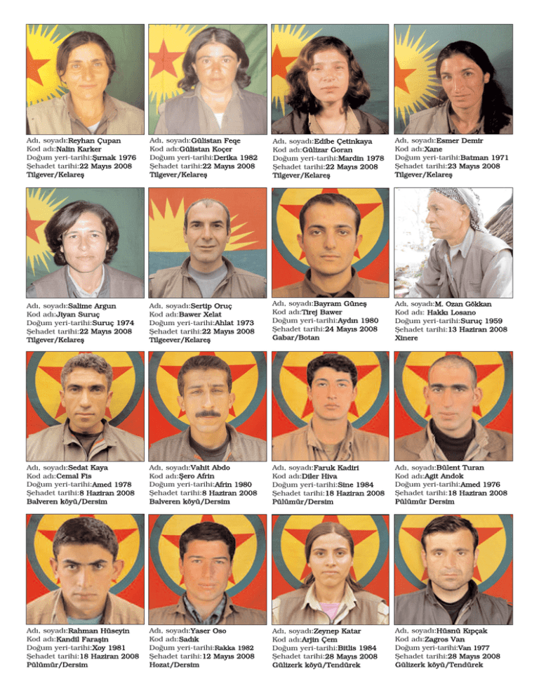 Ad›, soyad›:Reyhan Çupan Kod ad›:Nalin Karker Do¤um yeri-tarihi:fi›rnak 1976 fiehadet tarihi:22 May›s 2008 Tilgever/Kelarefl Ad›, soyad›:Gülistan Feqe Kod ad›:Gülistan Koçer Do¤um yeri-tarihi:Derika 1982 fiehadet tarihi:22 May›s 2008 Tilgever/Kelarefl Ad›, soyad›:Edibe Çetinkaya Kod ad›:Gülizar Goran Do¤um yeri-tarihi:Mardin 1978 fiehadet tarihi:22 May›s 2008 Tilgever/Kelarefl Ad›, soyad›:Esmer Demir Kod ad›:Xane Do¤um yeri-tarihi:Batman 1971 fiehadet tarihi:23 May›s 2008 Tilgever/Kelarefl Ad›, soyad›:Salime Argun Kod ad›:Jiyan Suruç Do¤um yeri-tarihi:Suruç 1974 fiehadet tarihi:22 May›s 2008 Tilgever/Kelarefl Ad›, soyad›:Sertip Oruç Kod ad›:Bawer Xelat Do¤um yeri-tarihi:Ahlat 1973 fiehadet tarihi:22 May›s 2008 Tilgeever/Kelarefl Ad›, soyad›:Bayram Günefl Kod ad›:Tirej Bawer Do¤um yeri-tarihi:Ayd›n 1980 fiehadet tarihi:24 May›s 2008 Gabar/Botan Ad›, soyad›:M. Ozan Gökkan Kod ad›: Hakk› Losano Do¤um yeri-tarihi:Suruç 1959 fiehadet tarihi:13 Haziran 2008 Xinere Ad›, soyad›:Sedat Kaya Kod ad›:Cemal Fis Do¤um yeri-tarihi:Amed 1978 fiehadet tarihi:8 Haziran 2008 Balveren köyü/Dersim Ad›, soyad›:Vahit Abdo Kod ad›:fiero Afrin Do¤um yeri-tarihi:Afrin 1980 fiehadet tarihi:8 Haziran 2008 Balveren köyü/Dersim Ad›, soyad›:Faruk Kadiri Kod ad›:Diler Hiva Do¤um yeri-tarihi:Sine 1984 fiehadet tarihi:18 Haziran 2008 Pülümür/Dersim Ad›, soyad›:Bülent Turan Kod ad›:Agit Andok Do¤um yeri-tarihi:Amed 1976 fiehadet tarihi:18 Haziran 2008 Pülümür Dersim Ad›, soyad›:Rahman Hüseyin Kod ad›:Kandil Faraflin Do¤um yeri-tarihi:Xoy 1981 fiehadet tarihi:18 Haziran 2008 Pülümür/Dersim Ad›, soyad›:Yaser Oso Kod ad›:Sad›k Rakka 1982 Do¤um yeri-tarihi:R fiehadet tarihi:12 May›s 2008 Hozat/Dersim Ad›, soyad›:Zeynep Katar Kod ad›:Arjin Çem Do¤um yeri-tarihi:Bitlis 1984 fiehadet tarihi:28 May›s 2008 Gülizerk köyü/Tendürek Ad›, soyad›:Hüsnü K›pçak Kod ad›:Zagros Van Do¤um yeri-tarihi:Van 1977 fiehadet tarihi:28 May›s 2008 Gülizerk köyü/Tendürek