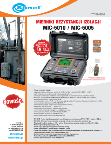 Indeks: WMPLMIC5010 WMPLMIC5005 MIERNIKI REZYSTANCJI IZOLACJI MIC-5010 / MIC-5005 Możliwość bezprzewodowej transmisji danych z pamięci do komputera ZAMÓW DODATKOWO INTERFEJS RADIOWY USB! · Pomiar rezystancji izolacji: NOWOŚĆ! - napięcie pomiarowe wybierane w zakresie 50..1000 V co 10 V, w zakresie 1000 V...5000 V co 25 V, - ciągłe wskazanie mierzonej rezystancji izolacji lub prądu upływu, - samoczynne rozładowanie pojemności mierzonego obiektu po zakończeniu pomiaru rezystancji izolacji, - akustyczne wyznaczanie pięciosekundowych odcinków czasu ułatwiające zdjęcie charakterystyk czasowych, - ustawialny czas pomiary - maksymalnie 99'59'’, - odmierzane czasy pomiaru T1 , T2 i T3 dla pomiaru jednego lub dwóch współczynników absorpcji z zakresu 1...600 s, - pomiar współczynników absorpcji AB1, AB2, DAR, PI, - wskazanie rzeczywistego napięcia pomiarowego podczas pomiaru, - maksymalny prąd pomiarowy 1,2 mA lub 3 mA, - zabezpieczenie przed pomiarem obiektów pod napięciem, - pomiar rezystancji izolacji metodą dwu- oraz trójprzewodową, - pomiary z wykorzystaniem przewodów długości do 20 m, - pomiar napięciem narastającym schodkowo (SV), - pomiar współczynnika rozładowania dielektryka (DD), · MIC-5010: Pomiar ciągłości połączeń ochronnych i wyrównawczych zgodnie z PN-EN 61557-4 prądem >200 mA . Sonel S.A. ul. Wokulskiego 11 58-100 Świdnica tel. +48 74 85 83 878 fax +48 74 85 83 808 [email protected] www.sonel.pl · MIC-5010: Ustawiane limity minimalnej rezystancji izolacji oraz maksymalnej rezystancji Rcont · Wysoka odporność na zakłócenia - filtry cyfrowe dla pomiarów przy dużych zakłóceniach (10 s, 30 s, 60 s). · Pomiar pojemności podczas pomiaru RISO. · Pomiar prądu upływu podczas pomiaru rezystancji izolacji. · Pomiar napięć stałych i przemiennych w zakresie 0...600 V. · Pamięć 990 komórek (11880 wpisów) wraz z możliwością bezprzewodowego przesłania danych do komputera PC (za pomocą adaptera USB - OR-1) lub poprzez kabel USB. · Zasilanie bezpośrednio z sieci lub wbudowanych pakietów akumulatorów. · Podświetlany wyświetlacz (MIC-5005) oraz klawiatura (MIC-5010). · Przyrząd spełnia wymagania normy PN-EN 61557. MIC-5010 / MIC-5005 Pomiar rezystancji izolacji (dwuprzewodowy) Zakres pomiarowy wg IEC 61557-2: 50 k...15,0 TΩ (IISOnom = 1,2 mA lub 3 mA) Zakres Błąd podstawowy Rozdzielczość 0...999 kΩ 1 kΩ 1,00..9,99 MΩ 0,01 MΩ 10,0...99,9 MΩ 0,1 MΩ 100..999 MΩ 1 MΩ 1,00...9,99 GΩ 0,01 GΩ 10,0...99,9 GΩ 0,1 GΩ ±(3% w.m. + 10 cyfr) Pomiar pojemności Zakres wyświetlania Błąd podstawowy Rozdzielczość 1...999 nF 1 nF 1,00...49,99 μF 0,01 μF ±(5% m.w. + 5 cyfr) · Wyświetlanie wyniku pomiaru pojemności po pomiarze RISO Pomiar napięcia stałego oraz przemiennego Zakres Rozdzielczość Błąd podstawowy 100...999 GΩ 1 GΩ ±(3.5% w.m. + 10 cyfr) 0,0...29,9 V 0,1 V ±(2% w.m. + 20 cyfr) 1,00...9,99 TΩ 0,01 TΩ ±(7.5% w.m. + 10 cyfr) 30,0...299,9 V 0,1 V ±(2% w.m. + 6 cyfr) 10,0...15,0 TΩ 0,1 TΩ ±(10% w.m. + 10 cyfr) 300...600 V 1V ±(2% w.m. + 2 cyfr) Wartości mierzonej rezystancji w zależności od napięcia pomiarowego Napięcie UISO Zakres pomiaru 250 V 500 GΩ 500 V 1,00 TΩ 1000 V 2,00 TΩ 2500 V 5,00 TΩ 5000 V 15,0 TΩ Pomiar prądu upływu Zakres Rozdzielczość Błąd podstawowy 0…ILmax m, μ, n [A] Obliczana na podstawie wskazań rezystancji · ILmax – maksymalny prąd przy zwarciu przewodów, · rozdzielczość i jednostki wynikają z zakresu pomiarowego rezystancji izolacji. Pomiar rezystancji izolacji napięciem narastającym schodkowo Napięcie docelowe Sekwencja pomiarowa 1 kV 200, 400, 600, 800, 1000 V 2,5 kV 0,5; 1; 1,5; 2; 2,5 kV 5 kV 1, 2, 3, 4, 5 kV Pomiar ciągłości połączeń ochronnych i wyrównawczych prądem >200 mA (tylko MIC-5010) · Zakres częstotliwości: 45...65Hz Wyposażenie standardowe: - przewód 1,8 m czerwony 10 kV zak. wtykami bananowymi - przewód 1,8 m niebieski 10 kV zak. wtykami bananowymi - przewód 1,8 m czarny 10 kV ekranowany zak. wtykami bananowymi - przewód do transmisji danych USB - krokodylek czarny 5 kV - krokodylek czerwony 5 kV - krokodylek niebieski 5 kV - sonda ostrzowa 5 kV z gniazdem bananowym czerwona - sonda ostrzowa 5 kV z gniazdem bananowym czarna - futerał L4 (na akcesoria) - przewód do ładowania 230 V - akumulator (wbudowany) - program Sonel Reader - certyfikat kalibracji WAPRZ1X8REBB10K WAPRZ1X8BUBB10K WAPRZ1X8BLBBE10K WAPRZUSB WAKROBL32K07 WAKRORE32K07 WAKROBU32K07 WASONREOGB5X5 WASONBLOGB5X5 WAFUTL4 WAPRZ1X8BLIEC Bezpieczeństwo elektryczne: podwójna, zgodnie z PN-EN 61010-1 i IEC 61557 - rodzaj izolacji - kategoria pomiarowa IV 600 V (III 1000 V) wg PN-EN 61010-1 - stopień ochrony obudowy wg PN-EN 60529 IP54 (IP67 z zamkniętą pokrywą obudowy) Pozostałe dane techniczne: - zasilanie miernika: - masa miernika - wymiary - wyświetlacz - pamięć wyników pomiarów - transmisja wyników wbudowany pakiet akumulatorów ok. 7 kg 390 x 310 x 170 mm LCD segmentowy 990 komórek (11880 wpisów) łącze USB lub bezprzewodowa Skrót „w.m.” oznacza „wartość mierzoną wzorcową”. Zakres pomiarowy wg IEC 61557-4: 0,12...999 Ω Zakres Rozdzielczość 0,00...19,99 Ω 0,01 Ω 20,0...199,9 Ω 0,1 Ω 200...999 Ω 1Ω Błąd podstawowy ±(2% w.m. + 3 cyfry) ±(4% w.m. + 3 cyfry) · Napięcie na otwartych zaciskach: 4...24 V · Prąd wyjściowy przy R < 15 Ω: min. 200 mA (ISC: 200...250 mA) · Kompensacja rezystancji przewodów pomiarowych · Prąd przepływający w dwóch kierunkach, wyświetlana wartość średnia rezystancji v.1