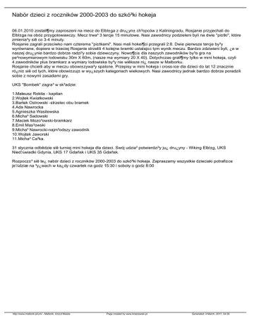 Nabór dzieci z roczników 2000-2003 do szkó³ki hokeja 06.01.2010 zostali¶my zaproszeni na mecz do Elbl±ga z dru¿yn± ch³opców z Kaliningradu, Rosjanie przyjechali do Elbl±ga na obóz przygotowawczy. Mecz trwa³ 3 tercje 15 minutowe. Nasi zawodnicy podzieleni byli na dwie "pi±tki", które zmienia³y siê co 3-4 minuty. Rosjanie zagrali przeciwko nam czterema "pi±tkami". Nasi mali hokei¶ci przegrali 2:8. Dwie pierwsze tercje by³y wyrównane, dopiero w trzeciej Rosjanie strzelili 4 kolejne bramki ustalaj±c tym wynik meczu. Bardzo zdziwieni byli, ¿e w naszej dru¿ynie bardzo dobrze radzi³y sobie dziewczyny. Nowo¶ci± dla naszych zawodników by³a gra na pe³nowymiarowym lodowisku 30m X 60m, (nasze ma wymiary 20 X 40). Dotychczas grali¶my tylko w mini hokeja, czyli 4 zawodników plus bramkarz a wymiary lodowiska by³y nie wiêksze ni¿ nasze w Malborku. Rosjanie chcielli aby w meczu obowi±zywa³y spalone. Przepisy w mini hokeja i cross-ice dla dzieci do lat 12 znacznie ró¿ni± siê od tych, które obowi±zuj± w wy¿szych kategoriach wiekowych. Nasi zawodnicy jednak bardzo dobrze poradzili sobie z nowymi zasadami gry. UKS "Bombek" zagra³ w sk³adzie: 1.Mateusz Rokita - kapitan 2.Wojtek Kwiatkowski 3.Bartek Ostrowski -strzelec obu bramek 4.Ada Nawrocka 5.Agnieszka Wasilewska 6.Micha³ Sadowski 7.Maciek Mozo³owski-bramkarz 8.Emil Mas³owski 9.Micha³ Nawrocki-najm³odszy zawodnik 10.Wojtek Jaworski 11.Micha³ Ca³ka. 31 stycznia odbêdzie siê turniej mini hokeja dla dzieci. Swój udzia³ potwierdzi³y ju¿ dru¿yny - Wiking Elbl±g, UKS Nied¼wiadki Gdynia, UKS 17 Gdañsk i UKS 35 Gdañsk. Rozpocz±³ siê te¿ nabór dzieci z roczników 2000-2003 do szkó³ki hokeja. Zapraszamy wszystkie dzieciaki potrafi±ce je¼dziæ na ³y¿wach w ka¿dy czwartek na godz 15:30 i soboty o godz 8:00 http://www.malbork.pl/um/ - Malbork, Urz±d Miasta Page created by www.kraszewski.pl Generated: 4 March, 2017, 04:38