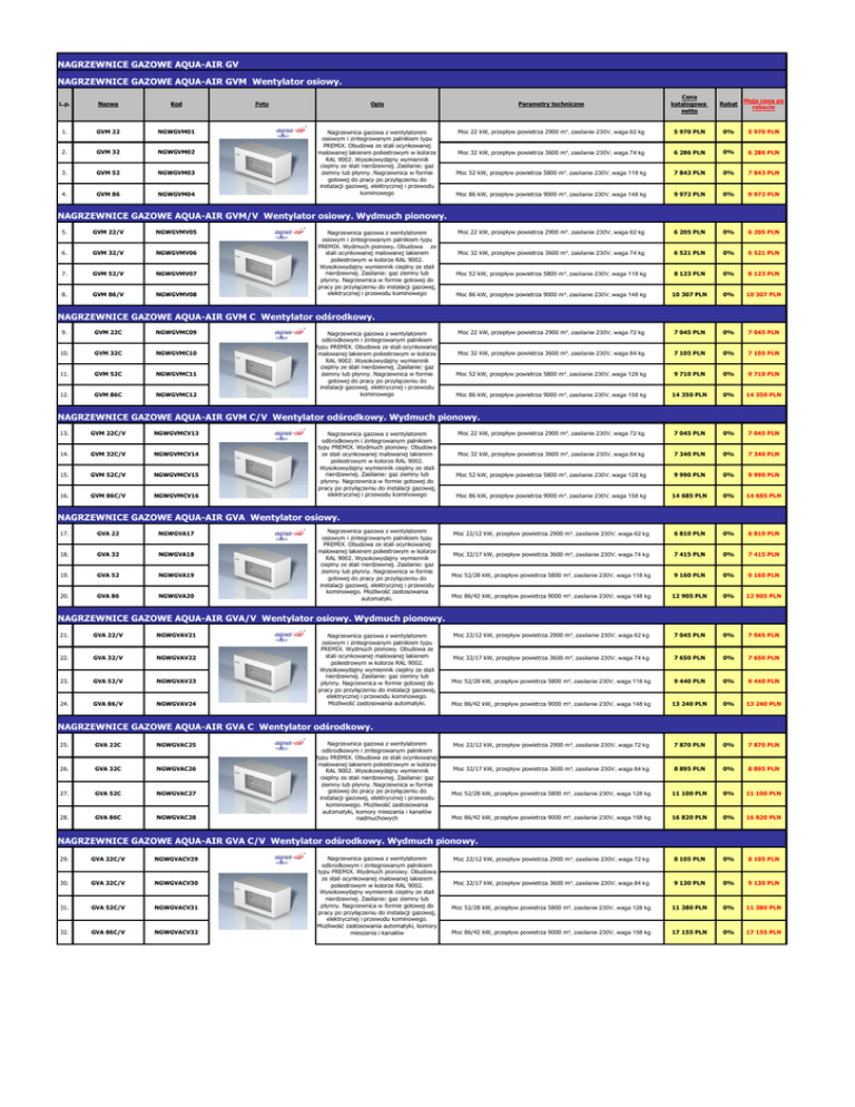NAGRZEWNICE GAZOWE AQUA-AIR GV NAGRZEWNICE GAZOWE AQUA-AIR GVM Wentylator osiowy. L.p. Nazwa Kod 1. GVM 22 NGWGVM01 2. GVM 32 NGWGVM02 3. GVM 52 NGWGVM03 4. GVM 86 NGWGVM04 Opis Parametry techniczne Cena katalogowa netto Rabat Moja cena po rabacie Nagrzewnica gazowa z wentylatorem osiowym i zintegrowanym palnikiem typu PREMIX. Obudowa ze stali ocynkowanej malowanej lakierem poliestrowym w kolorze RAL 9002. Wysokowydajny wymiennik cieplny ze stali nierdzewnej. Zasilanie: gaz ziemny lub płynny. Nagrzewnica w formie gotowej do pracy po przyłączeniu do instalacji gazowej, elektrycznej i przewodu kominowego Moc 22 kW, przepływ powietrza 2900 m³, zasilanie 230V, waga 62 kg 5 970 PLN 0% 5 970 PLN Moc 32 kW, przepływ powietrza 3600 m³, zasilanie 230V, waga 74 kg 6 286 PLN 0% 6 286 PLN Moc 52 kW, przepływ powietrza 5800 m³, zasilanie 230V, waga 118 kg 7 843 PLN 0% 7 843 PLN Moc 86 kW, przepływ powietrza 9000 m³, zasilanie 230V, waga 148 kg 9 972 PLN 0% 9 972 PLN Moc 22 kW, przepływ powietrza 2900 m³, zasilanie 230V, waga 62 kg 6 205 PLN 0% 6 205 PLN Moc 32 kW, przepływ powietrza 3600 m³, zasilanie 230V, waga 74 kg 6 521 PLN 0% 6 521 PLN Moc 52 kW, przepływ powietrza 5800 m³, zasilanie 230V, waga 118 kg 8 123 PLN 0% 8 123 PLN Moc 86 kW, przepływ powietrza 9000 m³, zasilanie 230V, waga 148 kg 10 307 PLN 0% 10 307 PLN Moc 22 kW, przepływ powietrza 2900 m³, zasilanie 230V, waga 72 kg 7 045 PLN 0% 7 045 PLN Moc 32 kW, przepływ powietrza 3600 m³, zasilanie 230V, waga 84 kg 7 105 PLN 0% 7 105 PLN Moc 52 kW, przepływ powietrza 5800 m³, zasilanie 230V, waga 128 kg 9 710 PLN 0% 9 710 PLN Moc 86 kW, przepływ powietrza 9000 m³, zasilanie 230V, waga 158 kg 14 350 PLN 0% 14 350 PLN Moc 22 kW, przepływ powietrza 2900 m³, zasilanie 230V, waga 72 kg 7 045 PLN 0% 7 045 PLN Moc 32 kW, przepływ powietrza 3600 m³, zasilanie 230V, waga 84 kg 7 340 PLN 0% 7 340 PLN Moc 52 kW, przepływ powietrza 5800 m³, zasilanie 230V, waga 128 kg 9 990 PLN 0% 9 990 PLN Moc 86 kW, przepływ powietrza 9000 m³, zasilanie 230V, waga 158 kg 14 685 PLN 0% 14 685 PLN Moc 22/12 kW, przepływ powietrza 2900 m³, zasilanie 230V, waga 62 kg 6 810 PLN 0% 6 810 PLN Moc 32/17 kW, przepływ powietrza 3600 m³, zasilanie 230V, waga 74 kg 7 415 PLN 0% 7 415 PLN Moc 52/28 kW, przepływ powietrza 5800 m³, zasilanie 230V, waga 118 kg 9 160 PLN 0% 9 160 PLN Moc 86/42 kW, przepływ powietrza 9000 m³, zasilanie 230V, waga 148 kg 12 905 PLN 0% 12 905 PLN Moc 22/12 kW, przepływ powietrza 2900 m³, zasilanie 230V, waga 62 kg 7 045 PLN 0% 7 045 PLN Moc 32/17 kW, przepływ powietrza 3600 m³, zasilanie 230V, waga 74 kg 7 650 PLN 0% 7 650 PLN Moc 52/28 kW, przepływ powietrza 5800 m³, zasilanie 230V, waga 118 kg 9 440 PLN 0% 9 440 PLN Moc 86/42 kW, przepływ powietrza 9000 m³, zasilanie 230V, waga 148 kg 13 240 PLN 0% 13 240 PLN Moc 22/12 kW, przepływ powietrza 2900 m³, zasilanie 230V, waga 72 kg 7 870 PLN 0% 7 870 PLN Moc 32/17 kW, przepływ powietrza 3600 m³, zasilanie 230V, waga 84 kg 8 895 PLN 0% 8 895 PLN Moc 52/28 kW, przepływ powietrza 5800 m³, zasilanie 230V, waga 128 kg 11 100 PLN 0% 11 100 PLN Moc 86/42 kW, przepływ powietrza 9000 m³, zasilanie 230V, waga 158 kg 16 820 PLN 0% 16 820 PLN Moc 22/12 kW, przepływ powietrza 2900 m³, zasilanie 230V, waga 72 kg 8 105 PLN 0% 8 105 PLN Moc 32/17 kW, przepływ powietrza 3600 m³, zasilanie 230V, waga 84 kg 9 130 PLN 0% 9 130 PLN Moc 52/28 kW, przepływ powietrza 5800 m³, zasilanie 230V, waga 128 kg 11 380 PLN 0% 11 380 PLN Moc 86/42 kW, przepływ powietrza 9000 m³, zasilanie 230V, waga 158 kg 17 155 PLN 0% 17 155 PLN Foto NAGRZEWNICE GAZOWE AQUA-AIR GVM/V Wentylator osiowy. Wydmuch pionowy. 5. GVM 22/V NGWGVMV05 6. GVM 32/V NGWGVMV06 7. GVM 52/V NGWGVMV07 8. GVM 86/V NGWGVMV08 Nagrzewnica gazowa z wentylatorem osiowym i zintegrowanym palnikiem typu PREMIX. Wydmuch pionowy. Obudowa ze stali ocynkowanej malowanej lakierem poliestrowym w kolorze RAL 9002. Wysokowydajny wymiennik cieplny ze stali nierdzewnej. Zasilanie: gaz ziemny lub płynny. Nagrzewnica w formie gotowej do pracy po przyłączeniu do instalacji gazowej, elektrycznej i przewodu kominowego NAGRZEWNICE GAZOWE AQUA-AIR GVM C Wentylator odśrodkowy. 9. GVM 22C NGWGVMC09 10. GVM 32C NGWGVMC10 11. GVM 52C NGWGVMC11 12. GVM 86C NGWGVMC12 Nagrzewnica gazowa z wentylatorem odśrodkowym i zintegrowanym palnikiem typu PREMIX. Obudowa ze stali ocynkowanej malowanej lakierem poliestrowym w kolorze RAL 9002. Wysokowydajny wymiennik cieplny ze stali nierdzewnej. Zasilanie: gaz ziemny lub płynny. Nagrzewnica w formie gotowej do pracy po przyłączeniu do instalacji gazowej, elektrycznej i przewodu kominowego NAGRZEWNICE GAZOWE AQUA-AIR GVM C/V Wentylator odśrodkowy. Wydmuch pionowy. 13. GVM 22C/V NGWGVMCV13 14. GVM 32C/V NGWGVMCV14 15. GVM 52C/V NGWGVMCV15 16. GVM 86C/V NGWGVMCV16 Nagrzewnica gazowa z wentylatorem odśrodkowym i zintegrowanym palnikiem typu PREMIX. Wydmuch pionowy. Obudowa ze stali ocynkowanej malowanej lakierem poliestrowym w kolorze RAL 9002. Wysokowydajny wymiennik cieplny ze stali nierdzewnej. Zasilanie: gaz ziemny lub płynny. Nagrzewnica w formie gotowej do pracy po przyłączeniu do instalacji gazowej, elektrycznej i przewodu kominowego NAGRZEWNICE GAZOWE AQUA-AIR GVA Wentylator osiowy. 17. GVA 22 NGWGVA17 18. GVA 32 NGWGVA18 19. GVA 52 NGWGVA19 20. GVA 86 NGWGVA20 Nagrzewnica gazowa z wentylatorem osiowym i zintegrowanym palnikiem typu PREMIX. Obudowa ze stali ocynkowanej malowanej lakierem poliestrowym w kolorze RAL 9002. Wysokowydajny wymiennik cieplny ze stali nierdzewnej. Zasilanie: gaz ziemny lub płynny. Nagrzewnica w formie gotowej do pracy po przyłączeniu do instalacji gazowej, elektrycznej i przewodu kominowego. Możliwość zastosowania automatyki. NAGRZEWNICE GAZOWE AQUA-AIR GVA/V Wentylator osiowy. Wydmuch pionowy. 21. GVA 22/V NGWGVAV21 22. GVA 32/V NGWGVAV22 23. GVA 52/V NGWGVAV23 24. GVA 86/V NGWGVAV24 Nagrzewnica gazowa z wentylatorem osiowym i zintegrowanym palnikiem typu