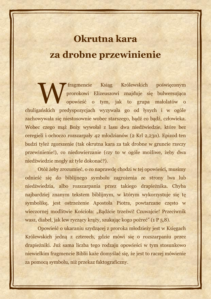 Okrutna kara za drobne przewinienie W fragmencie Ksiąg Królewskich poświęconym prorokowi Elizeuszowi znajduje się bulwersująca opowieść o tym, jak to grupa małolatów o chuligańskich predyspozycjach wyzywała go od łysych i w ogóle zachowywała się niestosownie wobec starszego, bądź co bądź, człowieka. Wobec czego mąż Boży wywołał z lasu dwa niedźwiedzie, które bez ceregieli i ochoczo rozszarpały 42 młodzianów (2 Krl 2,23n). Epizod ten budzi tyleż zgorszenie (tak okrutna kara za tak drobne w gruncie rzeczy przewinienie!), co niedowierzanie (czy to w ogóle możliwe, żeby dwa niedźwiedzie mogły aż tyle dokonać?). Otóż żeby zrozumieć, o co naprawdę chodzi w tej opowieści, musimy odnieść się do biblijnego symbolu zagrożenia ze strony lwa lub niedźwiedzia, albo rozszarpania przez takiego drapieżnika. Chyba najbardziej znanym tekstem biblijnym, w którym wykorzystuje się tę symbolikę, jest ostrzeżenie Apostoła Piotra, powtarzane często w wieczornej modlitwie Kościoła: „Bądźcie trzeźwi! Czuwajcie! Przeciwnik wasz, diabeł, jak lew ryczący krąży, szukając kogo pożreć” (1 P 5,8). Opowieść o ukaraniu szydzącej z proroka młodzieży jest w Księgach Królewskich jedną z czterech, gdzie mówi się o rozszarpaniu przez drapieżniki. Już sama liczba tego rodzaju opowieści w tym stosunkowo niewielkim fragmencie Biblii każe domyślać się, że jest to raczej mówienie za pomocą symbolu, niż przekaz faktograficzny. Przypomnijmy te opowieści, na razie nie wnikając w ich treść symboliczną. Najpierw został rozszarpany przez lwa pewien autentyczny prorok, rzetelnie posłuszny Bożym rozkazom, za to, że wygoda zagłuszyła w nim krytycyzm i dał sobie wytłumaczyć, jakoby rozkaz Boży uległ pewnej korekcie (1 Krl 13,11-32). Nasz zmysł moralny może poczuć się jeszcze bardziej obrażony opowieścią następną - o człowieku, który został ukarany rozszarpaniem przez lwa, bo nie chciał uderzyć proroka, kiedy on mu to nakazywał (1 Krl 20,35n). Opowieść trzecia, o rozszarpaniu chłopców przez dwa niedźwiedzie, za to, że szydzili z łysiny Elizeusza jest przedmiotem niniejszego listu. Mamy ponadto opowieść o pladze lwów wśród pogan, jakich po opanowaniu Izraela sprowadzili na te ziemie Asyryjczycy; plaga ustała dopiero wówczas, kiedy ludność ta nauczyła się oddawać cześć Bogu Prawdziwemu (2 Krl 17,25-28). Wyjaśnienie symbolicznej treści, jaka jest zawarta w motywie rozszarpania przez drapieżnika, znaleźć można w Księdze Mądrości: „Zesłałeś na nich mnóstwo nierozumnych zwierząt - czytamy o pladze drapieżników zesłanej na Egipt - by wiedzieli, że przez co kto grzeszy, przez to ponosi karę” (Mdr 11,15n). Egipcjanie zaś zgrzeszyli tym, że „wymysłami nieprawości zwiedzeni czcili nierozumne gady i marne zwierzęta”. Nawiasem dodajmy, że wzmianka o takiej karze na Egipcjan jest fragmentem przepięknego tekstu, wysławiającego Boga za to, że nawet dla bezbożnych Egipcjan jest miłosierny i litościwy (Mdr 11,15-12,2). „Nad wszystkim masz litość - wyjaśnia się w tym tekście, dlaczego Bóg kocha nawet Egipcjan - bo wszystko w Twej mocy, i oczy zamykasz na grzechy ludzi, by się nawrócili. Miłujesz bowiem wszystkie stworzenia, niczym się nie brzydzisz, co uczyniłeś, bo gdybyś miał coś w nienawiści, nie byłbyś tego uczynił. (...) Dlatego nieznacznie karzesz upadających i strofujesz, przypominając, w czym grzeszą, by wyzbywszy się złości, w Ciebie, Panie, uwierzyli” (Mdr 11,23n i 12,2). Cóż, czytając Biblię, musimy się uczyć prawidłowego rozumienia wypowiedzi sformułowanych przez inną mentalność niż nasza. Ale wracajmy do naszego symbolu. Bardzo możliwe, że wszystkie cztery opowieści Ksiąg Królewskich o rozszarpaniu przez drapieżniki powstały z tej samej intuicji, że „przez co kto grzeszy, przez to ponosi karę”. Sprzeniewierzenie się ludzkiej godności i upodobnienie się do nierozumnych zwierząt polegałoby na nieznajomości Boga i płynącemu stąd nieposłuszeństwu Jego prawu. I rzeczywiście, jeśli wczytamy się w te cztery opowieści, w każdej z nich ten właśnie moment jest jednoznacznie sformułowany. My skupmy się nad epizodem rozszarpania przez niedźwiedzie chłopców, którzy szydzili z proroka Elizeusza. Niezwykle istotnym szczegółem dla zrozumienia tego epizodu jest okoliczność miejsca: że działo się to w Betel, gdzie znajdowało się sanktuarium Boga Prawdziwego, jednak sanktuarium nieprawe, którego centrum stanowił posąg złotego cielca, mający wyobrażać Boga Prawdziwego. Autorem tej instytucjonalizacji grzechu spod góry Synaj (por. Wj 32), grzechu polegającego na wyobrażaniu sobie Boga na wzór potęg tego świata, a konkretnie na wzór „byka jedzącego siano” (Ps 106,20), był sprawca rozbicia Izraela, król Jeroboam: „Król sporządził dwa cielce i ogłosił ludowi: <Zbyteczne jest, abyście chodzili do Jerozolimy. Izraelu, oto Bóg twój, który cię wyprowadził z ziemi egipskiej!> Postawił zatem jednego w Betel, a drugiego umieścił w Dan. To oczywiście doprowadziło do grzechu, bo lud poszedł do jednego do Betel i do drugiego aż do Dan” (1 Krl 13, 28-30). Koniecznie zauważmy, że zapis ten znajduje się właśnie w Księdze Królewskiej. Tu warto przypomnieć, że w ogóle Księgi Królewskie są tą częścią Biblii, gdzie szczególnie mocno ostrzega się przed nieprawym kultem Boga Prawdziwego, a zwłaszcza przed dwiema jego postaciami: Nie wolno Boga czcić razem z jakimiś bożkami, nie wolno Go też czcić na wzór bożków symbolizujących potęgi tego świata. Stąd autor Ksiąg Królewskich jest wielkim przeciwnikiem kultu „na wyżynach” (por. 1 Krl 14,22n; 15,14; 22,44; 2 Krl 12,4; 15,4 i 35; 16,4, itd.), gdzie czczono jednocześnie Boga Prawdziwego i bożków. Stąd również w Księgach Królewskich znajdziemy jednoznaczne wypowiedzi przeciwko sanktuarium