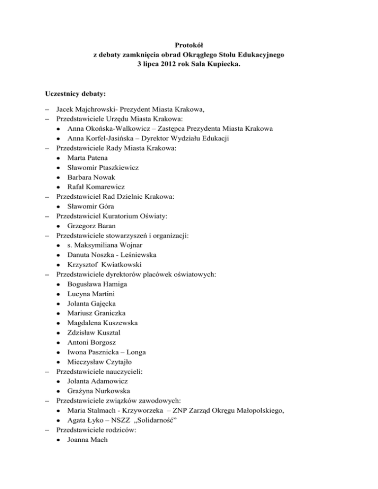 Protokół z debaty zamknięcia obrad Okrągłego Stołu Edukacyjnego 3 lipca 2012 rok Sala Kupiecka. Uczestnicy debaty: Jacek Majchrowski- Prezydent Miasta Krakowa, Przedstawiciele Urzędu Miasta Krakowa: Anna Okońska-Walkowicz – Zastępca Prezydenta Miasta Krakowa Anna Korfel-Jasińska – Dyrektor Wydziału Edukacji Przedstawiciele Rady Miasta Krakowa: Marta Patena Sławomir Ptaszkiewicz Barbara Nowak Rafał Komarewicz Przedstawiciel Rad Dzielnic Krakowa: Sławomir Góra Przedstawiciel Kuratorium Oświaty: Grzegorz Baran Przedstawiciele stowarzyszeń i organizacji: s. Maksymiliana Wojnar Danuta Noszka - Leśniewska Krzysztof Kwiatkowski Przedstawiciele dyrektorów placówek oświatowych: Bogusława Hamiga Lucyna Martini Jolanta Gajęcka Mariusz Graniczka Magdalena Kuszewska Zdzisław Kusztal Antoni Borgosz Iwona Pasznicka – Longa Mieczysław Czytajło Przedstawiciele nauczycieli: Jolanta Adamowicz Grażyna Nurkowska Przedstawiciele związków zawodowych: Maria Stalmach - Krzyworzeka – ZNP Zarząd Okręgu Małopolskiego, Agata Łyko – NSZZ „Solidarność” Przedstawiciele rodziców: Joanna Mach Michał Sterecki Aleksandra Czosnowska Andrzej Sewioł Moderatorzy debaty: Aleksandra Wagner, Piotr Tomza. Nieobecni na debacie: Pani Renata Grotowska – nieobecność usprawiedliwiona. Przebieg spotkania: Spotkanie otworzyła Pani Aleksandra Wagner oraz Pan Piotr Tomza moderatorzy OSE. Pani moderator przywitała wszystkich zebranych uczestników Okrągłego Stołu Edukacyjnego (OSE). Wnioski z prezentacji Pani Anny Okońskiej – Walkowicz Zastępcy Prezydenta dotyczące podsumowania obrad OSE: Działania UM Krakowa w zakresie edukacji wynikające z wybranych wniosków okrągłego stołu • Kontynuowanie obrad OSE w roku szkolnym 2012/2013 z częstotliwością średnio co 3 tygodnie , z ustalonym harmonogramem: 4.09,11.09, 25.09,2.10,16.10,30.10 etc. • Powołanie zespołów doradczych dla z-cy Prezydenta Miasta Krakowa i WE spośród uczestników OSE Strategia Edukacyjna Miasta Krakowa • Dopracować projekt MISTI Strategia Rozwoju Edukacji Miasta Krakowa w oparciu o zespoły robocze składające się z wszystkich uczestników OSE i przedstawić ją pod ponowne obrady Rady Miasta do końca 2012 roku./ Konferencje konsyliacyjne/ • Opracować kryteria ryzyka dla szkół w konsultacji z zespołami powstałymi z uczestników OSE i wprowadzić je Zarządzeniem Prezydenta Miasta Krakowa do 15 września 2012 • Upowszechnianie idei autonomii szkoły i jej dyrektora • Przygotowywanie dokumenty dotyczących polityki edukacyjnej i podejmowanych działań w sposób jasny i czytelny. Edukacja pozaszkolna • Promowanie różnorodnych form działalności pozaszkolnej. • Informowanie rodziców uczestników zajęć stałych w MDK o kosztach, jakie ponosi miasto w związku z prowadzonymi zajęciami dla ich dzieci. Informacje o całorocznych kosztach zajęć, na które zapisane jest dziecko powinny być przekazywane pisemnie przez dyrekcję MDK Restrukturyzacja sieci szkolnej • Opracowanie sieci szkolnej z uwzględnieniem placówek samorządowych niesamorządowych. Przekształcenie szkół integracyjnych w szkoły ogólnodostępne z oddziałami integracyjnymi Wypracowanie standardów dla każdego typu szkoły / ryzyka /, których brak naraża szkołę na likwidację. Do końca października przedstawić Radzie Miasta Krakowa oparte na skonsultowanej z OSE liście ryzyk propozycje likwidacji szkół i ewentualnych połączeń. Szkoły na obrzeżach Krakowa Opracowanie programu wsparcia szkół na obrzeżach Krakowa z uwagi na wielorakie role spełniane przez nie na rzecz społeczności lokalnej. Ewentualne przekształcenia w publiczne placówki niesamorządowe będą możliwe za sprawą lokalnych towarzystw. Szkolnictwo specjalne • Ustalanie sieci szkół specjalnych z uwzględnieniem szkolnictwa integracyjnego • Zorganizowanie centrum Autyzmu • Zorganizowanie MOS Szkolnictwo zawodowe • Wypracowanie modelu kształcenia zawodowego obowiązującego w Krakowie wspólnie z zespołem ds. szkolnictwa zawodowego i przedstawicielami OSE • Wdrożenie Krakowskiego Programu Doradztwa Zawodowego w gimnazjach, który pomoże w wypromować szkolnictwo zawodowe • Powołanie zespołu doradczego dla Zastępcy Prezydenta Miasta ds. szkolnictwa zawodowego • Uwzględnienie uczniów niepełnosprawnych w opracowywaniu planów rozwoju szkolnictwa zawodowego • Dokonanie inwentaryzacji krakowskich zasobów służących szkoleniu praktycznemu Następnie Pani moderator przedstawiła krótkie podsumowanie 6 debat merytorycznych OSE z pogrupowaniem wniosków na poszczególne działy przedstawiając kilka przykładów: Następnie głos zabrała Pani B. Hamiga przedstawiając swój dodatkowy wniosek z prośbą o umieszczenie w protokole. Następnie uczestnicy zabrali głos podsumowując obrady: Z. Kusztal- Jestem przeciwny wnioskowi Pani B. Hamigi. Miasto ma ogłaszać przetarg na prowadzenie publicznych placówek. Wśród dyrektorek przedszkoli nie ma właściwych kandydatek. Rozumiem, że kadra przedszkoli nie jest przygotowana i nie kompetentna do prowadzenia przedszkoli publicznych. Jestem za tym, aby Miasto nie utrudniało w takich pracach jak wybudowanie przedszkoli przez inne podmioty itp. Dobrze funkcjonujące przedszkola niech funkcjonują dalej na tych samych zasadach. Miasto powinno cieszyć się z tego, że ma tak dobre przedszkola i powinno je wspierać. J. Gajęcka – Musimy się przyjrzeć Strategii Rozwoju Edukacji i musimy ja wspólnie stworzyć. W oparciu o strategię ekspercką musimy dołożyć jeszcze strategię partycypacyjną, czyli połączyć ekspertów z praktykami. Musimy stworzyć strategię, która nam powie, w którym kierunku będziemy się rozwijać jeżeli chodzi o edukacje w Krakowie. Należy ustalić główne cele do jakich będziemy zmierzać. Wszyscy chcemy, aby środki wpływały na jakość Edukacji, ale przez kilka najbliższych lat będziemy musieli oszczędza