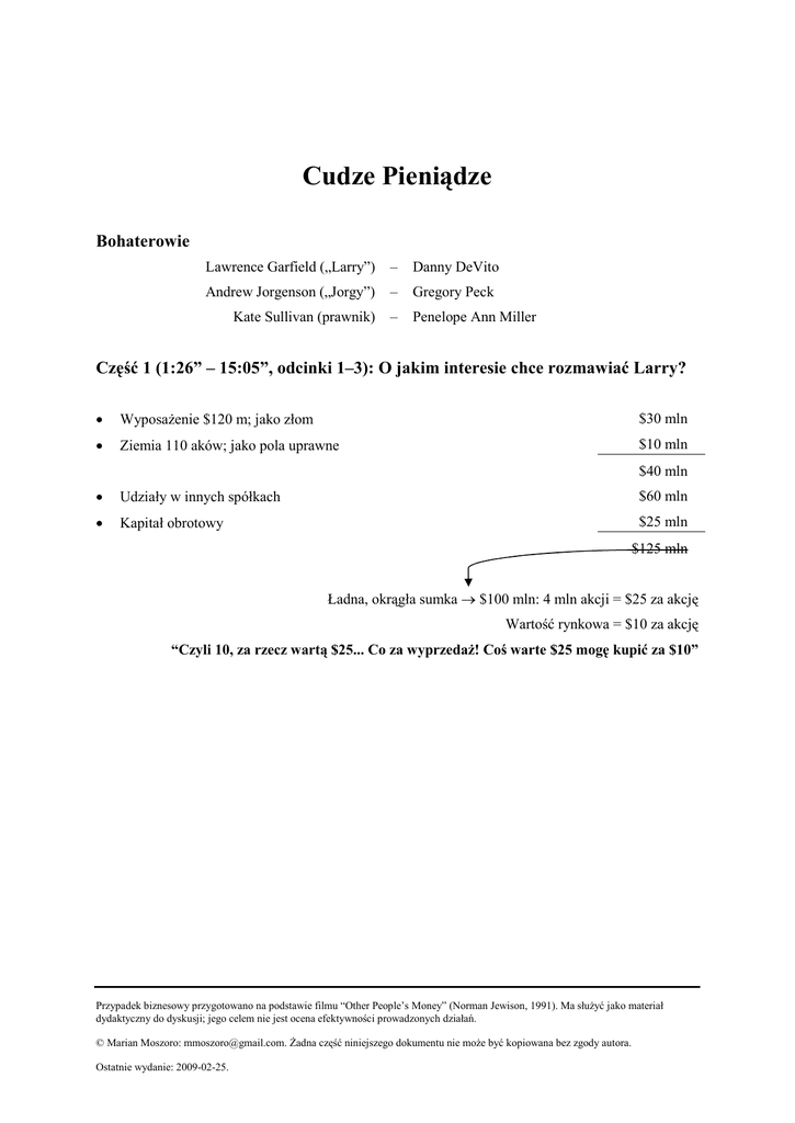 Cudze Pieniądze Bohaterowie Lawrence Garfield („Larry”) – Danny DeVito Andrew Jorgenson („Jorgy”) – Gregory Peck Kate Sullivan (prawnik) – Penelope Ann Miller Część 1 (1:26” – 15:05”, odcinki 1–3): O jakim interesie chce rozmawiać Larry? • WyposaŜenie $120 m; jako złom $30 mln • Ziemia 110 aków; jako pola uprawne $10 mln $40 mln • Udziały w innych spółkach $60 mln • Kapitał obrotowy $25 mln $125 mln Ładna, okrągła sumka → $100 mln: 4 mln akcji = $25 za akcję Wartość rynkowa = $10 za akcję “Czyli 10, za rzecz wartą $25... Co za wyprzedaŜ! Coś warte $25 mogę kupić za $10” Przypadek biznesowy przygotowano na podstawie filmu “Other People’s Money” (Norman Jewison, 1991). Ma słuŜyć jako materiał dydaktyczny do dyskusji; jego celem nie jest ocena efektywności prowadzonych działań. © Marian Moszoro: [email protected]. śadna część niniejszego dokumentu nie moŜe być kopiowana bez zgody autora. Ostatnie wydanie: 2009-02-25. Cudze pieniądze Część 2 (1:13:31” – 1:21:22”, odcinek 19): Co Jorgy robi dla społeczeństwa? Andrew Jorgenson przemawia do akcjonariuszy New England Wire & Cable Co. Prezes Coles: Mogę prosić o uwagę? Witam na dorocznym zebraniu akcjonariuszy New England Wire & Cable. Nazywam się William J. Coles i jestem Prezesem Zarządu. I jestem pewny... Jestem pewny, Ŝe kaŜdy zdaje sobie sprawę, Ŝe najwaŜniejszym punktem harmonogramu jest wybór członków zarządu. Pracownicy rozdadzą państwu karty do głosowania. A teraz, z dumą mogę państwu przedstawić człowieka, którego moŜna celnie opisać jako legendę produkcji drutów i kabli. Przewodniczący Rady New England Wire & Cable Pan Andrew Jorgenson. Jorgenson: Dobrze jest widzieć, tak wiele znanych twarzy, tak wielu starych przyjaciół. Niektórych z was nie widziałem od wielu lat. Dziękuję za przybycie. Bill Coles, nasz zdolny przewodniczący, opisał wam w dorocznym raporcie rok rozrachunkowy, co osiągnęliśmy, potrzebę dalszych ulepszeń nasze cele na rok następny i na kolejne lata. Ale chciałbym porozmawiać z wami o czymś jeszcze. Chciałbym podzielić się z wami moimi marzeniami odnośnie głosowania w firmie, której jesteście właścicielami. Do tej dumnej firmy, która przetrwała śmierć swojego załoŜyciela, wiele recesji, jeden wielki krach i dwie wojny światowe nieuchronnie zbliŜa się niebezpieczeństwo samozniszczenia. Dzisiaj, w mieście swoich narodzin. Tam znajduje się narzędzie naszego zniszczenia. Chciałbym, Ŝebyście się mu przyjrzeli, w całej jego świetności. „Larry likwidator”, przedsiębiorca post-industrialnej Ameryki, udający Boga pieniędzmi innych ludzi. Magnaci okradający starszych ludzi, zostawili przynajmniej coś konkretnego po sobie. Kopalnie węgla, szlaki kolejowe, banki. Ten człowiek nic nie zostawi. Nic nie tworzy. Nic nie buduje. Niczym nie zarządza. A w tym, co robi nie ma nic, poza nawałem papieru, na uśmierzenie bólu. A jeśli powie: „Lepiej od was wiem jak waszą prowadzić firmę”, to jego słowa byłyby warte rozwaŜenia. Ale on tego nie mówi. On mówi: ,,Zabiję cię, bo w tym, konkretnym momencie, jesteś więcej warty martwy niŜ Ŝywy”. Więc, moŜe to prawda, ale prawdą jest równieŜ, Ŝe któregoś dnia, ta firma z powrotem się podniesie. Któregoś dnia, kiedy jen będzie słabszy, a dolar silniejszy, albo kiedy w końcu zaczniemy przebudowywać nasze drogi, nasze mosty, to ilość materiałów potrzebnych na infrastrukturę ogromnie wzrośnie. A kiedy to się stanie, ciągle tu będziemy, silniejsi przez nasze męki, przez to, Ŝe przetrwaliśmy. A cena naszych akcji sprawi, Ŝe jego oferta zblednie w porównaniu. BoŜe, miej nas w swojej opiece, jeśli zagłosujemy za wzięciem kilku jego nędznych dolarów i ucieczką. BoŜe, miej ten kraj w opiece, jeśli taki naprawdę jest powiew przyszłości. Wtedy staniemy się nacją, która nie robi nic oprócz hamburgerów, nie tworzy nic, oprócz prawników i sprzedaje tylko ochronę przed podatkami. A kiedy juŜ dojdzie do takiej sytuacji, Ŝe zabijemy coś, bo w naszym kraju, w danej chwili będzie warte więcej martwe niŜ Ŝywe, to rozejrzyjcie się. Spójrzcie na swojego sąsiada. Spójrzcie na sąsiada. Nie zabijecie go, prawda? Nie. To jest morderstwo i jest nielegalne. To teŜ jest morderstwo. Na skalę masową. Tylko na Wall Street nazywają to maksymalizacją wartości dla udziałowców. I twierdzą, Ŝe jest to legalne. I zastępują sumienie rachunkami dolarowymi. Psia krew! Firma jest więcej warta, niŜ cena jej akcji. To jest miejsce gdzie zarabiamy na Ŝycie, gdzie spotykamy się z przyjaciółmi, śnimy o naszych marzeniach. To jest, w kaŜdym znaczeniu tego słowa: „materiał”, łączący razem nasze społeczeństwo. Więc na tym zebraniu, powiedzmy kaŜdemu Garfield'owi na świecie, Ŝe tutaj budujemy, a nie niszczymy. Tutaj, bardziej niŜ o cenę akcji, troszczymy się o ludzi. —2— Cudze pieniądze Część 3 (1:21:22” – 1:27:40”, odcinek 20): Co Larry robi dla społeczeństwa? Larry "Likwidator" Garfield przemawia do akcjonariuszy New England Wire & Cable Co. Prezes Coles: A teraz chciałbym przedstawić pana Lawrence'a Garfield'a. Pan Garf... przepraszam... proszę. PokaŜmy trochę dobrych manier, panie i panowie. Pan Garfield jest Przewodniczącym i Prezesem Zarządu Garfield Investments. Pan Garfield. Garfield: Amen. I amen. I amen. Musicie mi wybaczyć. Nie znam tutejszych zwyczajów. Tam, skąd pochodzę, zawsze się mówi: ,,amen", jeśli się wysłuchało modlitwy. Bo to właśnie usłyszeliście. Modlitwę. Tam, skąd pochodzę, właśnie ta modlitwa, jest nazywana modlitwą za zmarłych. Właśnie usłyszeliście modlitwę za zmarłych, moi drodzy akcjonariusze. I nie powiedzieliście: „amen”. Ta firma jest martwa. Nie zabiłem jej. Nie wińcie mnie. Była juŜ martwa, kiedy tu przyszedłem. JuŜ za późno na modły. Nawet, jeśli modlitwa 