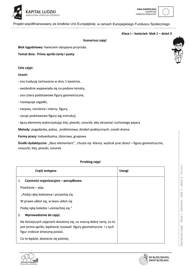 Klasa I – kwiecień- blok 1 – dzień 3 Scenariusz zajęć Blok tygodniowy: Kwieciem obsypana przyroda. Temat dnia: Prima aprilis-żarty i psoty. Cele zajęć: Uczeń: - zna tradycję żartowania w dniu 1 kwietnia, - swobodnie wypowiada się na podane tematy, - zna cztery podstawowe figury geometryczne, - rozwiązuje zagadki, - nazywa, rozróżnia i mierzy figury, - rysuje podstawowe figury wg instrukcji, - łączy elementy wykorzystując klej, pinezki, sznurek, aby otrzymać ruchomego pajaca Metody: pogadanka, pokaz, problemowa, działań praktycznych, scenki drama Formy pracy: indywidualna, zbiorowa, grupowa Środki dydaktyczne: „Nasz elementarz” , chusta np. Klanza, wydruk prac dzieci – figury geometryczne, nożyczki, klej, pinezki, sznurek Część wstępna 1. Czynności organizacyjno – porządkowe. Powitanie – pląs „Podaj rękę koleżance i przywitaj się W prawo ukłoń się, w lewo ukłoń się Podaj rękę koledze i uśmiechnij się.” 2. Wprowadzenie do zajęć. Na dzisiejszych zajęciach dowiemy się, co znaczą dobre żarty, co to jest prima aprilis, będziecie rysowali figury geometryczne i z tych figur zrobicie śmieszną postać. Co to będzie, dowiecie się później. Uwagi Scenariusz zajęć klasa I – Kwiecień - blok 1 – dzień 3 - Strona1 Przebieg zajęć Część główna zajęć 1. Zabawa z chustą – Uśmiechnięte dzieci Chusta np.:Klanzy Dzieci stoją w kręgu, trzymają w rekach chustę. Nauczyciel zaprasza pod chustę dzieci, które: -Witam tych, którzy: -lubią się śmiać, -lubią, gdy inni uśmiechają się do nich, -znają kilka dobrych dowcipów, -mają dobre poczucie humoru, -potrafią śmiać się także z siebie, -wiedzą, że śmiech, to zdrowie, -uśmiechnęli się dziś do kogoś, -potrafią rozśmieszać innych. 2. Zabawa na wesoło – „Jestem smuty – rozwesel mnie” Połowa dzieci smutnych trzyma chustę, a pozostali wchodzą pod chustę, przez chwilę wymyślają sposób rozśmieszenia. Dziecko wychodzi spod chusty ze śmieszną miną. Kiedy uda mu się rozśmieszyć , następuje zamiana ról. 3. Rozmowa na temat: „co znaczy prima aprilis? - Czym dzisiejszy dzień różni się od innych? Swobodne odpowiedzi dzieci. Następnie nauczyciel wyjaśnia znaczenie powiedzenia –prima aprilis i związanych z tym dniem zwyczajów. 4. Znaczenie humoru w życiu codziennym -Dlaczego ludzie lubią się śmiać? -Dlaczego lubią, gdy inni się do nich uśmiechają? -Dlaczego warto się uśmiechać? - Jak sadzisz, jaki byłby nasz świat bez uśmiechu? 5. Żarty i dowcipy w grupach. Dzieci dzielą się na grupy, w grupach opowiadają śmieszne historie. Na forum klasy prezentują swoje historyjki. Wszystkie dzieci otrzymują brawa. Najśmieszniejsza –zdaniem dzieci- historia, otrzymuje najgłośniejsze brawa. 6. Zagadki Liczmanka: Scenariusz zajęć klasa I – Kwiecień - blok 1 – dzień 3 - Strona2 - Dlaczego zaproponowałam dziś zabawę w rozśmieszanie? Zagadka o kołach Mogą być cztery, mogą być dwa, ma je samochód i rower ma. Zagadka o kwadracie Zagadka zaczyna się stąd, że jest w nim prosty każdy kąt. Zagadki Liczmanka. No i zawsze, mój kolego, równe boki w nim. Zagadka o prostokącie Mam cztery rogi, dwa krótkie i dwa długie boki. Kwadratem nie jestem, choć mam kąty proste. Zagadka o trójkątach My wszystkiego mamy trzy. Ach, jak wesoło mieć trzy boki i trzy kąty. Trzy wierzchołki także mamy każdej pracy radę damy. 7. Zabawy z Liczmankiem – utrwalenie znajomości kształtu figur. -Dzieci zasłaniają oczy ręką , nauczyciel wymienia nazwy figur, dzieci rysują w powietrzu ręką. - Nauczyciel pokazuje figurę, a dzieci modelują ją swoim ciałem na dywanie. -Dzieci trzymają się za ręce. Na polecenia nauczyciela tworzą wspólnie podaną figurę. 8. Komputerowe rysowanie figur geometrycznych. - Uczniowie dostają kartki z poleceniami, czytają ze zrozumieniem i wykonują pracę. -Narysujcie czerwone koło zamalowane i niebieskie niezamalowane. -Narysujcie żółty trójkąt zamalowany i zielony niezamalowany. Scenariusz zajęć klasa I – Kwiecień - blok 1 – dzień 3 - Strona3 i pracując na trzy fronty, -Narysujcie różowy prostokąt zamalowany i granatowy niezamalowany. -Narysujcie zielony kwadrat zamalowany i czerwony nie zmalowany. Sprawdzenie poprawności wykonanej pracy i ocena. Prace uczniów należy wydrukować, będą wykorzystane w dalszej części zajęć. Jeślim nie ma takiej możliwości nauczyciel sam przygotowuje figury do wycięcia. 9. Wycinanie figur geometrycznych. Praca indywidualna uczniów. Przypomnienie o bezpiecznym posługiwaniu się nożyczkami. Przypomnienie o estetyce wykonania pracy. Przystąpienie do pracy. 10.Rozmowa kierowana pytaniami N. np.: - Jakie figury macie przed sobą? - Jakiego są koloru? - Czy są figury podobne? - Czym się różnią? 11.Układanie dowolnych kompozycji z wyciętych figur. - Spróbujcie z tych figur ułożyć jakąś kompozycję. -Co ułożyliście? (U. omawiają swoje prace) 13.Wykonanie pajaca przez dzieci. Demonstracja pajaca. - Ja z tych figur zrobiłam ruchomego pajaca i na dzisiejszej lekcji wy też spróbujecie go zmontować. Omówienie budowy i zasady działania pajaca. - Na początku sklejamy głowę z tułowiem i przyklejamy czapkę. Możemy też wzmocnić konstrukcję pinezkami. - Pinezkami umocujemy nogi i ręce, z przodu wbijamy pinezką z tyłu pinezki wkładamy koreczek. - Na końcu ręce i nogi łączymy nitką. - Robimy próbę działania pajaca. Bezpieczeństwo podczas konstrukcji pajaca. Demonstracja i ocena wykonanych pajaców. Pajace odkładamy do kącika np.: teatralnego, wykorzystujemy je do zabaw swobodnych dzieci. Scenariusz zajęć klasa I – Kwiecień - blok 1 – dzień 3 - Strona4 12.Zabawa przy dowolnej muzyce – „Pajace”. Część końcowa zajęć Podsumowanie zajęć. 1. O czym mówiliśmy na dzisiejszych zajęciach? 2. Co wam sprawiło dzisiaj radość? 4. Czy zadowoleni jesteście z wyk