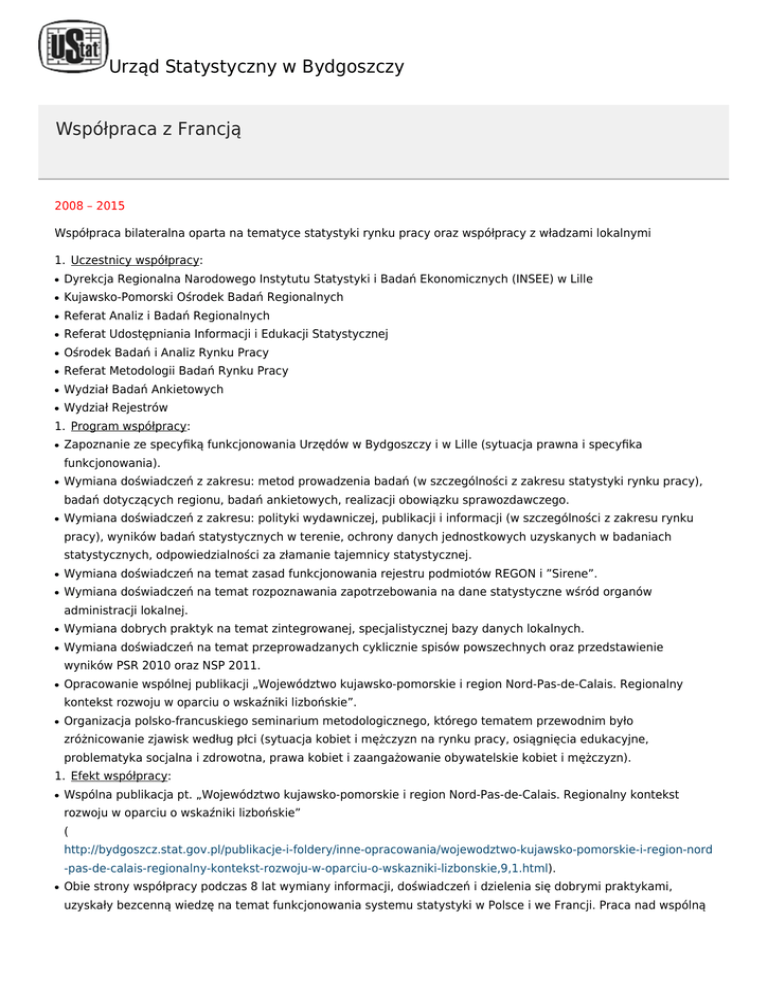 Urząd Statystyczny w Bydgoszczy Współpraca z Francją 2008 – 2015 Współpraca bilateralna oparta na tematyce statystyki rynku pracy oraz współpracy z władzami lokalnymi 1. Uczestnicy współpracy: ● Dyrekcja Regionalna Narodowego Instytutu Statystyki i Badań Ekonomicznych (INSEE) w Lille ● Kujawsko-Pomorski Ośrodek Badań Regionalnych ● Referat Analiz i Badań Regionalnych ● Referat Udostępniania Informacji i Edukacji Statystycznej ● Ośrodek Badań i Analiz Rynku Pracy ● Referat Metodologii Badań Rynku Pracy ● Wydział Badań Ankietowych ● Wydział Rejestrów 1. Program współpracy: ● Zapoznanie ze specyfiką funkcjonowania Urzędów w Bydgoszczy i w Lille (sytuacja prawna i specyfika funkcjonowania). ● Wymiana doświadczeń z zakresu: metod prowadzenia badań (w szczególności z zakresu statystyki rynku pracy), badań dotyczących regionu, badań ankietowych, realizacji obowiązku sprawozdawczego. ● Wymiana doświadczeń z zakresu: polityki wydawniczej, publikacji i informacji (w szczególności z zakresu rynku pracy), wyników badań statystycznych w terenie, ochrony danych jednostkowych uzyskanych w badaniach statystycznych, odpowiedzialności za złamanie tajemnicy statystycznej. ● Wymiana doświadczeń na temat zasad funkcjonowania rejestru podmiotów REGON i ”Sirene”. ● Wymiana doświadczeń na temat rozpoznawania zapotrzebowania na dane statystyczne wśród organów administracji lokalnej. ● Wymiana dobrych praktyk na temat zintegrowanej, specjalistycznej bazy danych lokalnych. ● Wymiana doświadczeń na temat przeprowadzanych cyklicznie spisów powszechnych oraz przedstawienie wyników PSR 2010 oraz NSP 2011. ● Opracowanie wspólnej publikacji „Województwo kujawsko-pomorskie i region Nord-Pas-de-Calais. Regionalny kontekst rozwoju w oparciu o wskaźniki lizbońskie”. ● Organizacja polsko-francuskiego seminarium metodologicznego, którego tematem przewodnim było zróżnicowanie zjawisk według płci (sytuacja kobiet i mężczyzn na rynku pracy, osiągnięcia edukacyjne, problematyka socjalna i zdrowotna, prawa kobiet i zaangażowanie obywatelskie kobiet i mężczyzn). 1. Efekt współpracy: ● Wspólna publikacja pt. „Województwo kujawsko-pomorskie i region Nord-Pas-de-Calais. Regionalny kontekst rozwoju w oparciu o wskaźniki lizbońskie” ( http://bydgoszcz.stat.gov.pl/publikacje-i-foldery/inne-opracowania/wojewodztwo-kujawsko-pomorskie-i-region-nord -pas-de-calais-regionalny-kontekst-rozwoju-w-oparciu-o-wskazniki-lizbonskie,9,1.html). ● Obie strony współpracy podczas 8 lat wymiany informacji, doświadczeń i dzielenia się dobrymi praktykami, uzyskały bezcenną wiedzę na temat funkcjonowania systemu statystyki w Polsce i we Francji. Praca nad wspólną publikacją była doskonałą okazją do ukazania podobieństw i różnic między dwoma regionami, co stanowi jedną z podstaw kontynuowania współpracy.