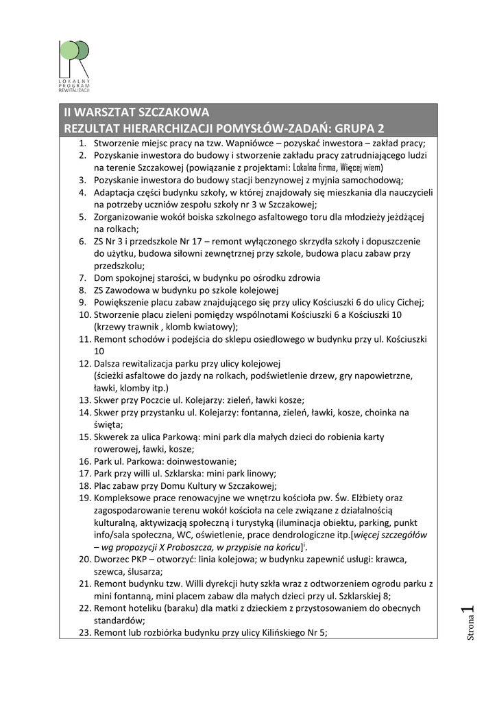 Strona 1. Stworzenie miejsc pracy na tzw. Wapniówce – pozyskać inwestora – zakład pracy; 2. Pozyskanie inwestora do budowy i stworzenie zakładu pracy zatrudniającego ludzi na terenie Szczakowej (powiązanie z projektami: Lokalna firma, Więcej wiem) 3. Pozyskanie inwestora do budowy stacji benzynowej z myjnia samochodową; 4. Adaptacja części budynku szkoły, w której znajdowały się mieszkania dla nauczycieli na potrzeby uczniów zespołu szkoły nr 3 w Szczakowej; 5. Zorganizowanie wokół boiska szkolnego asfaltowego toru dla młodzieży jeżdżącej na rolkach; 6. ZS Nr 3 i przedszkole Nr 17 – remont wyłączonego skrzydła szkoły i dopuszczenie do użytku, budowa siłowni zewnętrznej przy szkole, budowa placu zabaw przy przedszkolu; 7. Dom spokojnej starości, w budynku po ośrodku zdrowia 8. ZS Zawodowa w budynku po szkole kolejowej 9. Powiększenie placu zabaw znajdującego się przy ulicy Kościuszki 6 do ulicy Cichej; 10. Stworzenie placu zieleni pomiędzy wspólnotami Kościuszki 6 a Kościuszki 10 (krzewy trawnik , klomb kwiatowy); 11. Remont schodów i podejścia do sklepu osiedlowego w budynku przy ul. Kościuszki 10 12. Dalsza rewitalizacja parku przy ulicy kolejowej (ścieżki asfaltowe do jazdy na rolkach, podświetlenie drzew, gry napowietrzne, ławki, klomby itp.) 13. Skwer przy Poczcie ul. Kolejarzy: zieleń, ławki kosze; 14. Skwer przy przystanku ul. Kolejarzy: fontanna, zieleń, ławki, kosze, choinka na święta; 15. Skwerek za ulica Parkową: mini park dla małych dzieci do robienia karty rowerowej, ławki, kosze; 16. Park ul. Parkowa: doinwestowanie; 17. Park przy willi ul. Szklarska: mini park linowy; 18. Plac zabaw przy Domu Kultury w Szczakowej; 19. Kompleksowe prace renowacyjne we wnętrzu kościoła pw. Św. Elżbiety oraz zagospodarowanie terenu wokół kościoła na cele związane z działalnością kulturalną, aktywizacją społeczną i turystyką (iluminacja obiektu, parking, punkt info/sala społeczna, WC, oświetlenie, prace dendrologiczne itp.[więcej szczegółów – wg propozycji X Proboszcza, w przypisie na końcu]i. 20. Dworzec PKP – otworzyć: linia kolejowa; w budynku zapewnić usługi: krawca, szewca, ślusarza; 21. Remont budynku tzw. Willi dyrekcji huty szkła wraz z odtworzeniem ogrodu parku z mini fontanną, mini placem zabaw dla małych dzieci przy ul. Szklarskiej 8; 22. Remont hoteliku (baraku) dla matki z dzieckiem z przystosowaniem do obecnych standardów; 23. Remont lub rozbiórka budynku przy ulicy Kilińskiego Nr 5; 1 II WARSZTAT SZCZAKOWA REZULTAT HIERARCHIZACJI POMYSŁÓW-ZADAŃ: GRUPA 2 2 Strona 24. Remont budników przy ulicy Kolejarzy Nr 8,10,12,14; 25. Remont budynków przy ulicy Koszary 11,15; 26. Remont kamienicy przy ulicy Daszyńskiego; 27. Rozbiórka budynku przy ulicy Kablowej Nr 5; 28. Remont budynku Kościoła 29. Remont budynków przy ul. Jagiellońskiej Nr 17,19,21,25,22,48,50,52,66; 30. REAKTYWACJA komisariatu Policji przy ulicy Koszarowej 31. Przeniesienie śmietnika znajdującego się przy placu zabaw a widocznego z ulicy Jagiellońskiej w miejsce mniej widoczne. 32. Całkowity remont ulicy Kościuszki, tj. remont chodników, nawierzchni jezdni, zorganizowanie parkingu (brak miejsc postojowych dla rodziców, którzy przywożą swoje dzieci do przedszkola [przy Kościuszki]); obecny stan stwarza zagrożenie (wypadki, w których mogą uczestniczyć dzieci); 33. Remont nawierzchni ulicy Kablowej waz z istniejącymi odcinkami chodnika oraz zagospodarowanie terenu przyległego do ulicy Kablowej (Nr 2) pod parking; 34. Remont nawierzchni ulicy Ogrodowej 35. Remont parkingu przy Kościele 36. Ulica Wolności remont nawierzchni prowadzącej do cmentarza; wraz z chodnikiem; 37. Budowa parkingu przy kaplicy przy cmentarzu; 38. Budowa parkingu przy Szczakowiance; 39. Dokończenie promenady od mostku przy szkole do Garbarni, od ulicy Wrócblewskiego wzdłuż Kozibrodu do ul.Bukowskiej; 40. Remont schodów i mostku od promenady (przy posesji Garbarni) do ulicy Młodzieżowców; 41. Kozi Bród: oczyszczenie koryta rzeki, zabezpieczenie wałów, pielęgnacja zieleni wzdłuż koryta, WODA!; 42. Remont boiska przy ZS Nr 3 43. Remont boiska do koszykówki przy ulicy Topolowej: wymiana koszy, ławki, namalować linie boiska, kosze na śmieci; 44. Renowacja trzech pomników; 45. Reaktywacja schronu w Szczakowej na cele dydaktyczne dla młodzieży i społeczeństwa regionu Śląska a nawet Polski; 46. Rozebranie budynku przy ulicy Jagiellońskiej 15; 47. Wykorzystanie nieczynnego nasypu kolejowego, biegnącego od dworca kolejowego w Szczakowej do Leopoldu dalej do centrum na linię tramwajową łączącą centrum Jaworzna z dworcem kolejowym w Szczakowej, a poniżej nasypu zrobić ścieżkę rowerową łączącą Szczakową z Centrum Jaworzna; 48. PIECZYSKA - muszla koncertowa – projekt w oparciu o konkurs dla studentów na eko- formę muszli, o możliwie najlepszej naturalnej akustyce; 49. Kolejka podwieszana Pieczyska - Orka- GeoSFERA; 50. DŁUGOSZYN: Rewitalizacja (renowacja) kaplicy w centrum Długoszyna; 51. Budowa otwartego basenu; Strona 3 52. Lodowisko przy ul. Kościuszki (sztuczna ślizgawka); 53. Sylwester pod chmurką w Szczakowej – boisko szkolne, szczakowianka, teren przy kościele; 54. Prelekcje dla rodziców (Środowiska) dla dzieci w szkole odnośnie dbania o otoczenie, dbania o majątek społeczny (odbywać się to może w zaadaptowanych pomieszczeniach szkoły) 55. Szkolenie w zakresie praw obowiązków właścicieli wspólnot oraz obniżania kosztów utrzymania wspólnot poprzez wykonywanie drobnych prac przez mieszkańców; 56. Program edukacyjny dla pieszych; 57. Dofinansowanie sterylizacji zwierząt wraz z kampanią informacyjną; i ZAKRES PROJEKTU: 1. Odrestaurowanie wnętrza kościoła, nawiązujące do pierwotnego wystroju z początku 20-go wieku (przebudowa prezbiterium; odkrycie i konserwacja fresków, oraz malowideł; zaopatrzenie w sprzęt do transmisji on-line z mszy świętych i 