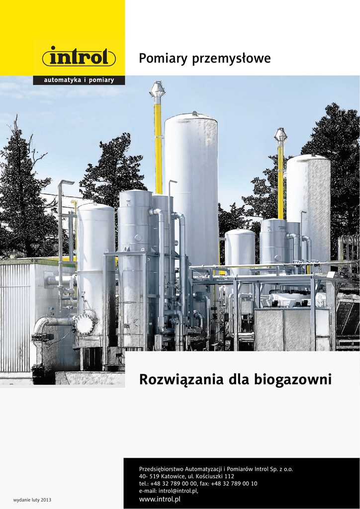 Pomiary przemysłowe Rozwiązania dla biogazowni Przedsiębiorstwo Automatyzacji i Pomiarów Introl Sp. z o.o. 40- 519 Katowice, ul. Kościuszki 112 tel.: +48 32 789 00 00, fax: +48 32 789 00 10 e-mail: [email protected], wydanie luty 2013 www.introl.pl Monitoring w biogazowni Dlaczego biogaz? W dobie oszczędności i poszukiwania nowych źródeł energii, zwłaszcza odnawialnych, wykorzystanie biogazu wydaje się szczególnie interesujące. Możliwość zutylizowania odpadów z produkcji spożywczej i zwierzęcej oraz odpadów komunalnych, przy jednoczesnym uzyskaniu energii elektrycznej i ciepła, kusi coraz większą liczbę użytkowników. Biogaz jest produktem beztlenowej fermentacji odpadów organicznych. Fermentacja odbywa się w specjalnie do tego celu zbudowanych komorach lub odpowiednio przygotowanych wysypiskach śmieci. Typowa instalacja biogazowa składa się ze źródła biogazu, układu odwadniania i oczyszczania (odsiarczania), zbiornika magazynowego, flary oraz jednostki kogeneracyjnej, czyli silników zasilanych biogazem, generatorów elektrycznych i wymienników ciepła. Celem budowy takiego układu jest pozbycie się odpadów, uzyskanie energii elektrycznej i ciepła ze spalenia paliwa gazowego, a także uzyskanie certyfikatów pochodzenia energii ze źródła odnawialnego. Dlaczego prowadzić pomiary? Aby przedsięwzięcie budowy i eksploatacji biogazowi nie okazało się źródłem problemów i nieprzewidzianych kosztów, warto wykorzystać nowoczesne urządzenia pomiarowe i doświadczenie ich producentów. Czasy prowadzenia skomplikowanych procesów „na oko” są już przeszłością. Istnieją trzy powody dla stosowania w instalacji biogazowej odpornej i wiarygodnej aparatury pomiarowej. Pierwszy to utrzymanie właściwego przebiegu procesu produkcji biogazu i uzyskanie przewidywalnej wydajności. Drugim powodem jest spełnienie wymogów przepisów związanych z możliwością uzyskania świadectw pochodzenia dla produkowanej energii. Trzecim jest bezpieczeństwo ludzi i całej instalacji. 01 Rozwiązania dla biogazowni www.introl.pl Monitoring w biogazowni Co należy mierzyć w biogazowni? Dla operatora istotne są informacje mówiące o bieżącym stanie instalacji, pozwalające na podjęcie odpowiednich działań np. dodanie substratu, wymianę filtrów itp. Parametry opisujące ten stan to: • ilości dostarczonych do fermentatora substratów (dla płynnych – objętość, dla stałych – masa), • poziom napełnienia fermentatora, • temperatura i pH fermentującej masy, • ilość produkowanego biogazu (często w rozbiciu na poszczególne fermentatory), • skład biogazu (zawartość metanu CH4, tlenu O2, wodoru H2, siarkowodoru H2S), • wilgotność biogazu i ilość kondensatu (poziom w zbiorniku kondensatu), • zawartość siarkowodoru H2S przed i za układem odsiarczania, • ilość biogazu płynącego do silników i do zbiornika magazynowego oraz spalanego w pochodni. Zgodnie z obowiązującymi przepisami, aby uzyskać certyfikaty pochodzenia wyprodukowanej energii (ze źródeł odnawialnych, z kogeneracji), należy mierzyć i dokumentować odpowiednie parametry procesu: • ilości energii chemicznej doprowadzanej z paliwem do jenostki kogeneracyjnej, • ilości wyprodukowanej energii elektrycznej i cieplnej. Instalacja biogazowa może stwarzać niebezpieczeństwo ze względu na obecność w niej gazów trujących (H2S, CO2) oraz możliwość powstania mieszaniny wybuchowej gazów (CH4 i O2). Dla zabezpieczenia pracowników oraz elementów instalacji stosowane są zazwyczaj: • stacjonarne układy detekcji metanu i siarkowodoru (wycieki, nieszczelności), • indywidualne detektory wielogazowe dla obsługi. www.introl.pl Rozwiązania dla biogazowni 02 Schemat biogazowni 03 Rozwiązania dla biogazowni www.introl.pl Schemat biogazowni www.introl.pl Rozwiązania dla biogazowni 04 Dedykowana aparatura kontrolno-pomiarowa Ilość substratu stałego – waga zbiornikowa, dozownik ślimakowy Ilość substratu płynnego – przepływomierz IMAG Przepływ i temperatura biogazu – przepływomierz ST51 BIOGAS Wypełnienie fermentatora – sonda radarowa VEGAPULS Przepływomierz elektromagnetyczny pozwala na pomiar ilości substratów płynnych dodawanych do procesu fermentacji. Informacja ta umożliwia właściwe prowadzenie procesu fermentacji i utrzymanie wymaganej wydajności produkcji biogazu. System ważenia i dozowania pozwala na podawanie do fermentatorów dokładnie określonej ilości substratu stałego. Informacja ta umożliwia właściwe prowadzenie procesu fermentacji i utrzymanie wymaganej wydajności produkcji biogazu. Przepływomierz termiczny ST51 jest urządzeniem specjalnie przygotowanym do pomiaru biogazu. Urządzenie jest stosowane do pomiaru wydajności fermentatorów, do pomiaru ilości biogazu spalanego w silnikach, przesyłanego do zbiornika magazynowego lub spalanego w pochodni. Sonda radarowa może być montowana od góry lub z boku fermentatora. Zapewnia ciągły monitoring poziomu wypełnienia, istotny zwłaszcza podczas napełniania fermentatora. Zalety rozwiązania: • możliwość zautomatyzowania procesu dozowania substratu • urządzenie nie zakłóca przepływu i nie powoduje dodatkowych spadków ciśnienia Zalety rozwiązania: • możliwość zautomatyzowania procesu dozowania substratu • dopasowanie układu do warunków i wymagań aplikacji Zalety rozwiązania: • dwa pomiary (przepływ i temperatura) za pomocą jednego urządzenia • łatwy montaż, bez konieczności przecinania rurociągu • kalibracja dla biogazu – wysoka dokładność pomiaru • odporność na wilgoć i zanieczyszczenia zawarte w biogazie • możliwość współpracy z analizatorem biogazu AwiFlex Zalety rozwiązania: • pomiar bezkontaktowy, niewrażliwy na obecność biogazu oraz zmiany gęstości substratu • łatwość dopasowania miejsca i sposobu montażu do konstrukcji fermentatora Ilość energii chemicznej biogazu – 