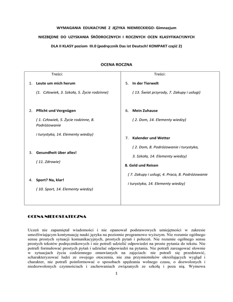 WYMAGANIA EDUKACYJNE Z JĘZYKA NIEMIECKIEGO- Gimnazjum NIEZBĘDNE DO UZYSKANIA ŚRÓDROCZNYCH I ROCZNYCH OCEN KLASYFIKACYJNYCH DLA II KLASY poziom III.0 (podręcznik Das ist Deutsch! KOMPAKT część 2) OCENA ROCZNA Treści: Treści: 1. Leute um mich herum 5. In der Tierwelt (1. Człowiek, 3. Szkoła, 5. Życie rodzinne) ( 13. Świat przyrody, 7. Zakupy i usługi) 2. Pflicht und Vergnügen 6. Mein Zuhause ( 1. Człowiek, 5. Życie rodzinne, 8. Podróżowanie ( 2. Dom, 14. Elementy wiedzy) i turystyka, 14. Elementy wiedzy) 7. Kalender und Wetter ( 2. Dom, 8. Podróżowanie i turystyka, 3. Gesundheit über alles! 3. Szkoła, 14. Elementy wiedzy) ( 11. Zdrowie) 8. Geld und Reisen ( 7. Zakupy i usługi, 4. Praca, 8. Podróżowanie 4. Sport? Na, klar! i turystyka, 14. Elementy wiedzy) ( 10. Sport, 14. Elementy wiedzy) OCENA NIEDOSTATECZNA Uczeń nie zapamiętał wiadomości i nie opanował podstawowych umiejętności w zakresie umożliwiającym kontynuację nauki języka na poziomie programowo wyższym. Nie rozumie ogólnego sensu prostych sytuacji komunikacyjnych, prostych pytań i poleceń. Nie rozumie ogólnego sensu prostych tekstów podręcznikowych i nie potrafi udzielić odpowiedzi na proste pytania do tekstu. Nie potrafi formułować prostych pytań i udzielać odpowiedzi na pytania. Nie potrafi zareagować słownie w sytuacjach życia codziennego omawianych na zajęciach: nie potrafi się przedstawić, scharakteryzować ludzi ze swojego otoczenia, nie zna przymiotników określających wygląd i charakter, nie potrafi poinformować o sposobach spędzania wolnego czasu, o dozwolonych i niedozwolonych czynnościach i zachowaniach związanych ze szkołą i poza nią. Wymowa 1 uniemożliwiająca zrozumienie, brak podstawowego słownictwa i brak znajomości podstawowych struktur gramatycznych. Nie potrafi napisać krótkiego tekstu. OCENA DOPUSZCZAJĄCA Uczeń słabo zna i z trudem podaje słownictwo związane z: danymi osobowymi, określeniami wyglądu i charakteru, sposobami i formami spędzania wolnego czasu, dozwolonymi i niedozwolonymi czynnościami i zachowaniami związanymi ze szkołą, zaproszeniami, czynnościami domowymi, określeniami czasu, częstotliwości i długości trwania czynności, czynnościami dnia codziennego, miejscami spędzania wakacji, nazwami częściami ciała i organów, nazwami chorób, dolegliwości, urazów, samopoczuciem, uczuciami i emocjami, dyscyplinami sportu, miejscami uprawiania sportu, określeniami związanymi z aktywnością ruchową, nazwami popularnych zwierząt oraz ich części ciała, cech i środowiska, czynności związanych z opieką nad zwierzętami domowymi, akcesoriami, miarami i wagami, lokalizacją w budynku, nazwami miejsc i pomieszczeń, nazwami mebli i sprzętów domowych, określeniami położenia, nazwami miejsc i budynków w mieście, nazwami infrastruktury, nazwami pomieszczeń w szkole, opisem drogi, nazywaniem źródeł dochodów rówieśników w krajów DACHL, sposobami zarządzania pieniędzmi, rodzajami biletów i kart, cenami i zniżkami. Uczeń słabo zna zasady odmiany czasowników: sein, haben, oraz czasowników modalnych i czasowników ze zmienną samogłoską rdzenną. Uczeń popełnia liczne błędy przy odmianie czasowników sein i haben w czasie przeszłym prostym Präteritum, przy tworzeniu czasu przeszłego złożonego PERFEKT z czasownikami posiłkowymi sein i haben. Uczeń ma trudności z odmianą rodzajników (der, die, das, ein, eine, kein, keine) i zaimków dzierżawczych w mianowniku, celowniku i bierniku, użyciem form zaimka zwrotnego, zastosowaniem spójnika dass, tworzeniem form trybu rozkazującego i rzeczowników odczasownikowych, nie potrafi utworzyć form czasowników modalnych w czasie przeszłym prostym Präteritum; uczeń popełnia liczne błędy przy stosowaniu przyimków określających położenie (wo?) z celownikiem oraz przyimków określających kierunek i orientację w terenie (wohin?) z biernikiem; ma trudności z zastosowaniem czasowników z przyimkami w bierniku i celowniku oraz użyciem spójnika wenn w zdaniu; słabo rozpoznaje właściwy szyk zdania po spójnikach: und, aber, oder, deshalb, trotzdem, außerdem. Uczeń nie rozpoznaje prawidłowym form potwierdzania i zaprzeczania. Uczeń ma duże trudności ze zrozumieniem tekstu pisanego i znalezieniem w tekście określonych informacji; ma również duże trudności ze zrozumieniem wypowiedzi ze słuchu i znalezieniem w tekście określonych informacji; popełnia liczne błędy, przedstawiając fakty związane z w/w słownictwem; z trudnością tworzy wypowiedź pisemną: notatkę; opis, list, ogłoszenie lub zaproszenie; popełniając liczne błędy. OCENA DOSTATECZNA Uczeń częściowo zna i z pomocą nauczyciela umie podać słownictwo związane z: danymi osobowymi, określeniami wyglądu i charakteru, sposobami i formami spędzania wolnego czasu, dozwolonymi i niedozwolonymi czynnościami i zachowaniami związanymi ze szkołą, zaproszeniami, czynnościami domowymi, określeniami czasu, częstotliwości i długości trwania czynności, czynnościami dnia codziennego, miejscami spędzania wakacji, nazwami częściami ciała i organów, nazwami chorób, dolegliwości, urazów, samopoczuciem, uczuciami i emocjami, dyscyplinami sportu, miejscami uprawiania sportu, określeniami związanymi z aktywnością ruchową, nazwami popularnych zwierząt oraz ich części ciała, cech i środowiska, czynności związanych z opieką nad zwierzętami domowymi, akcesoriami, miarami i wagami, lokalizacją w budynku, nazwami miejsc i pomieszczeń, nazwami mebli i sprzętów domowych, określeniami położenia, nazwami miejsc i budynków w mieście, nazwami infrastruktury, nazwami pomieszczeń w szkole, opisem drogi, nazywaniem źródeł dochodów rówieśników w krajów DACHL, sposobami zarządzania pieniędzmi, rodzajami biletów i kart, cenami i zniżkami. Uczeń częściowo zna zasady odmiany czasowników: 2 sein, haben, oraz czasowników mo