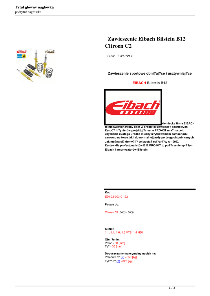 Tytuł główny nagłówka podtytuł nagłówka Zawieszenie Eibach Bilstein B12 Citroen C2 Cena: 2 499.99 zł Zawieszenie sportowe obni?aj?ce i usztywniaj?ce EIBACH Bilstein B12 Niemiecka firma EIBACH to niekwestionowany lider w produkcji zawiesze? sportowych. Zespó? in?ynierów projektuj?c serie PRO-KIT mia? na celu uzyskanie z?otego ?rodka miedzy u?ytkowaniem samochodu zarówno na torze jak i do normalnej jazdy po drogach publicznych. Jak mo?na si? domy?li? cel zosta? osi?gni?ty w 100%. Zestaw dla profesjonalistów B12 PRO-KIT to po??czenie spr??yn Eibach i amortyzatorów Bilstein. Kod: E90-22-003-01-22 Pasuje do: Citroen C2 2003 - 2009 Silniki: 1.1, 1.4, 1.6, 1.6 VTS, 1.4 HDI Obni?enie: Przód - 30 [mm] Ty? - 30 [mm] Dopuszczalny maksymalny nacisk na: Przedni? o? (?) - 850 [kg] Tyln? o? (?) - 820 [kg] 1/3 Tytuł główny nagłówka podtytuł nagłówka Zestaw zawiera: - 4x spr??yna Pro-kit - 4x Amortyzator Bilstein - Dowód zakupu - Gwarancja producenta 24 miesi?ce Uwagi: - Dobieraj?c produkt nale?y opiera? si? na danych w certyfikacie TÜV lub dokumencie ABE. Prosz? przed monta?em porówna? oznaczenia na otrzymanym produkcie z oznaczeniami zawartymi w TÜV lub dokumencie ABE (do??czane do paczek lub dost?pne do pobrania na www.eibach.com) W przypadku stwierdzenia rozbie?no?ci zestawu nie nale?y montowa? - prosimy w takim wypadku o kontakt ze sprzedawc?. Monta? powinien by? przeprowadzany w specjalistycznym warsztacie, posiadaj?cym wykwalifikowanych pracowników oraz odpowiednie narz?dzia. Pozycja monta?u (góra-dó?) oznaczona jest poprzez nadruk - u?o?enie tekstu sugeruje prawid?ow? pozycj?. Po monta?u spr??yn / elementów zawieszenia nale?y sprawdzi? geometri? kó?. Je?li oryginalne amortyzatory s? mocno zu?yte, zaleca si? za?o?enie nowych - standardowych lub sportowych. W przypadku spr??yn serii Sportline zalecamy zakup sportowych amortyzatorów, np. Bilstein B8. Wszystkie dopuszczalne przez producenta kombinacje ko?o / opona s? mo?liwe do zastosowania po za?o?eniu spr??yn. W zale?no?ci od wersji silnikowej, skrzyni biegów, wyposa?enia i tolerancji producenta auta, warto?ci obni?enia mog? odbiega? o par? mm od warto?ci wskazanych w niniejszym katalogu. Warto?? obni?enia b?dzie stosunkowo ni?sza w przypadku seryjnego (fabrycznego) obni?enia. Zastosowanie naszych produktów odnosi si? do seryjnych pojazdów. W przypadku modyfikacji przeprowadzonych w aucie lub wyposa?enia dodatkowego (dotyczy to tak?e produktów oryginalnych, oferowanych opcjonalnie przez producenta auta!) takiego jak wzmocniony uk?ad hamulcowy (nr tarcze ceramiczne), mocowanie kó? na jeden, centralny otwór, zawieszenie sportowe, instalacja LPG itp. - mo?liwe jest, ?e monta? naszych produktów nie b?dzie mo?liwy. Wszystkie podane dane odnosz? si? do fabrycznych, nowych pojazdów. Punkty pomiaru: linia prosta ??cz?ca ?rodek piasty z dolnym kantem b?otnika. S? to warto?ci przybli?one - mog? si? ró?ni? w zale?no?ci od pojazdu. - Bez systemu samopoziomowania (nivo) - Poza modelami z nap?dem 4x4 (4WD) - Na skutek zastosowania gazowych amortyzatorów serii B6 / B8 warto?? obni?enia mo?e si? nieznacznie ró?ni? - W przypadku zainteresowania cz??ciami zamiennymi prosimy o kontakt. Prosimy uprzednio przygotowa? dane auta, numer cz??ci i dokument zakupu Firma Tomas Tuning jest dystrybutorem firmy Eibach. Kupuj?c w naszym sklepie masz pewno??, ?e otrzymasz produkt zgodny z opisem, z legalnej dystrybucji, ca?kowicie nowy oraz na gwarancji. Monta? powinien by? przeprowadzany w specjalistycznym warsztacie. Pozycja monta?u (góra-dó?) oznaczona jest poprzez nadruk - u?o?enie tekstu sugeruje prawid?ow? pozycj?. Po monta?u spr??yn/elementów zawieszenia, nale?y sprawdzi? geometri? kó?. Je?li oryginalne amortyzatory s? mocno zu?yte, zaleca si? za?o?enie nowych standardowych, lub sportowych. Wszystkie dopuszczalne przez producenta kombinacje ko?o / opona s? mo?liwe do zastosowania po 2/3 Tytuł główny nagłówka podtytuł nagłówka za?o?eniu spr??yn. Dobieraj?c produkt nale?y opiera? si? na danych w certyfikacie TÜV lub dokumencie ABE. Prosz? przed monta?em porówna? oznaczenia na otrzymanym produkcie z oznaczeniami zawartymi w TÜV lub dokumencie ABE (do??czane do paczek lub dost?pne do pobrania na www.eibach.com). W przypadku stwierdzenia rozbie?no?ci zestawu nie nale?y montowa? - prosimy w takim wypadku o kontakt ze sprzedawc?. W zale?no?ci od wersji silnikowej, skrzyni biegów, wyposa?enia i tolerancji producenta auta, warto?ci obni?enia mog? odbiega? o par? mm od warto?ci wskazanych w niniejszym katalogu. Warto?? obni?enia b?dzie stosunkowo ni?sza w przypadku seryjnego (fabrycznego) obni?enia(np. zawieszenie mtechnik, s-line itp.). Wszystkie podane dane odnosz? si? do fabrycznych, nowych pojazdów. Zastosowanie naszych produktów odnosi si? do seryjnych pojazdów. Wszystkie spr??yny EIBACH posiadaj? certyfikat TUV. Powy?sze zdj?cia s? przyk?adowe. Nissan 350Z 2002 - 2008 3/3 Powered by TCPDF (www.tcpdf.org)