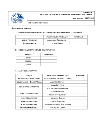 GIMNAZJUM W ZESPOLE SZKÓŁ PUBLICZNYCH IM. JANA PAWŁA II W ŁAZACH ROK SZKOLNY 2015/2016 IMIĘ I NAZWISKO UCZNIA: DEKLARACJA WYBORU: 1. DRUGIEGO OBOWIĄZKOWEGO JĘZYKA OBCEGO (MOŻNA WYBRAĆ TYLKO JEDEN) NAUCZYCIEL PROWADZĄCY JĘZYK FRANCUSKI AGNIESZKA DZIKIEWICZ JĘZYK NIEMIECKI LUCYNA BAJAK WYBIERAM 2. NIEOBOWIĄZKOWYCH ZAJĘĆ EDUKACYJNYCH ZAJĘCIA WYBIERAM ETYKA RELIGIA ŻADEN 3. ZAJĘĆ DODATKOWYCH ZAJĘCIA NAUCZYCIEL PROWADZĄCY WOLONTARIAT KLUB OŚMIU MAŁGORZATA KOWALSKA - DYMEK WOLONTARIAT – DOBRA WOLA ANDRZEJ HOFMAN ANNA SIBERSKA DORADZTWO ZAWODOWE KATARZYNA SIEŃKOWSKA KOŁO POLONISTYCZNE ANNA ŁUPIŃSKA KRZYSZTOF ŁUPIŃSKI KOŁO REDAKCYJNE URSZULA BULICZ KOŁO HISTORYCZNE ŁUKASZ SITKIEWICZ KOŁO FILOZOFICZNE JOANNA FERLIAN-TCHÓRZEWSKA EDUKACJA MEDIALNA WALDEMAR DYMEK WYBIERAM ZAJĘCIA NAUCZYCIEL PROWADZĄCY KOŁO MATEMATYCZNE WYBIERAM ANNA RUSEK ALDONA DUSZA KOŁO JĘZYKA ANGIELSKIEGO MAGDALENA SOKOŁOWSKA KAMIL JABBAR KOŁO JĘZYKA FRANCUSKIEGO AGNIESZKA DZIKIEWICZ KOŁO JĘZYKA NIEMIECKIEGO LUCYNA BAJAK KOŁO INFORMATYCZNOROBOTYCZNE JACEK TUZINEK KOŁO FOTOGRAFICZNE JOANNA FERLIAN-TCHÓRZEWSKA KOŁO PLASTYCZNE AGNIESZKA TYCZYŃSKA KOŁO TEOLOGICZNE WALDEMAR DYMEK KOŁO BIBLIJNE DOROTA TABAKA CHÓR OLIVIA KACZYŃSKA MACIEJ KRAKOWSKI SKS - CHŁOPCÓW ŁUKASZ TOPYŁA SKS - DZIEWCZĄT ŁUKASZ TOPYŁA TENIS STOŁOWY ANDRZEJ HOFMAN KLUB FILMOWY KATARZYNA SIEŃKOWSKA KLUB MŁODEGO PODRÓŻNIKA MACIEJ OJDANA KLUB EWOLUCJONISTÓW ANNA ZAHORBEŃSKA TERAPIA PEDAGOGICZNA ANNA SIBERSKA ZAJĘCIA DYDAKTYCZNOWYRÓWNAWCZE Z JĘZYKA POLSKIEGO ANNA ŁUPIŃSKA ZAJĘCIA DYDAKTYCZNOWYRÓWNAWCZE Z MATEMATYKI KRZYSZTOF ŁUPIŃSKI ANNA RUSEK ALDONA DUSZA UWAGI ………………….……………………………………………………………………………………………………… ………………….……………………………………………………………………………………………………… ………………….……………………………………………………………………………………………………… ………………….……………………………………………………………………………………………………… …………………………… …………………………………… ………………………………… DATA PODPIS UCZNIA PODPIS RODZICA